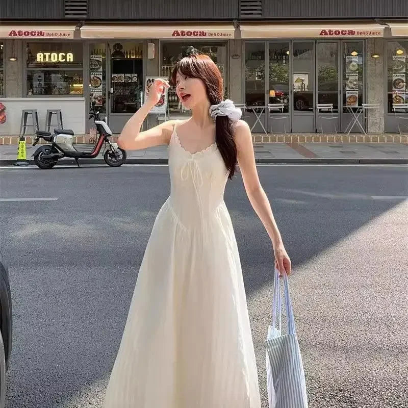Bxoxo French Gentle Style Lace Trim V-Neck White Strapless Dress Women's Waist-Cinching Vacation Beach A- Line Midi Dress