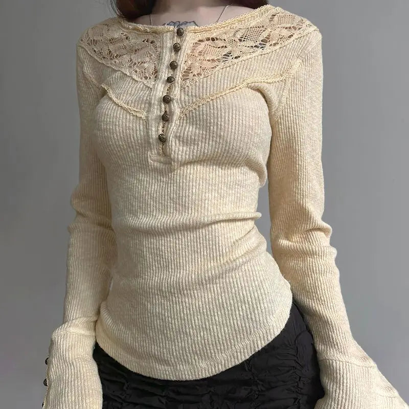 Bxoxo French Lace Splicing Half-open Buckle Knitted Long-sleeved T-shirt for Women Slim Temperament Base Top
