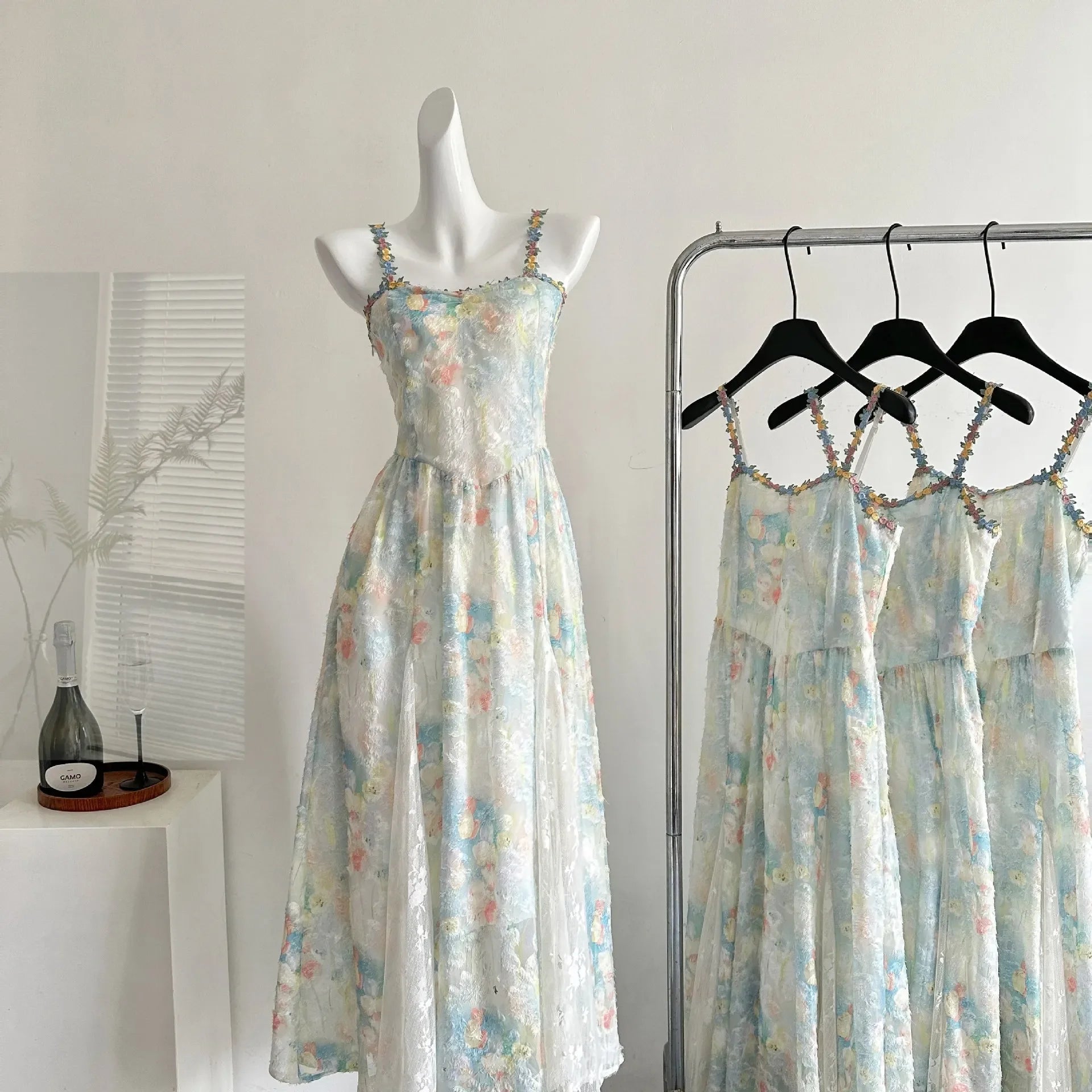 Bxoxo French Style Floral Print Summer Long Dress Sleeveless Princess Sleeve Polo Collar Regular Waistline Spring Outing Travel Clothe