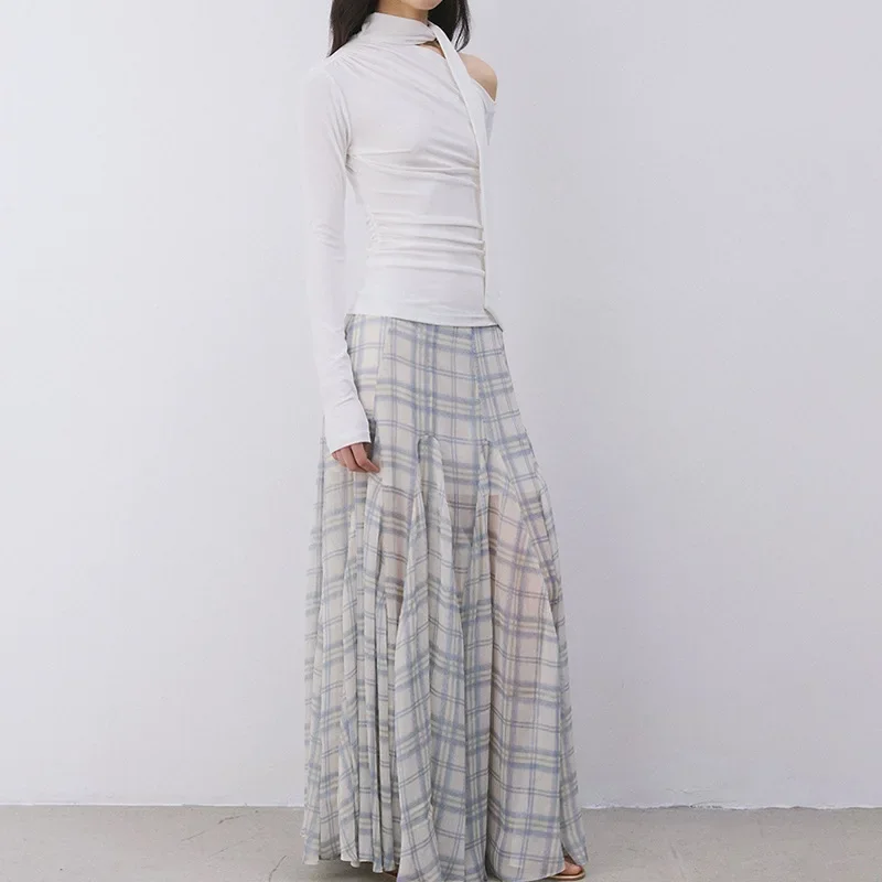 Bxoxo Gentle Checkered Fish Tail Skirt Semi-Transparent Soft Tulle Design Asymmetrical Half-length Polyester Fiber Grid Pattern