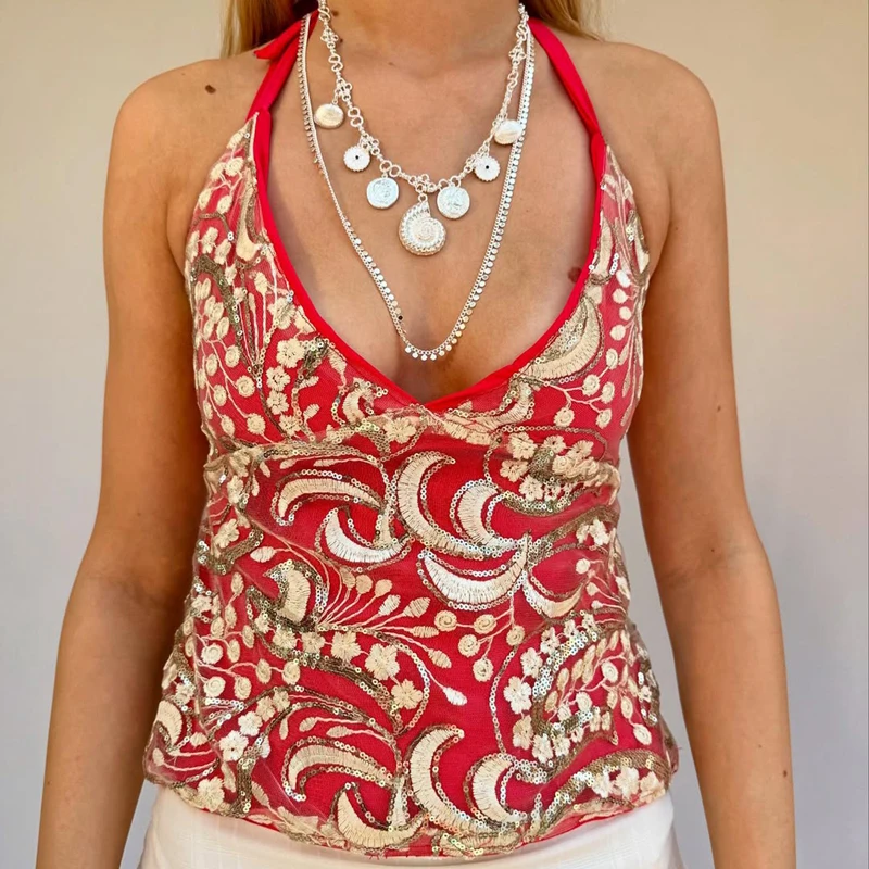 BXOXO Glitter Beaded Vest Sequin Sparkly Backless Tie Up Halter Tops Boho Beach Vacation Crop Top Women Y2k Coquette Camis