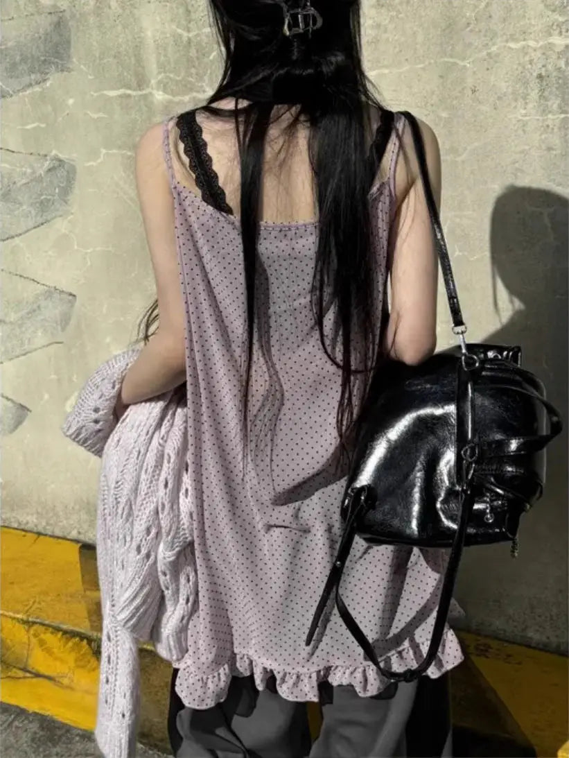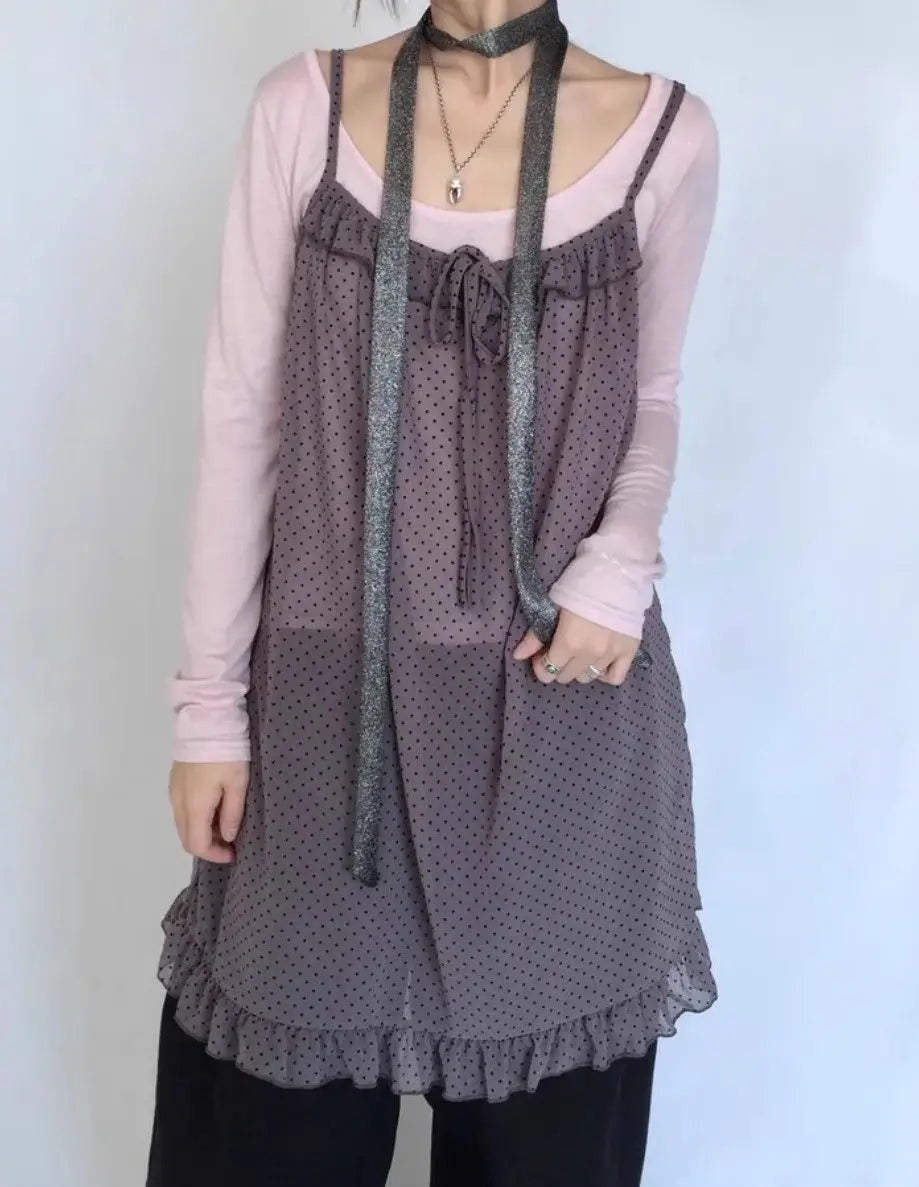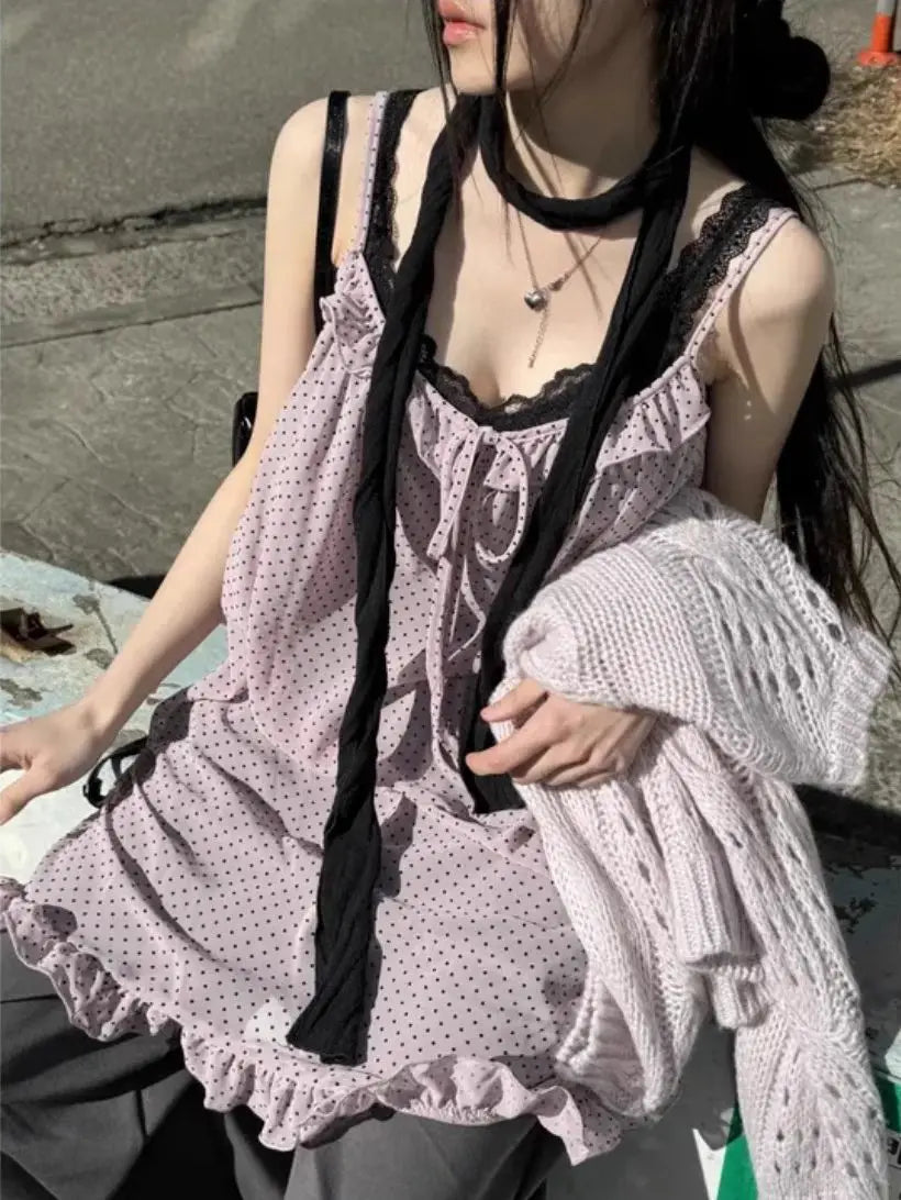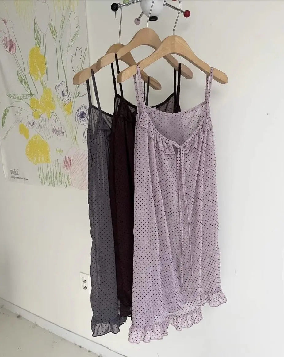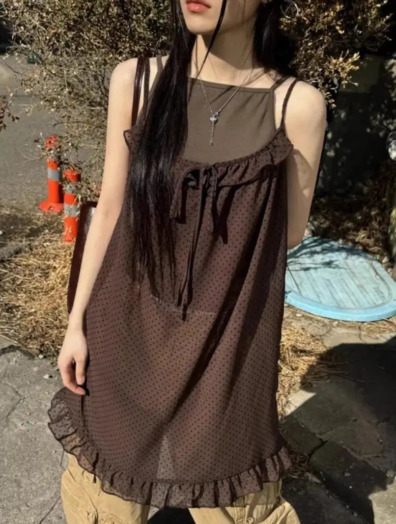 Bxoxo Harajuku Japanese Style Tank Tops Women Vintage Polka Dot Ruffle Sleeveless Mesh Dress Sexy See-through Layered Wear