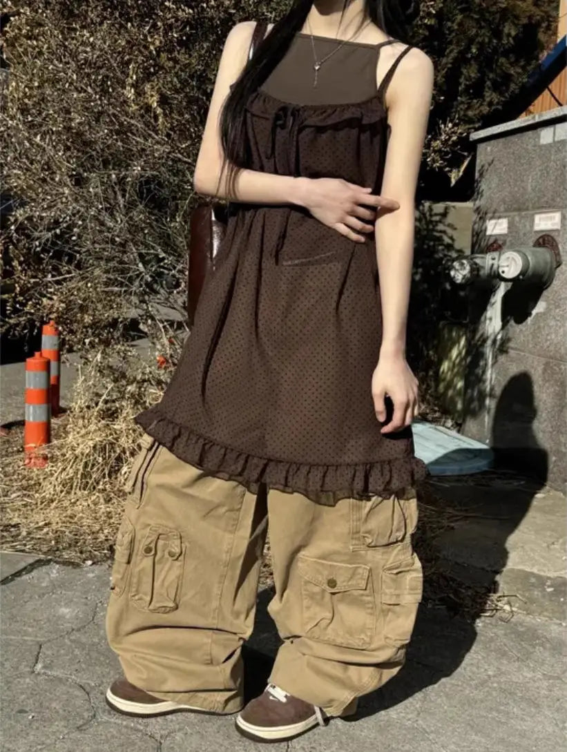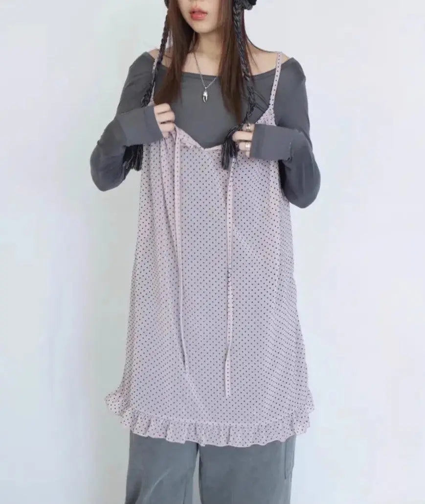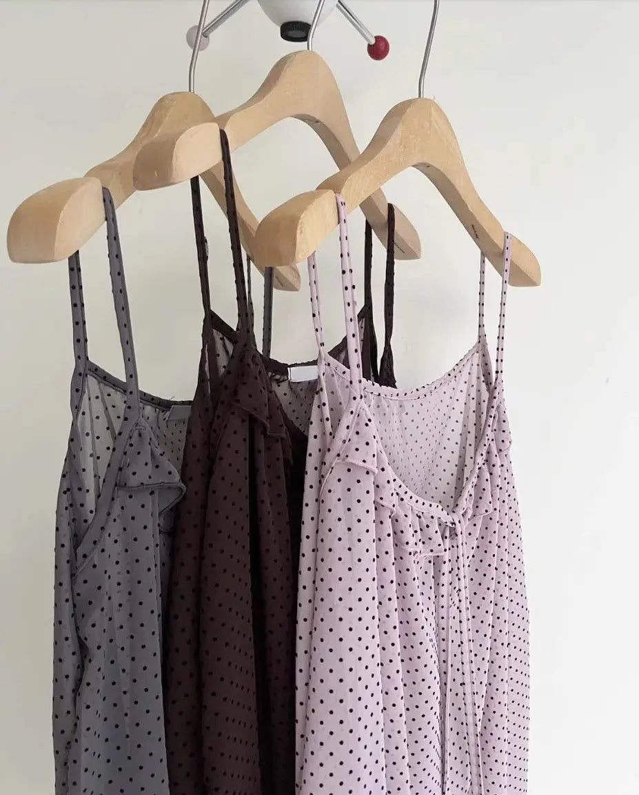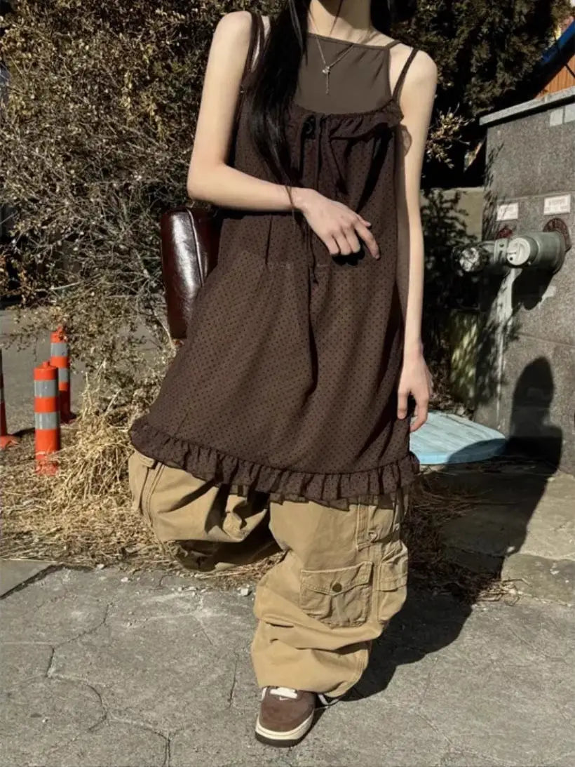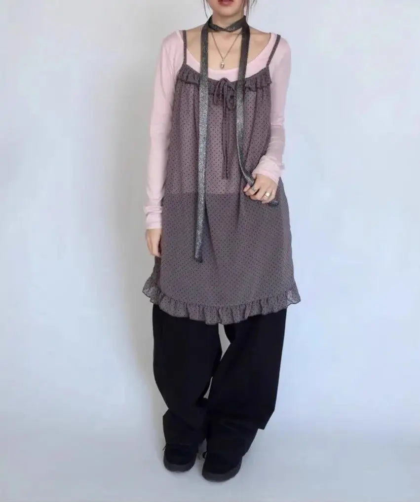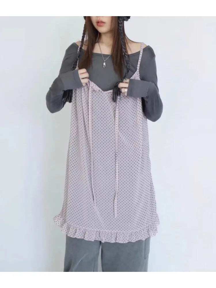 Bxoxo Harajuku Japanese Style Tank Tops Women Vintage Polka Dot Ruffle Sleeveless Mesh Dress Sexy See-through Layered Wear