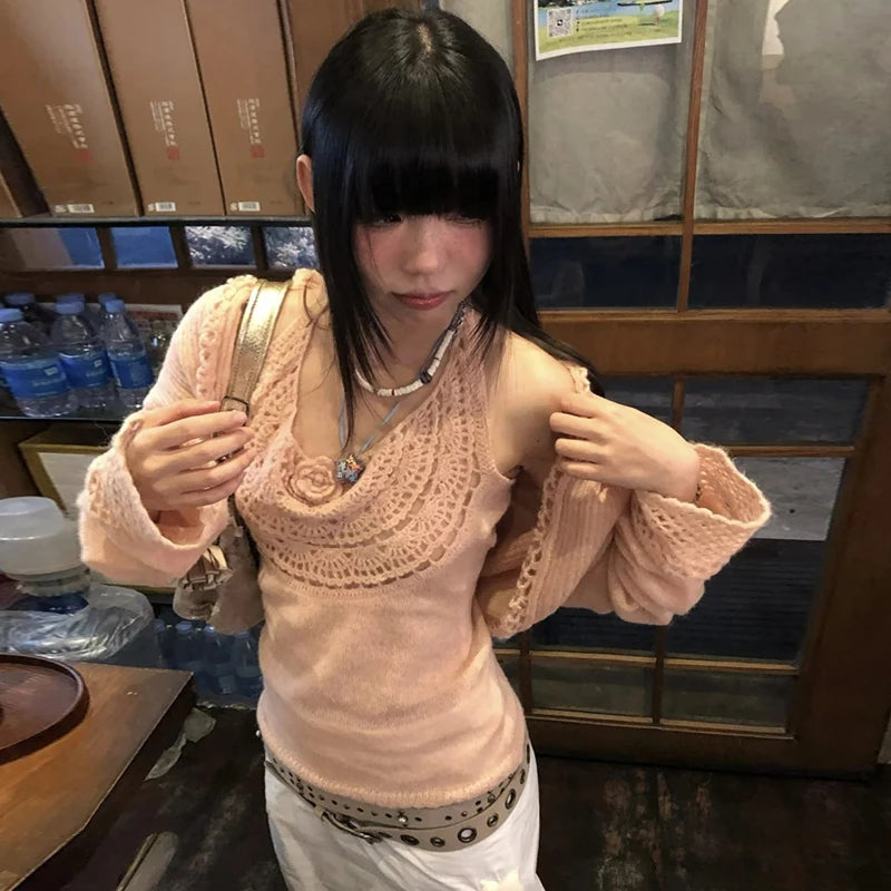 BXOXO Harajuku Knitted Two Pieces Tops Hollow Out Floral Tank Tops +smock Y2k Fairycore T Shirts Women 2000s Japanese Tee Top