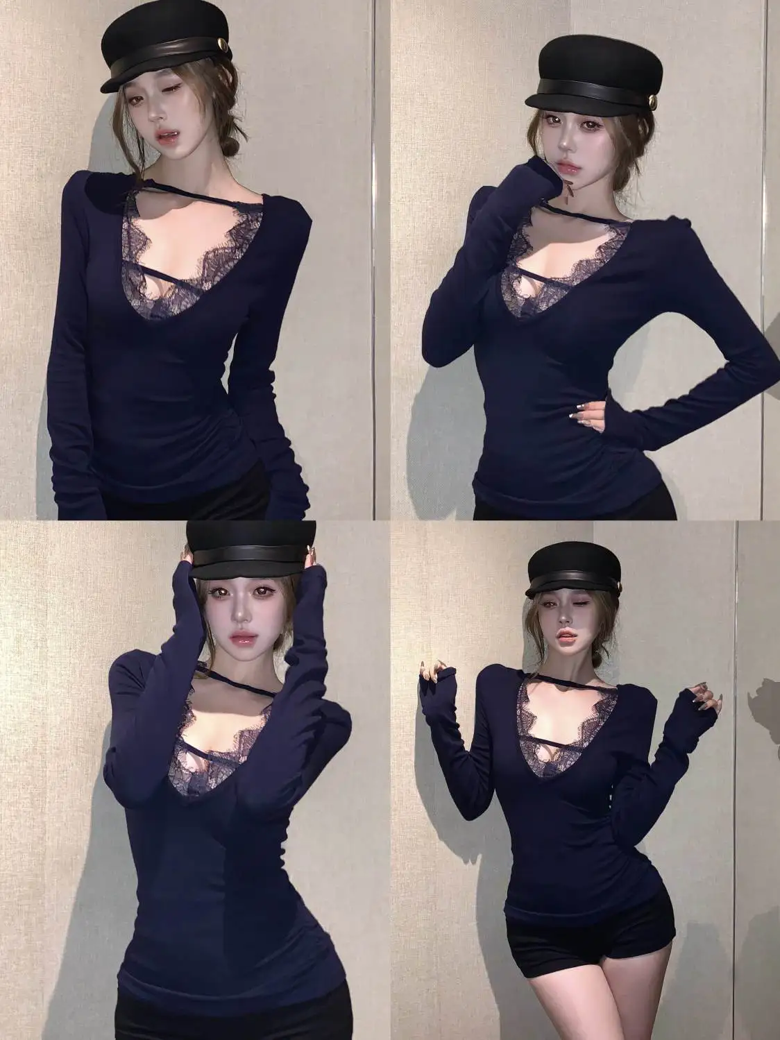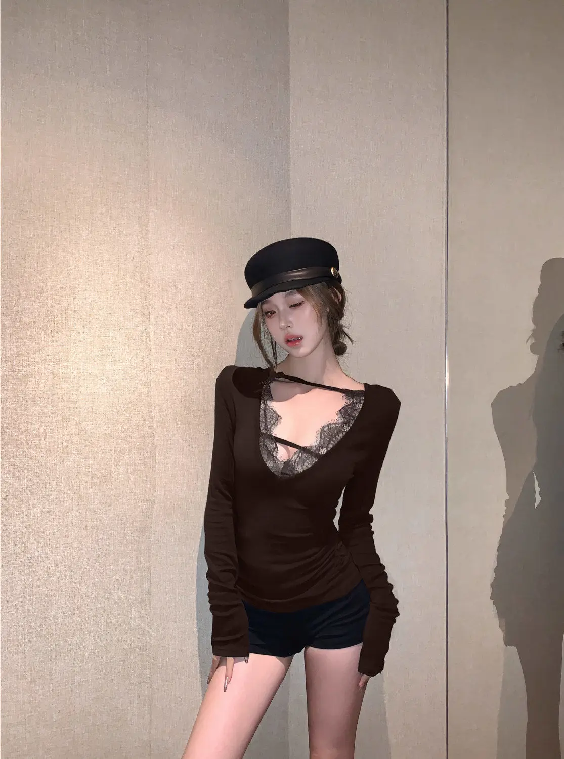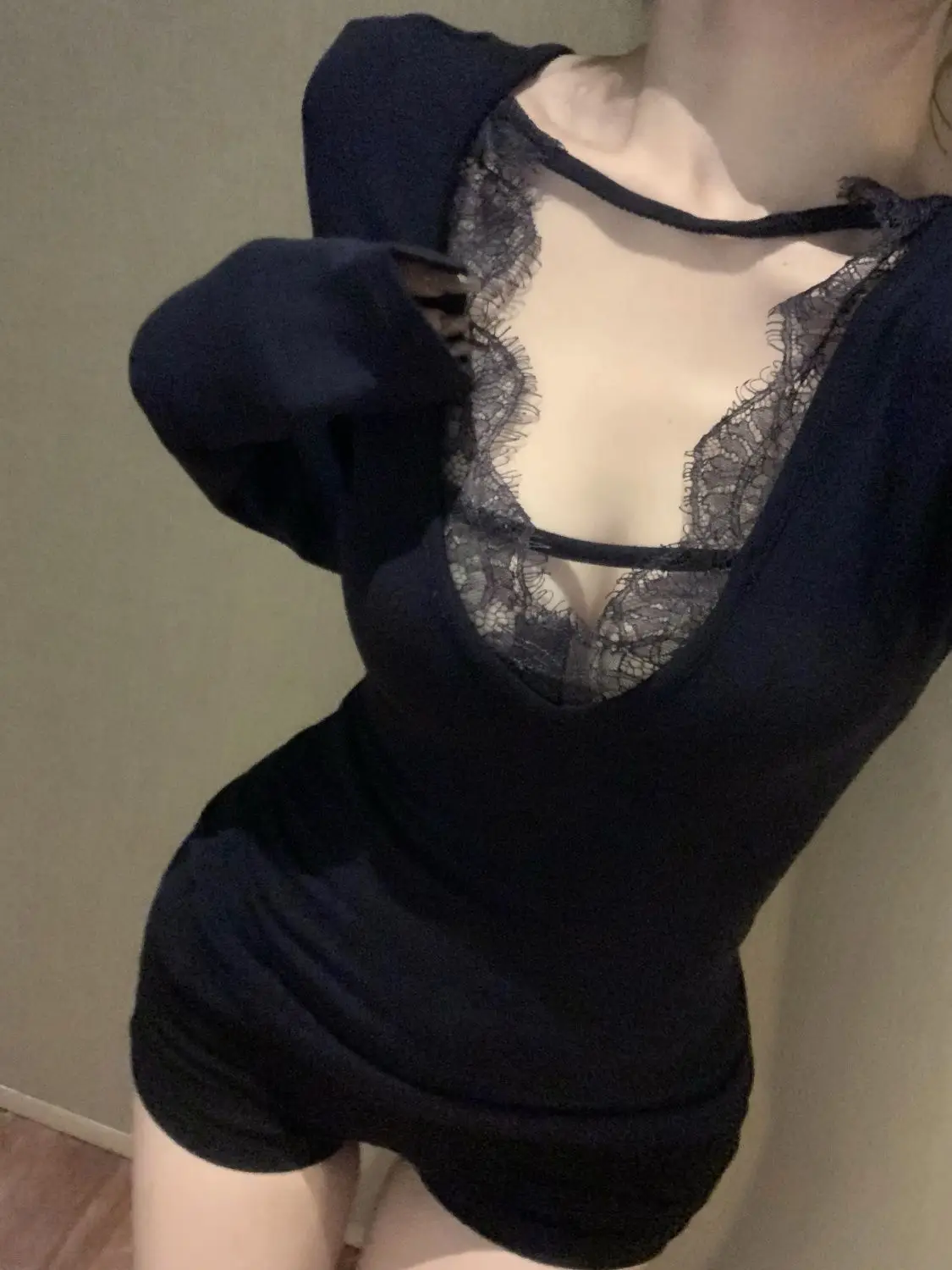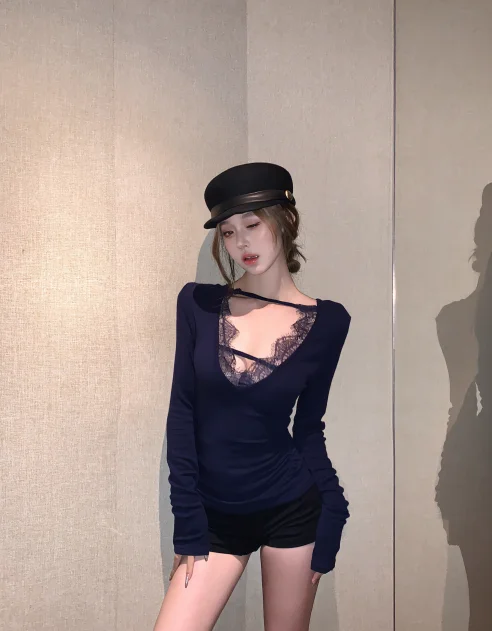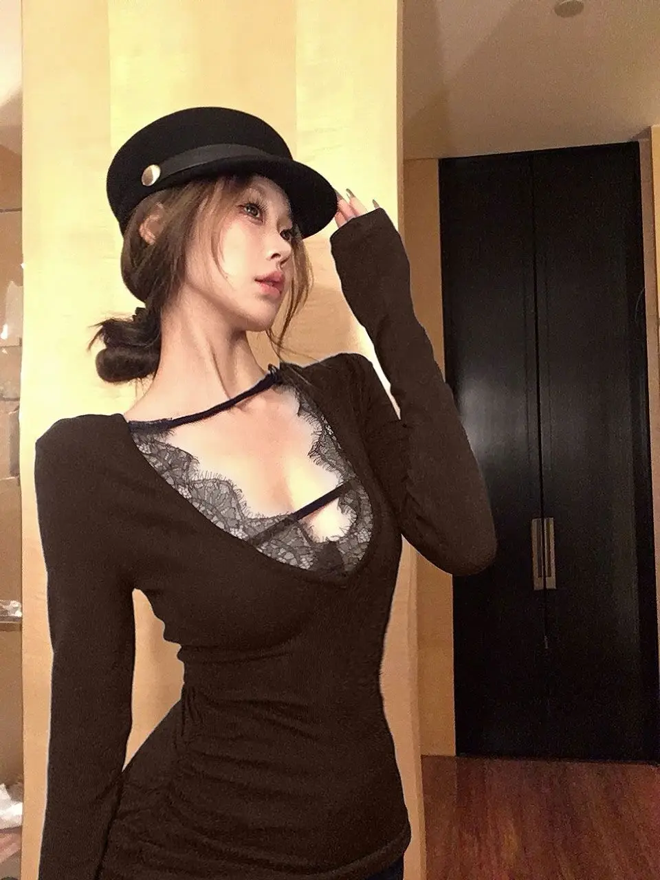 Bxoxo High End Backless Front and Back Lace Patchwork Long Sleeved T-shirt for Women Wearing Tight Fitting and Pure Desire Base Top