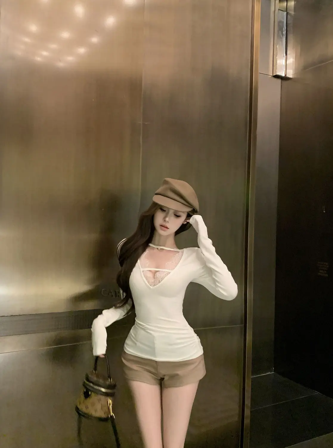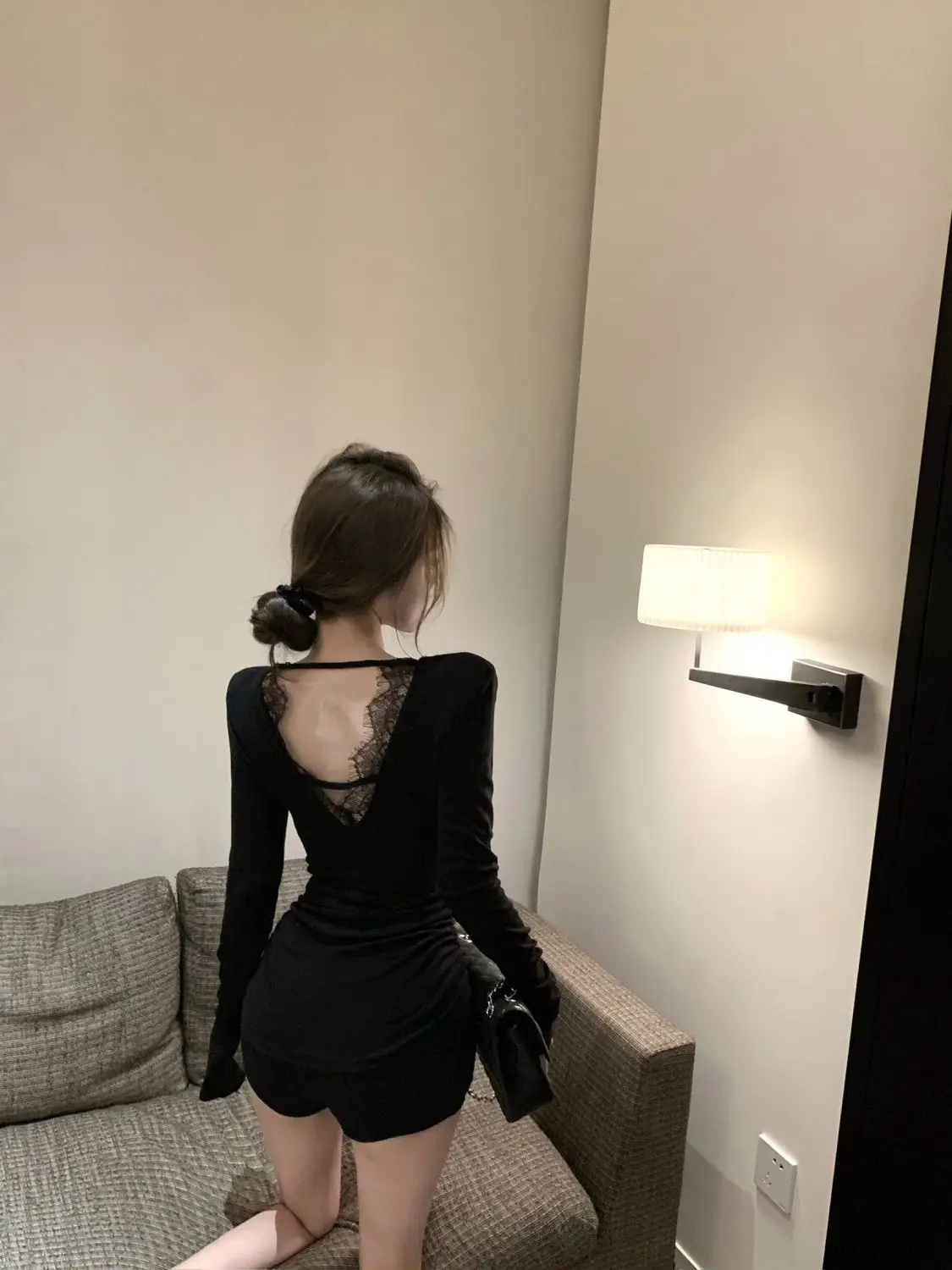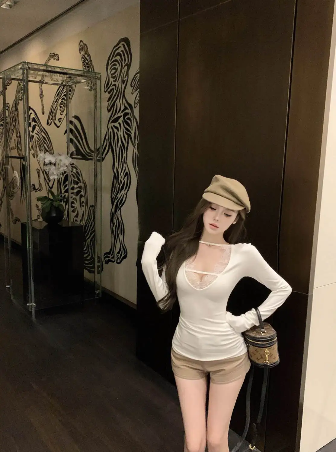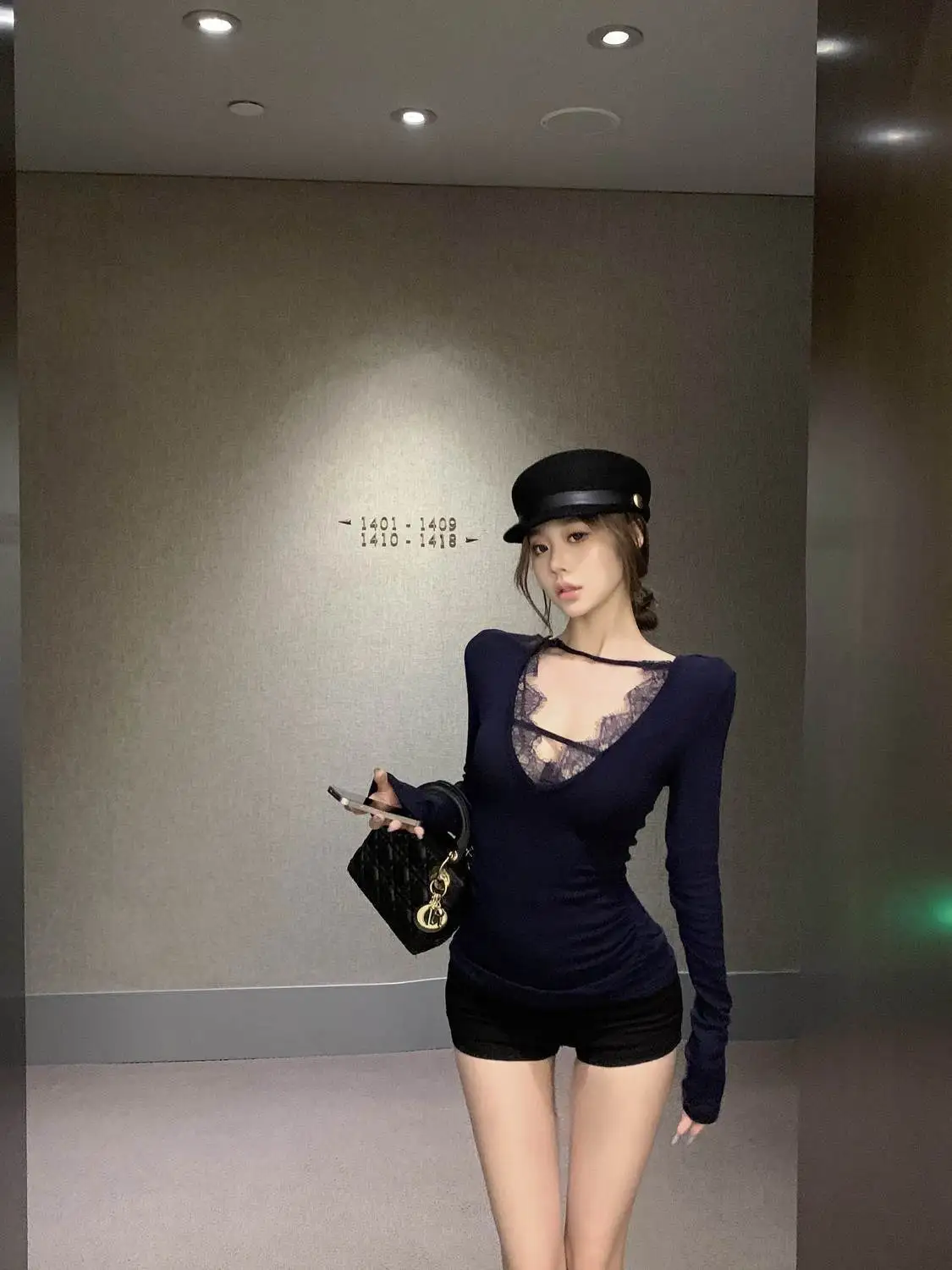 Bxoxo High End Backless Front and Back Lace Patchwork Long Sleeved T-shirt for Women Wearing Tight Fitting and Pure Desire Base Top