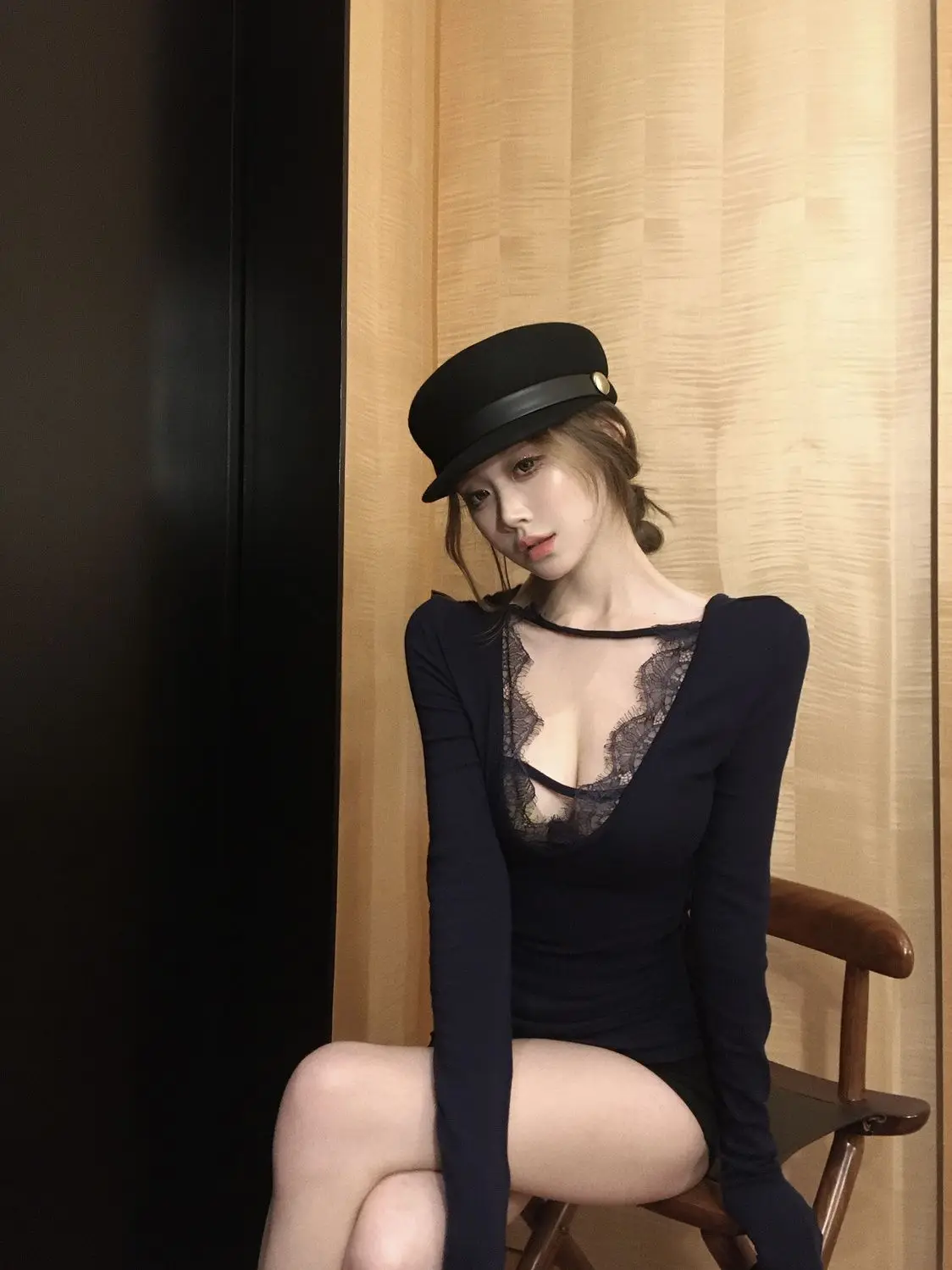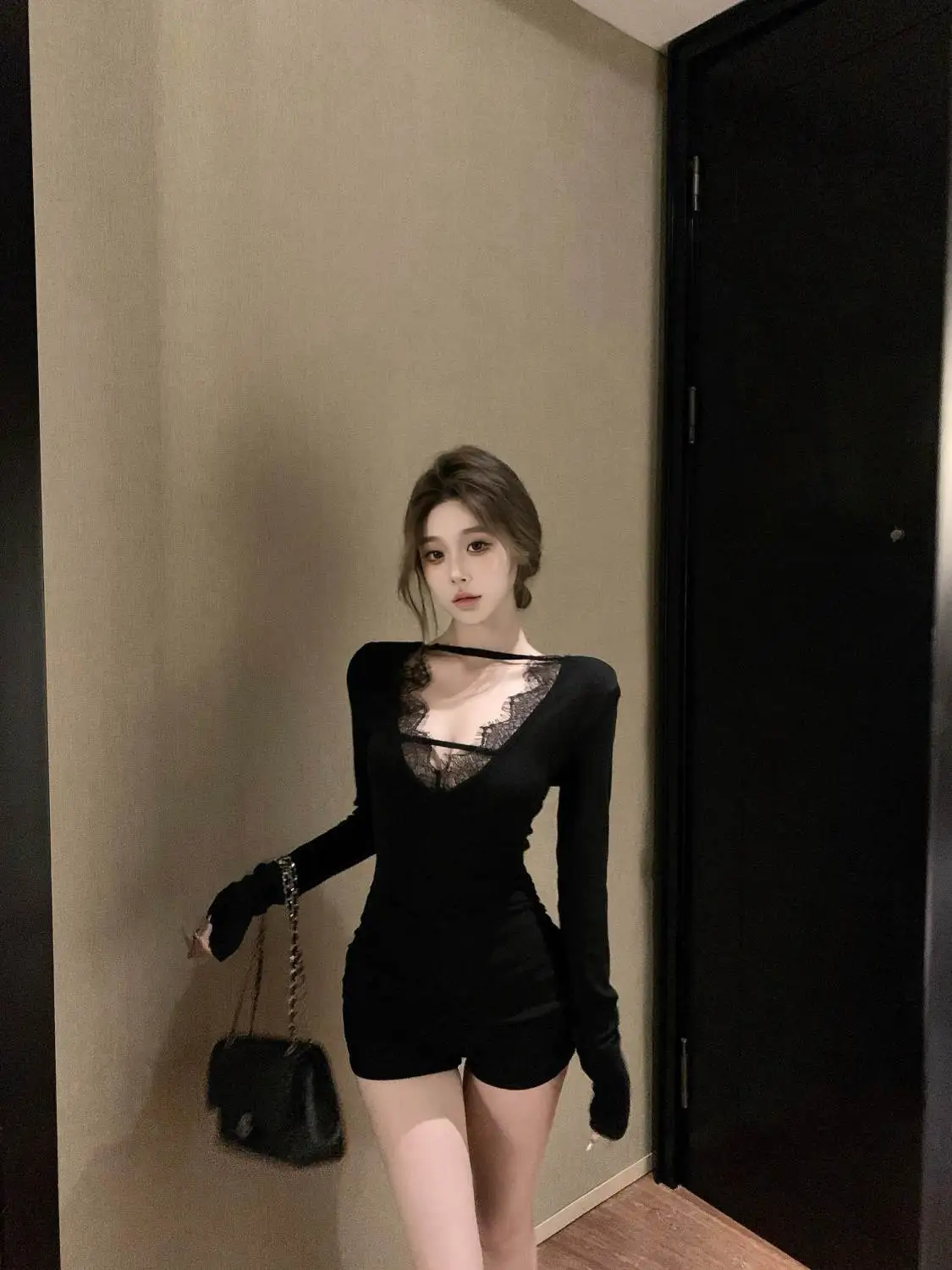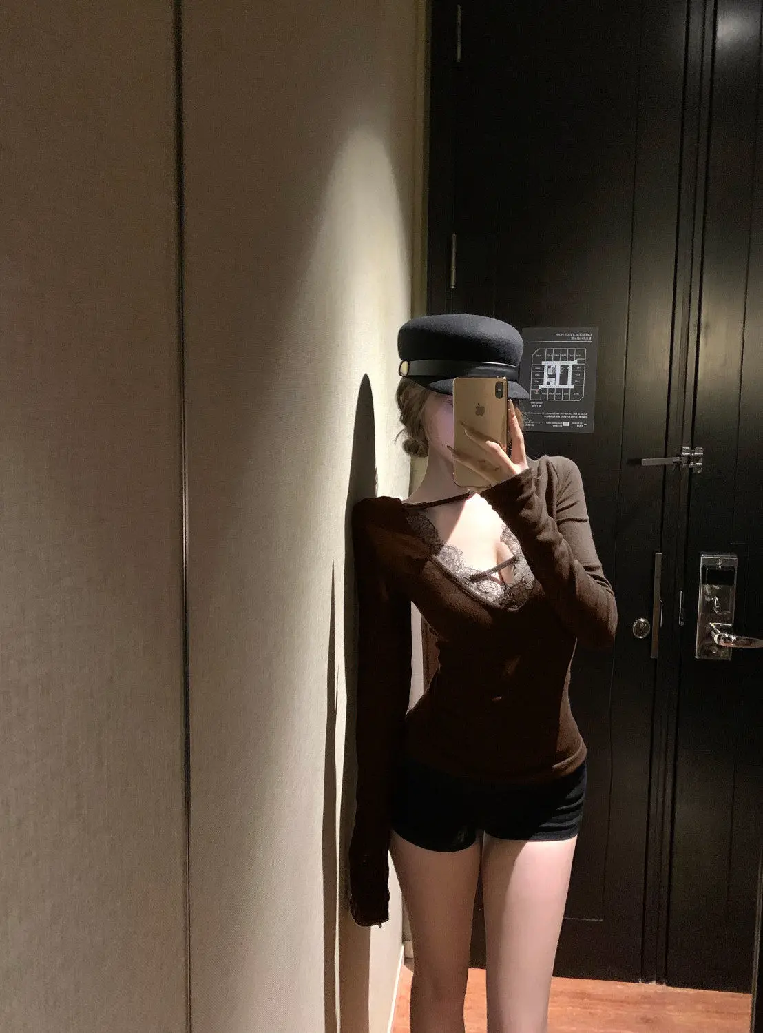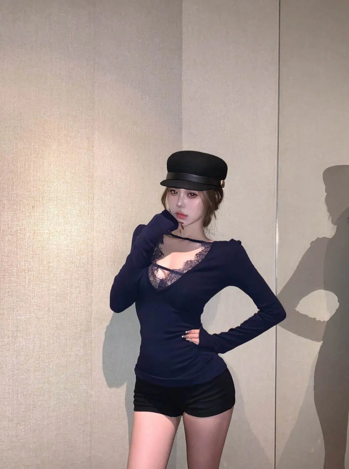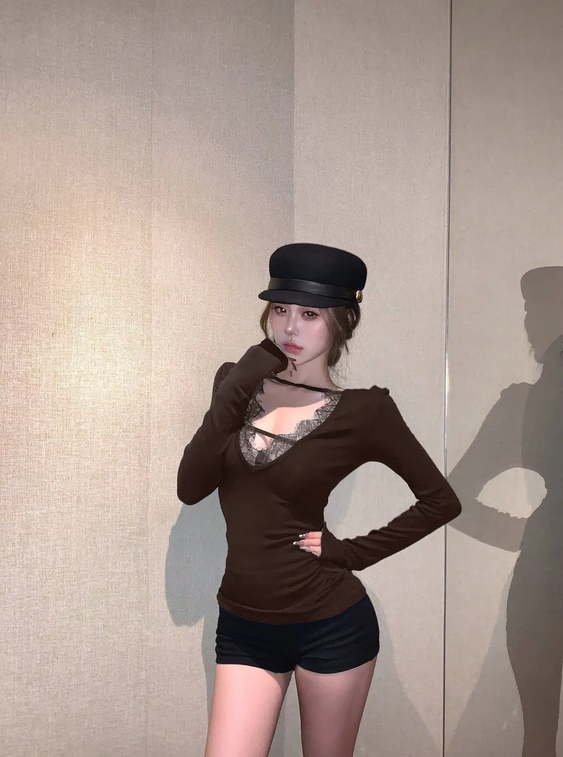 Bxoxo High End Backless Front and Back Lace Patchwork Long Sleeved T-shirt for Women Wearing Tight Fitting and Pure Desire Base Top