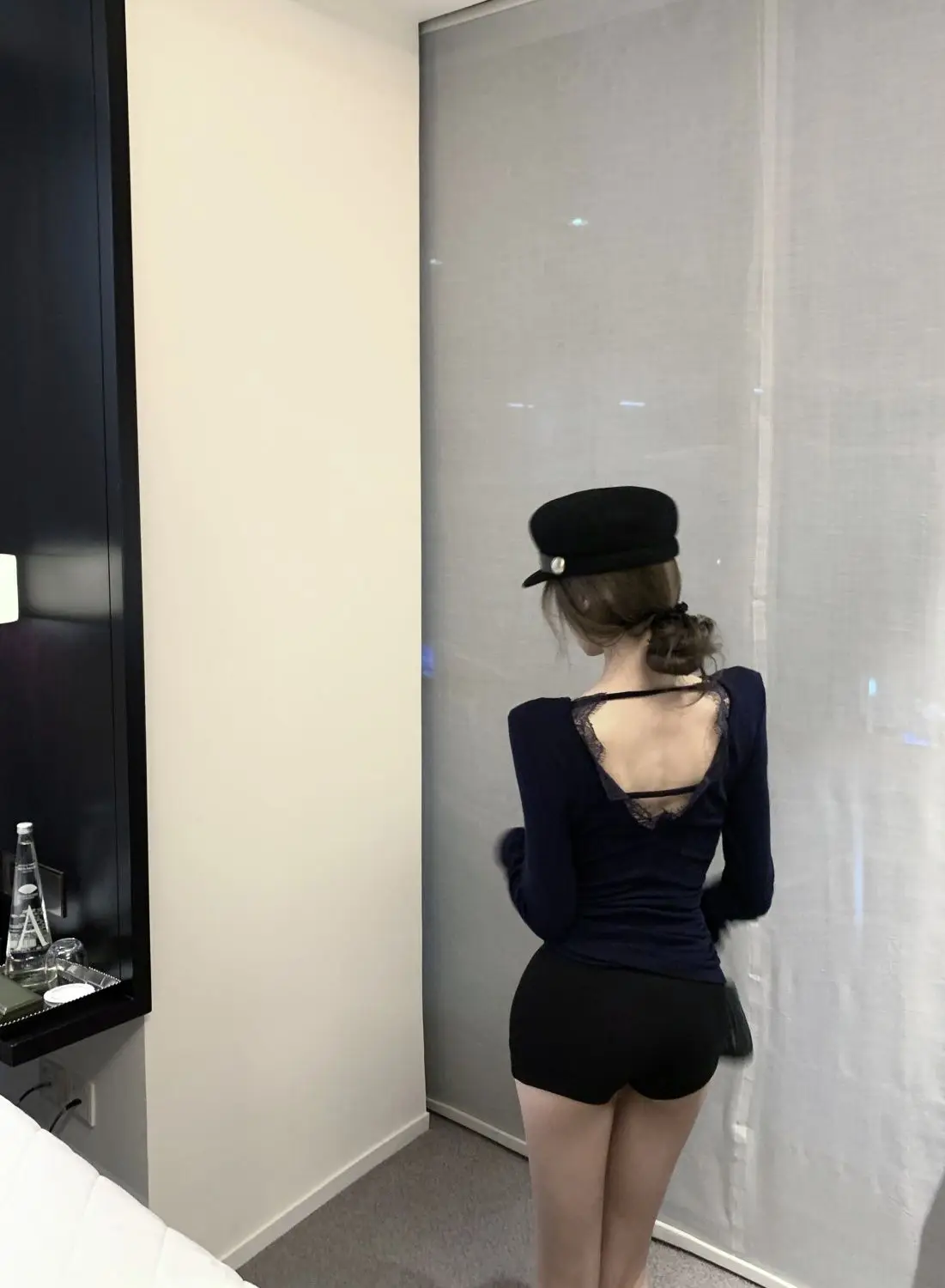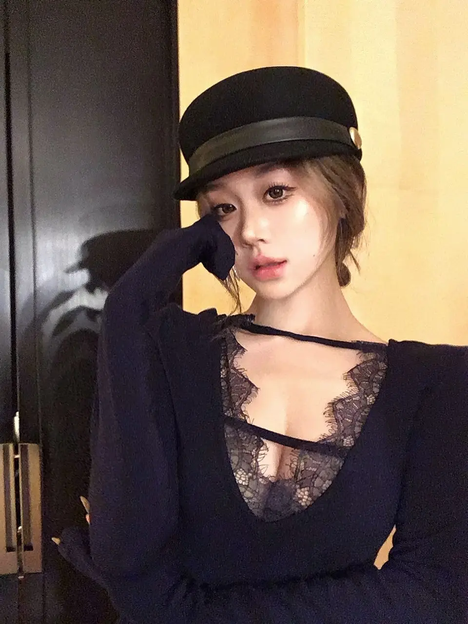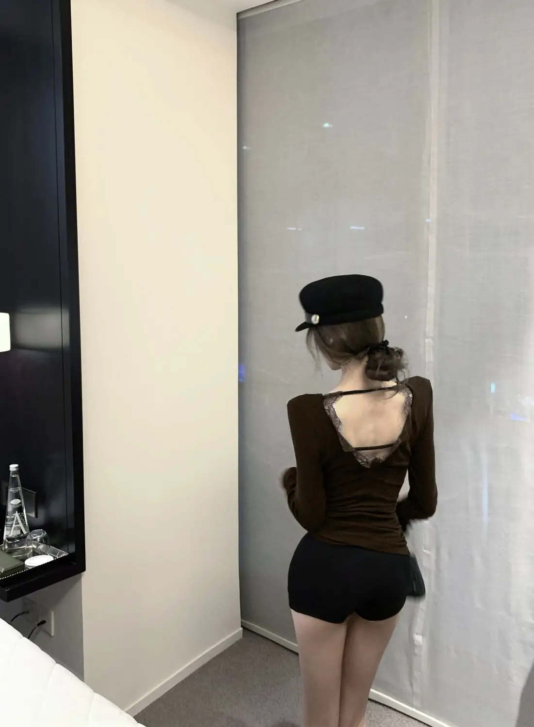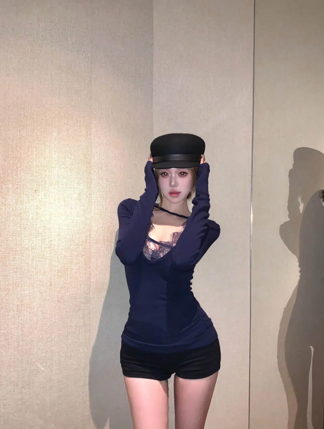 Bxoxo High End Backless Front and Back Lace Patchwork Long Sleeved T-shirt for Women Wearing Tight Fitting and Pure Desire Base Top