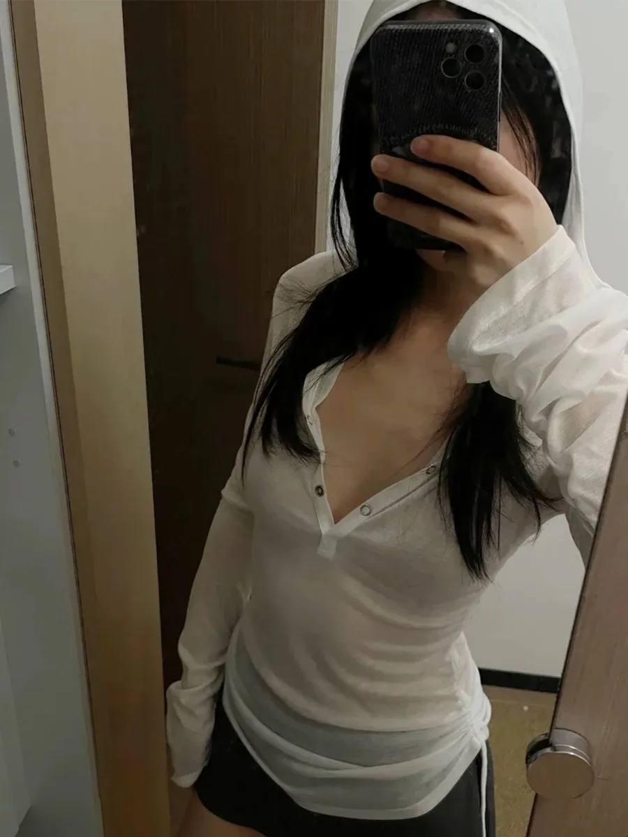 BXOXO Hooded Sheer T Shirt Woman Clothes Long Sleeve Korean Fashion 2000s Clothes Y2k See Through Autumn Tops Tees Female
