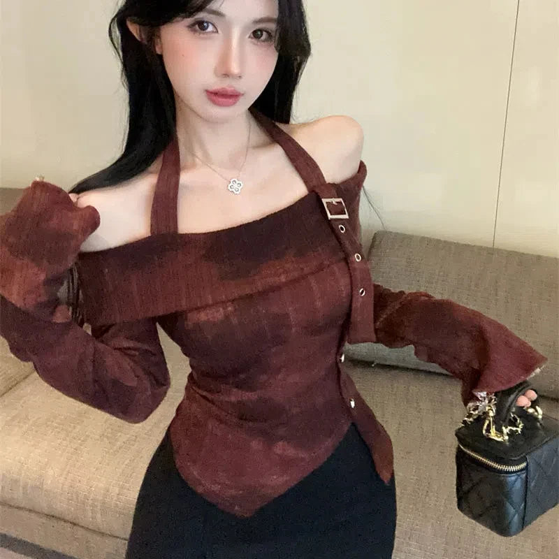 Bxoxo Hot Girl Hanging Neck Off Shoulder Long Sleeved T-shirt for Women New Niche Slim Fit and Slimming Short Top