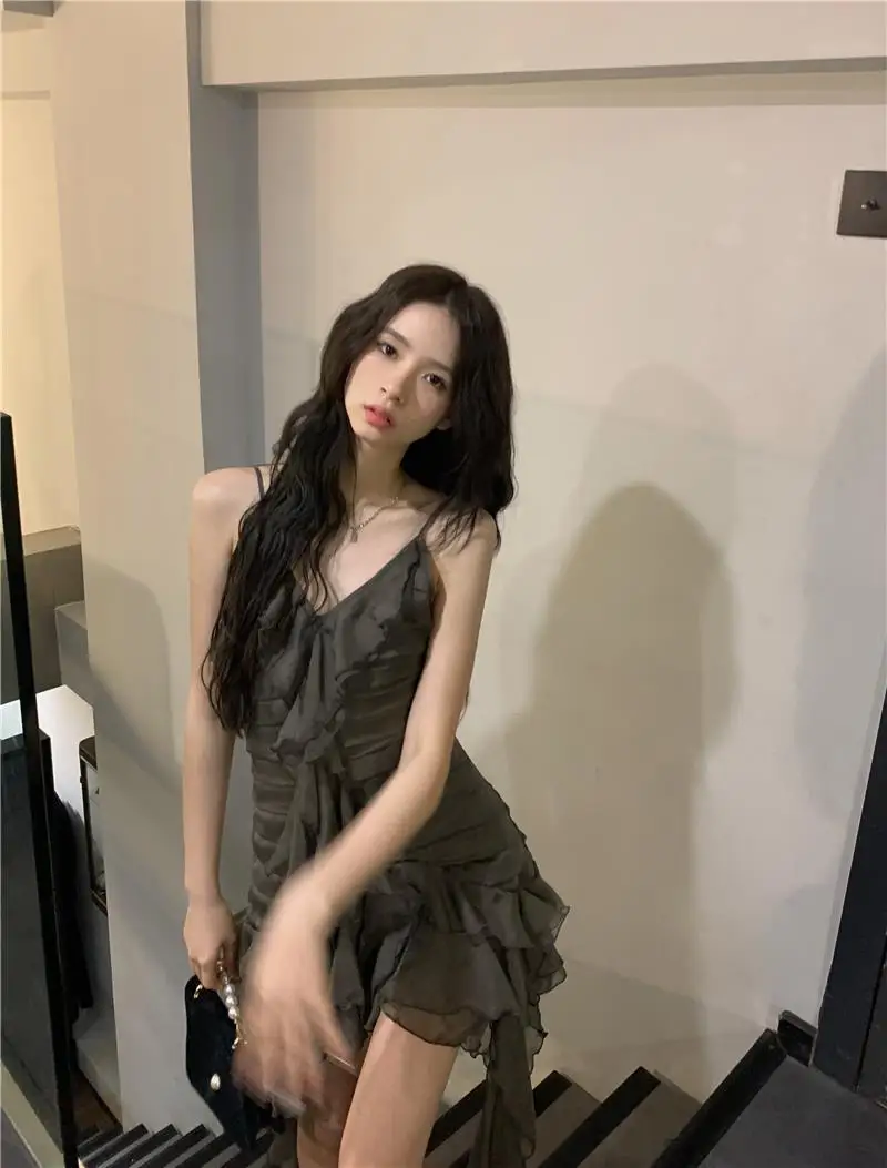 BXOXO Japanese Sexy Dark Sleeveless V-neck Women Dresses Cascading Ruffles Asymmetrical Femme Robe Harajuku 2025 Summer Camisole Dress