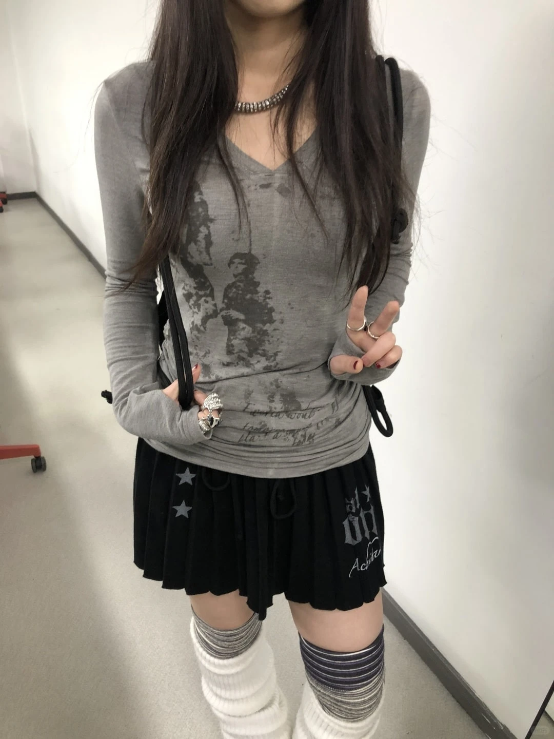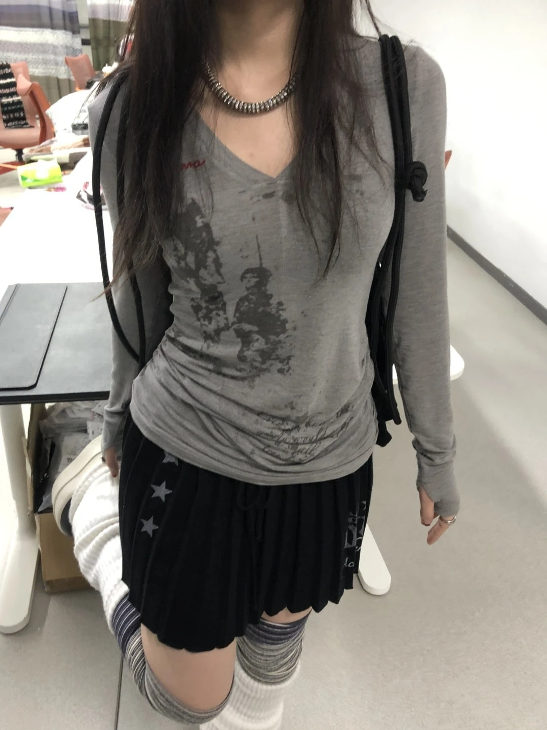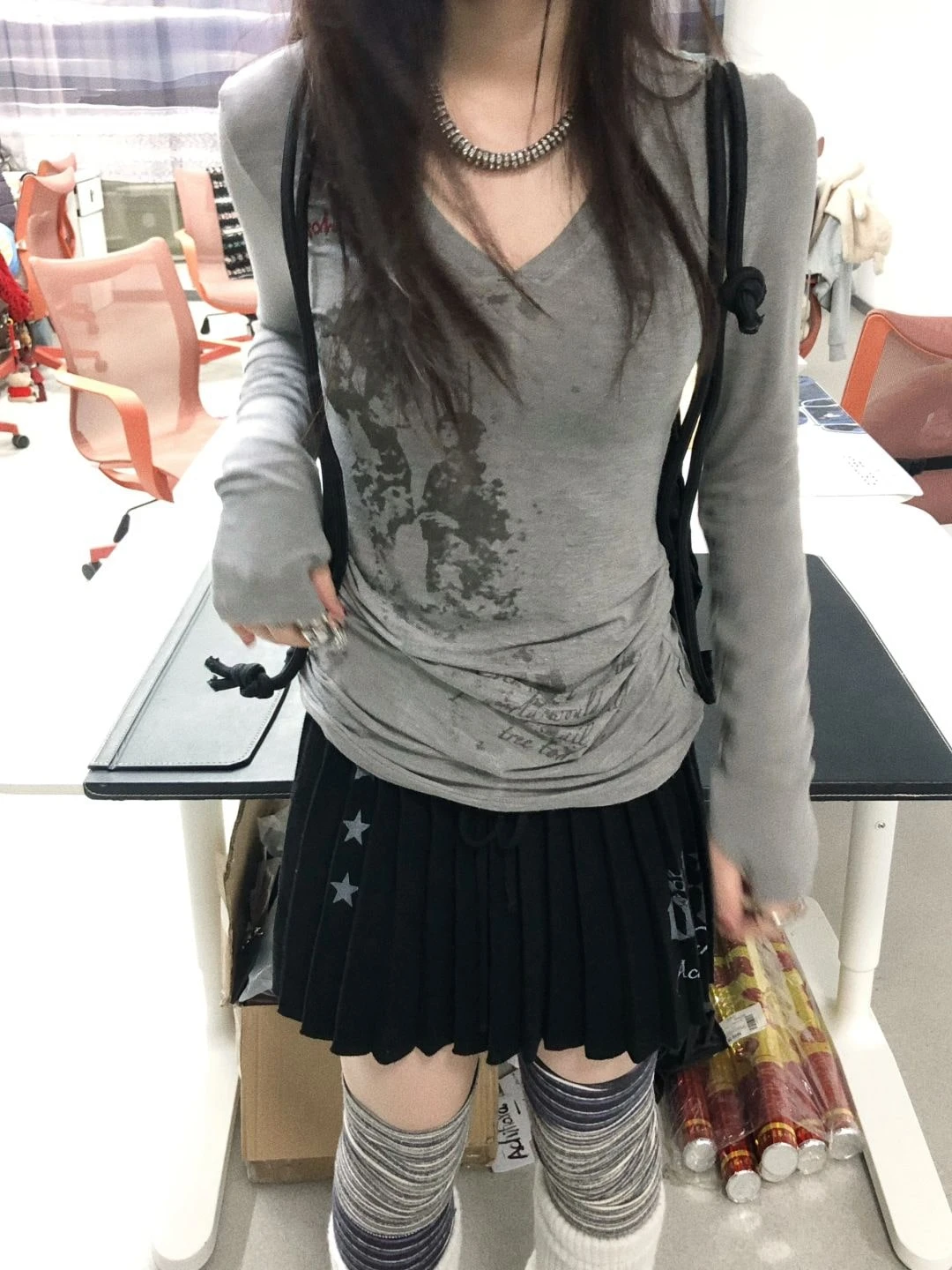 BXOXO Japanese Y2k Graffiti Print T-shirt Trashy 2000s Style V-neck T Shirt Vintage Harajuku Streetwear Grunge American Retro