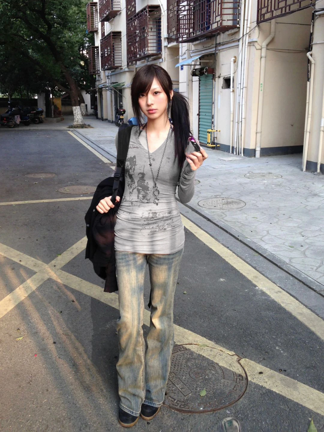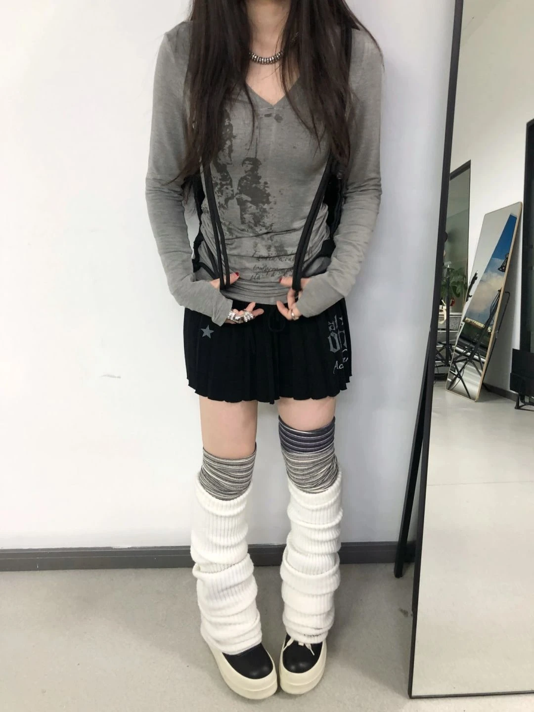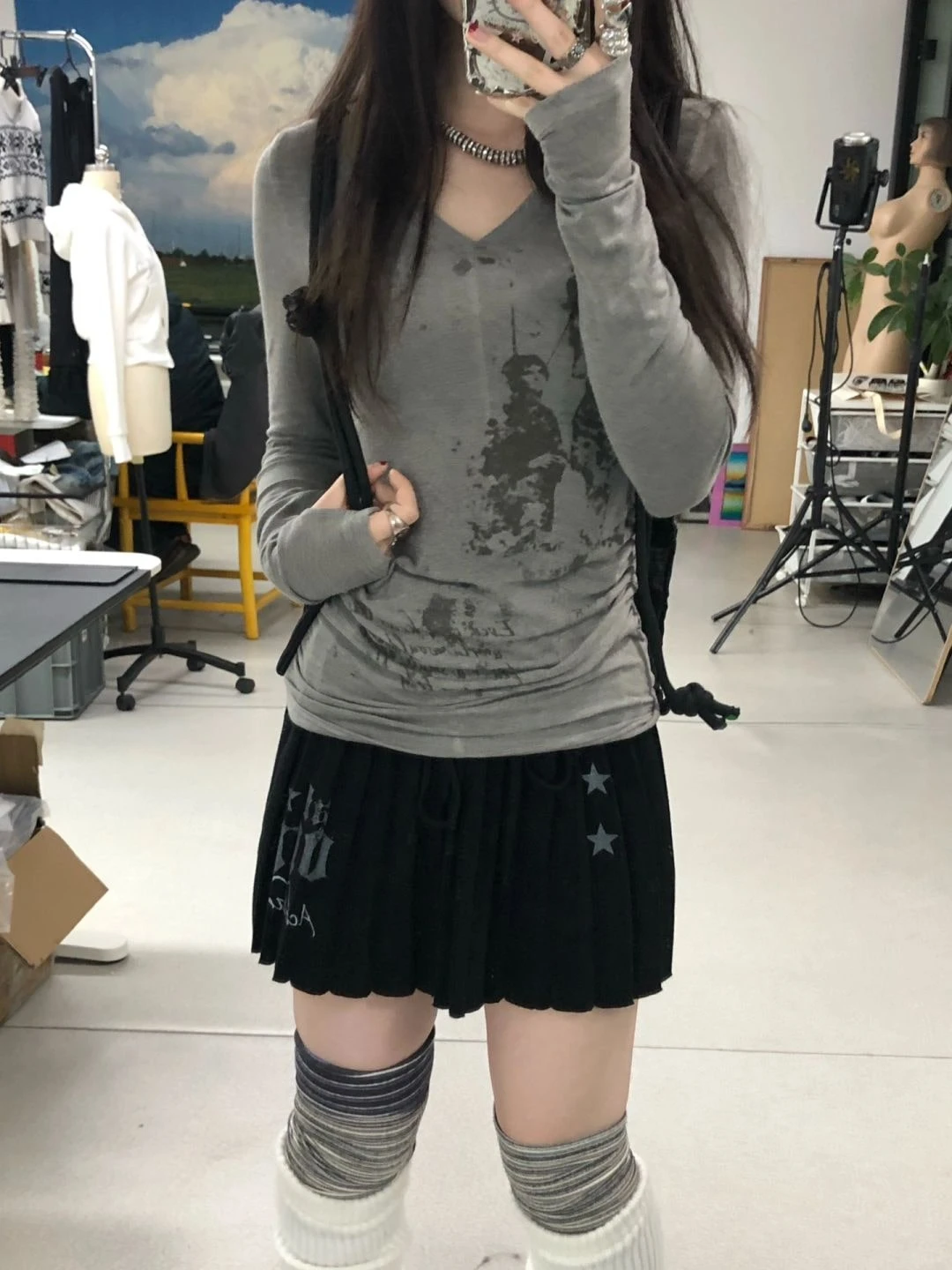 BXOXO Japanese Y2k Graffiti Print T-shirt Trashy 2000s Style V-neck T Shirt Vintage Harajuku Streetwear Grunge American Retro