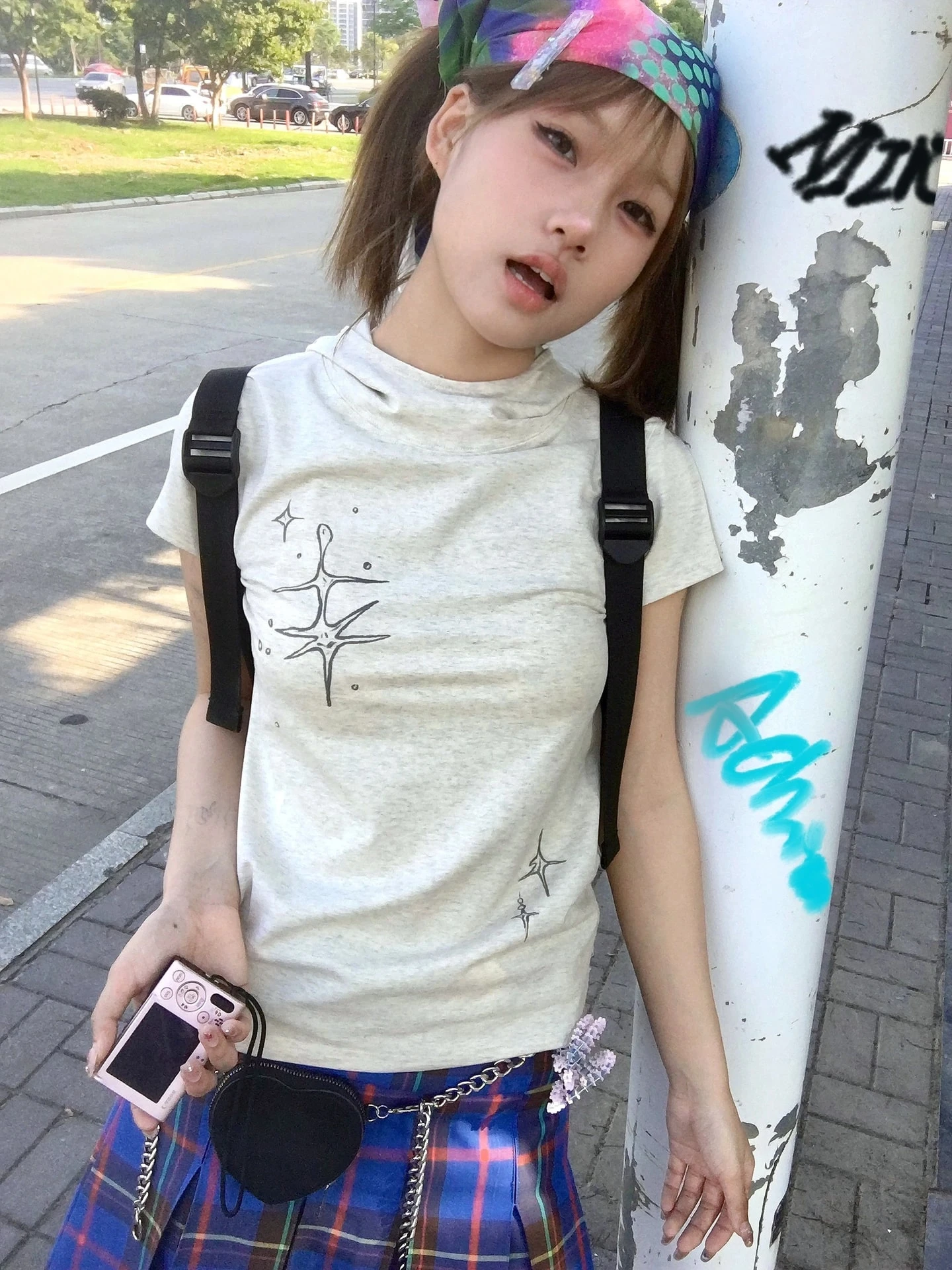 BXOXO Japanese Y2k Stand Collar T-shirt Trashy 2000s Style Short Sleeve Tee Shirt Vintage Harajuku Streetwear American Retro