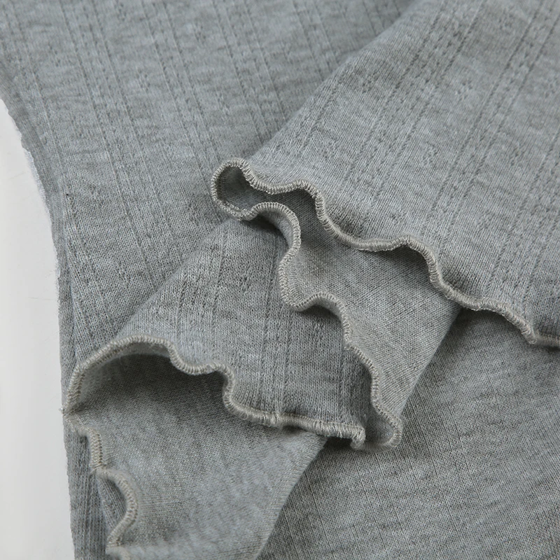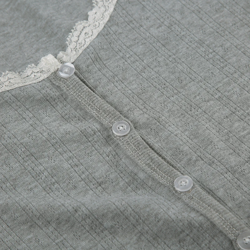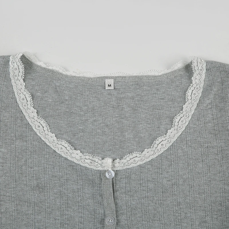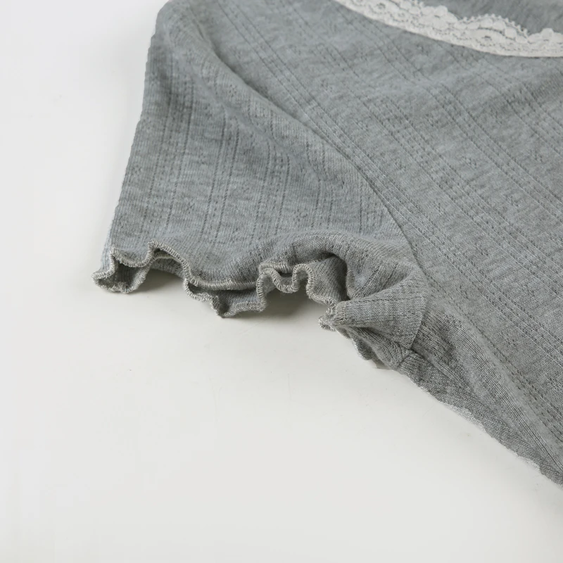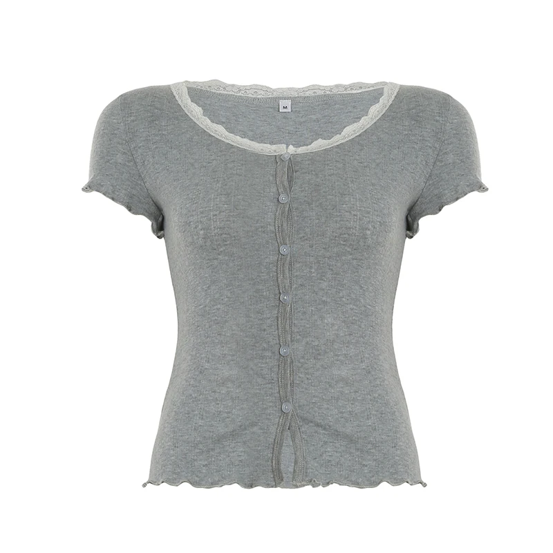 Bxoxo Kawaii Lace Stitching Grey Knitted Crop Top Korean Fashion Short Sleeve Button-up Skinny T-shirt for Women Y2k Streetwear