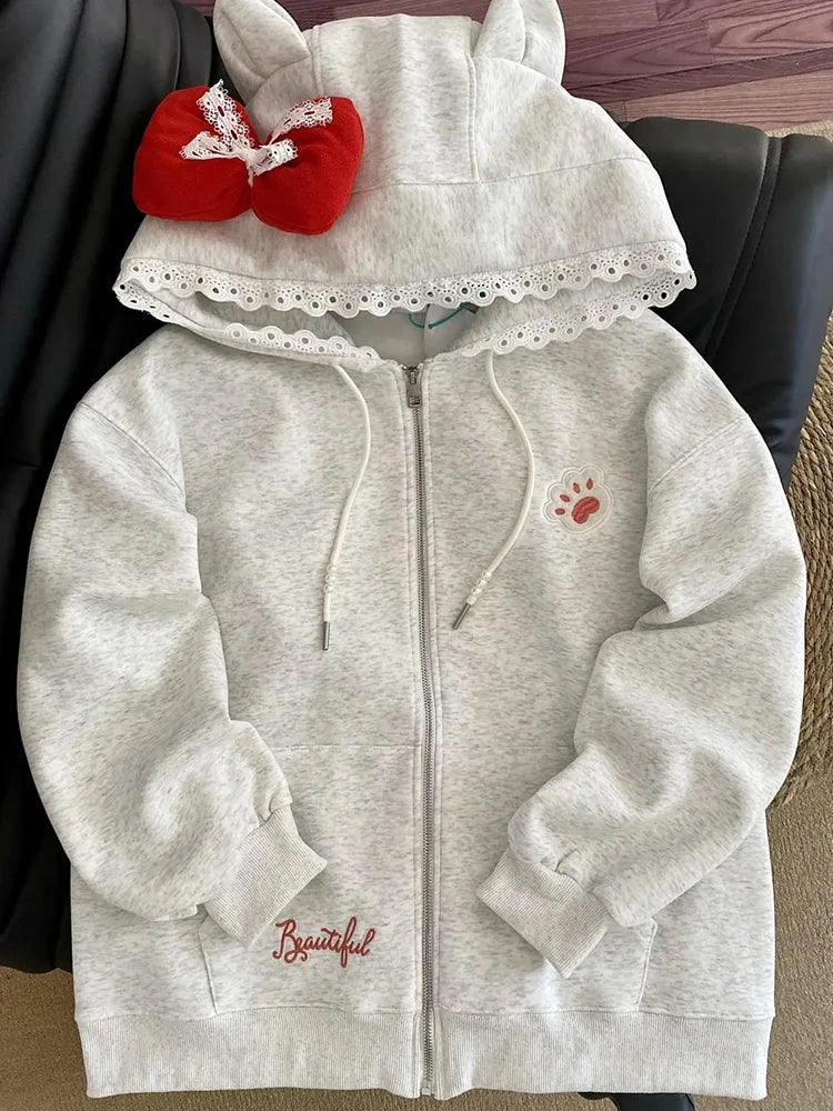 Bxoxo Kawaii Print Bow Hoodies Women Sweet Lace Patchwork Long Sleeve Cute Sweatshirts Japan Loose Pockets Letter Female Zipper Tops