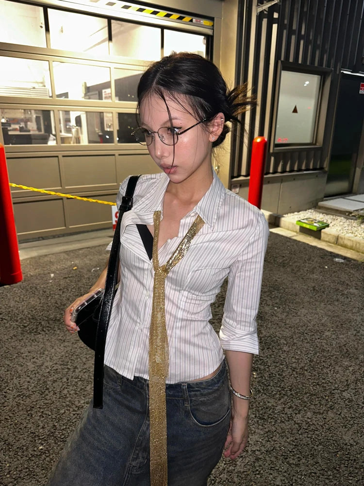 BXOXO Korean Fashion Shirt Women Striped Three Quarter Slim Shirt Y2k Vintage Tops Streetwear Japanese 2000s Retro Shirts