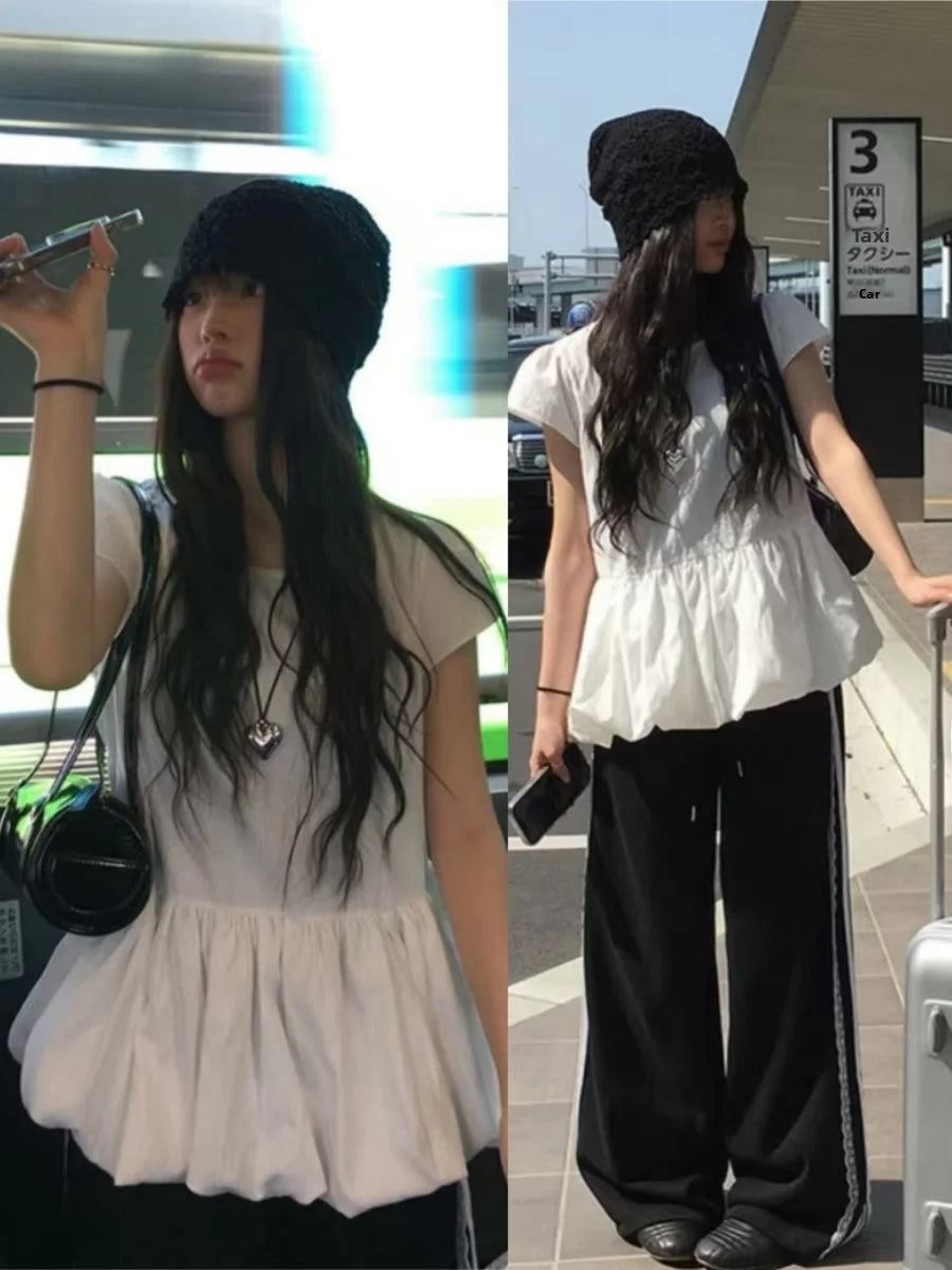 Bxoxo Korean Sle Summer Casual Pants Patchwork ort Sve Striped SEI Flower Bud Hem Lace Trim Loose Fit round Ne Top