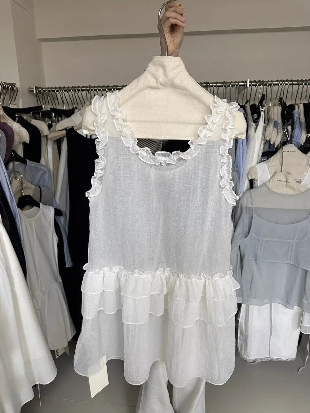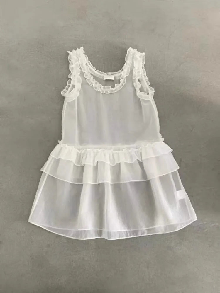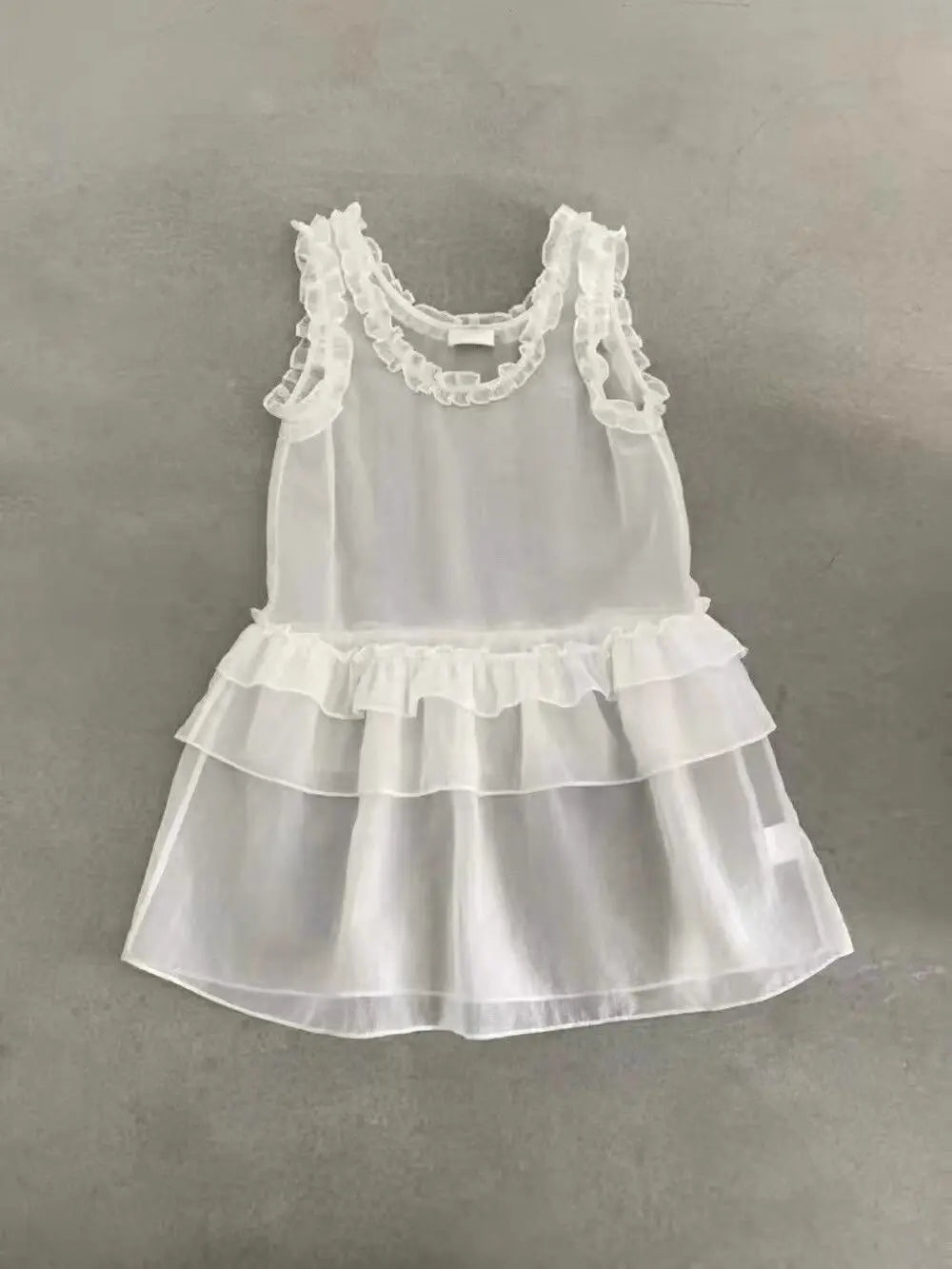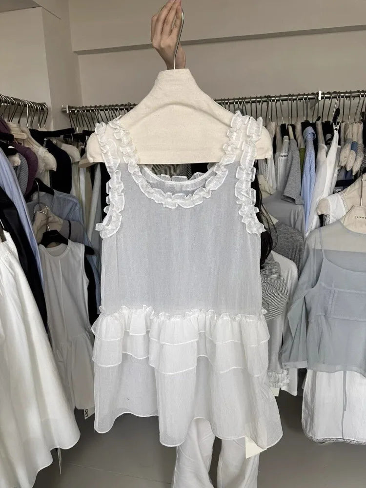 Bxoxo Korean Style Lace Tank Tops Women Y2k Fairycore White Ruffle Sleeveless Dress See-through Aesthetic Kpop Mesh Dress
