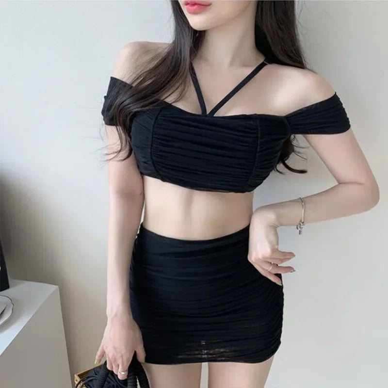 Bxoxo Korean Style Sexy Solid Swimsuit Two Pieces Women Bikini Set Push Up Swimsuit Beach Summer Pleated Swimwear Bikinis