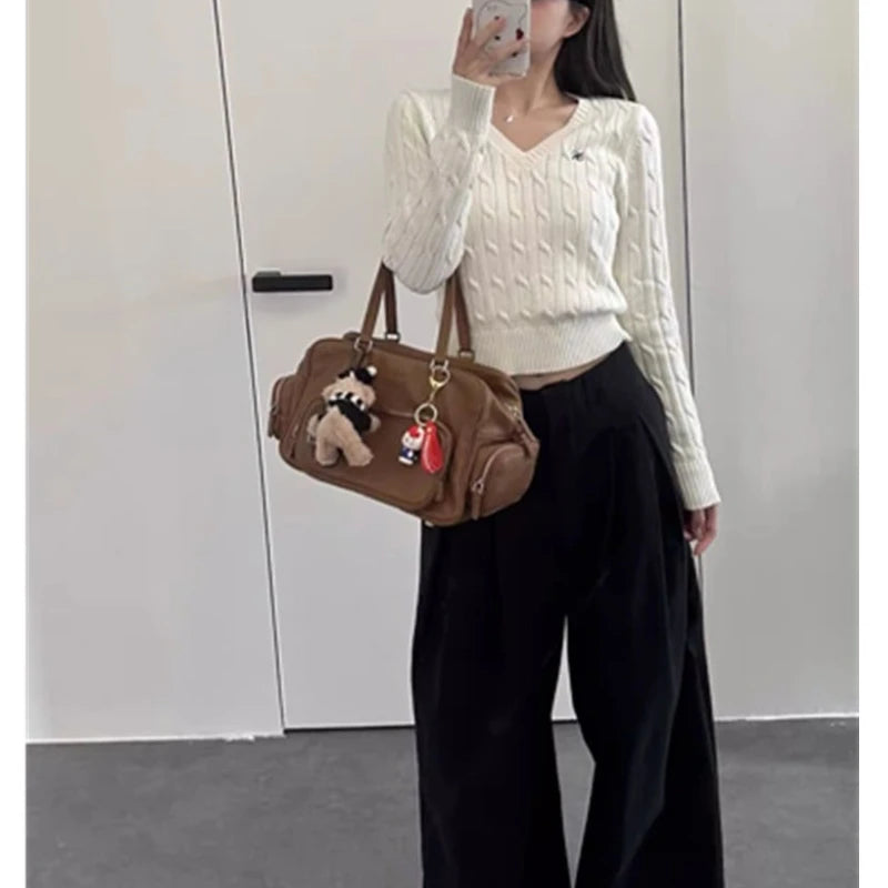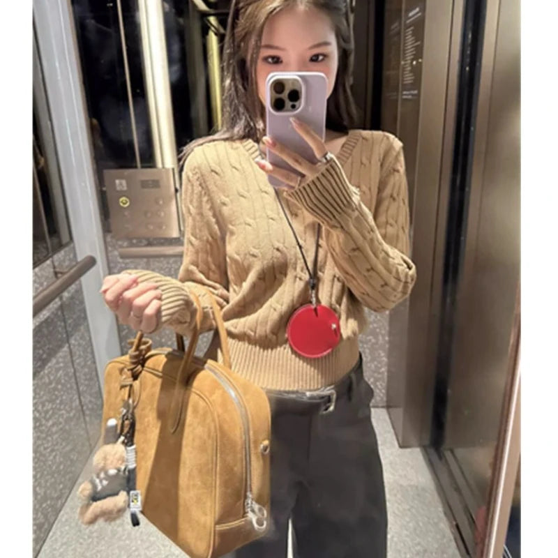 Bxoxo Korean Style V Neck Sweaters Women Preppy Style Sweet Knitted Pullover Vintage Elegant Old Money Long Sleeve Crop Tops