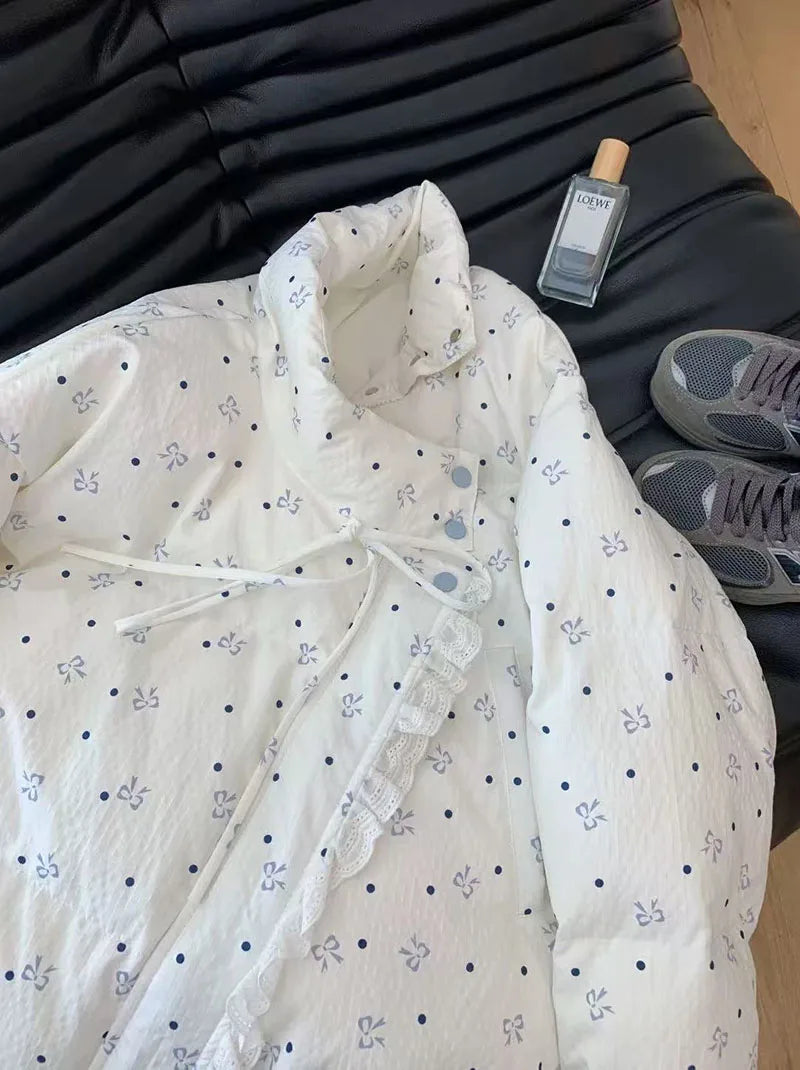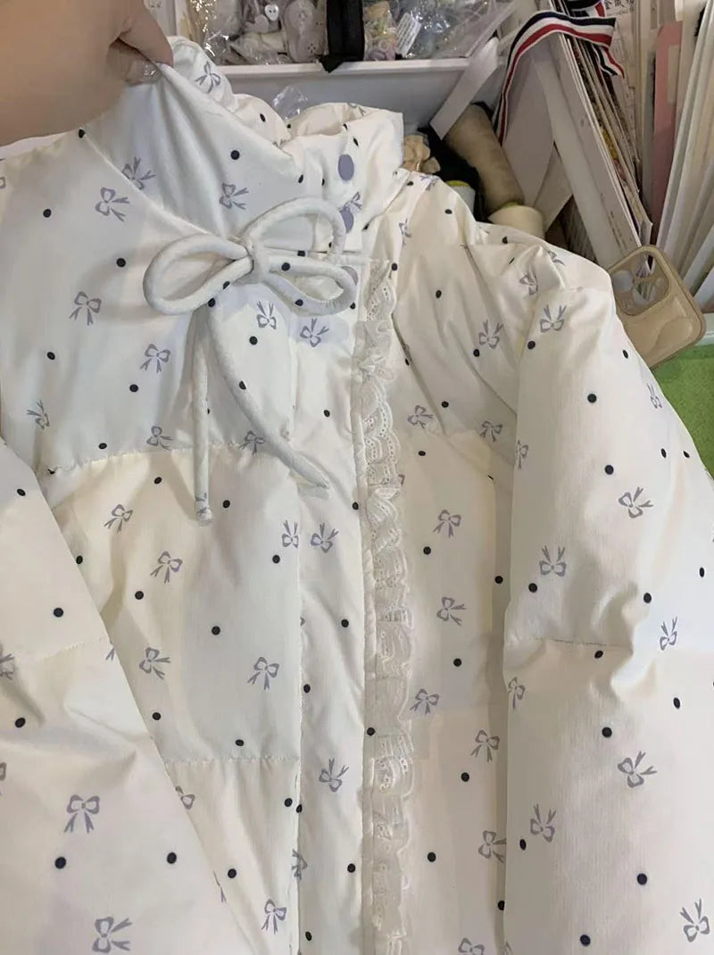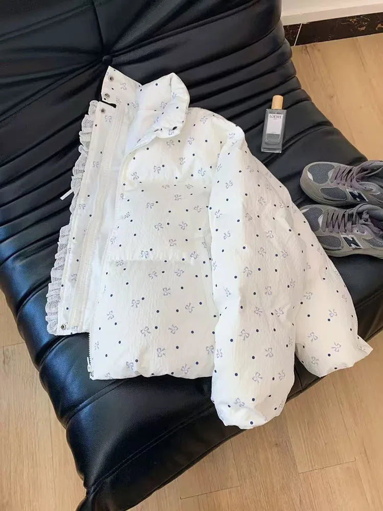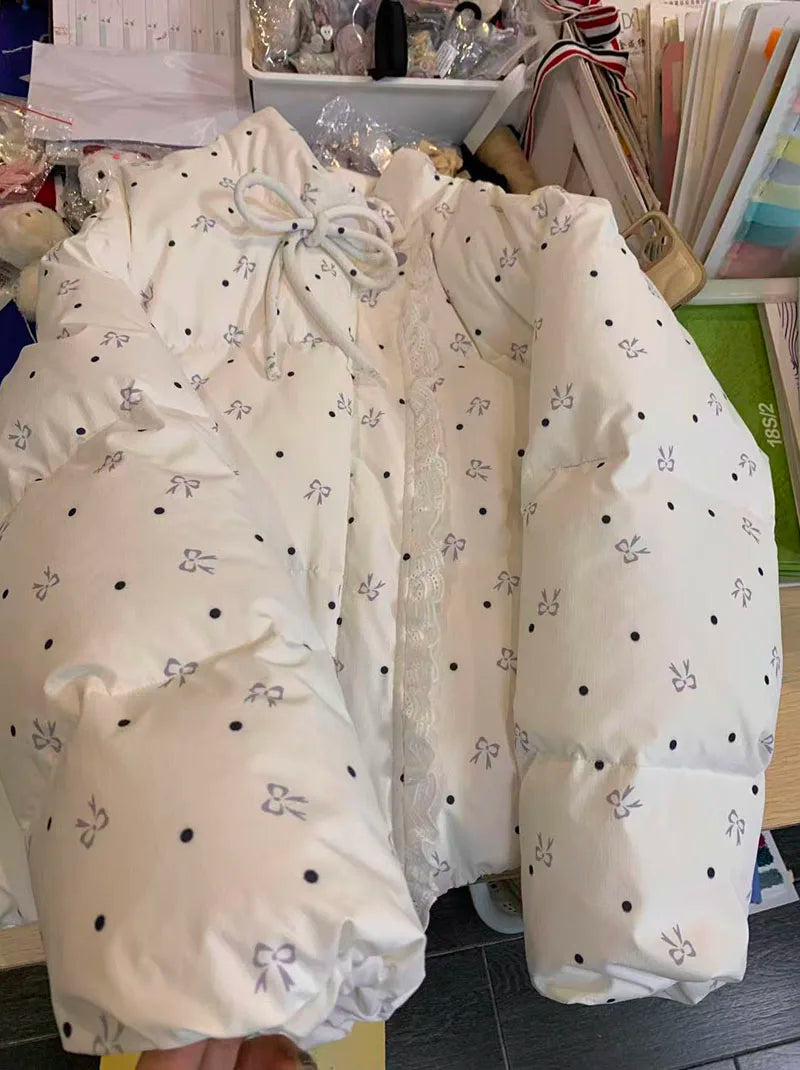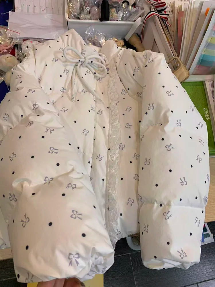 Bxoxo Lace Patchwork Parkas for Female Y2K Korean Loose Preppy Casual Puffer Jacket Sweet Bow Printing Thick Zipper Fluffy Down Coats