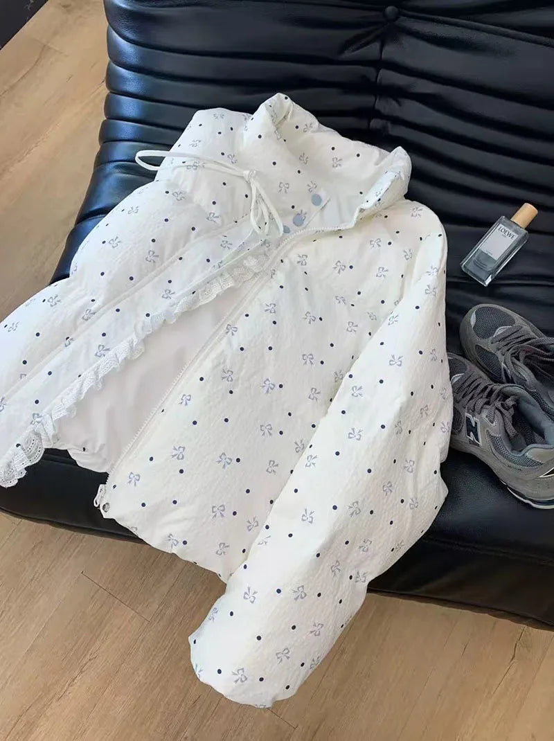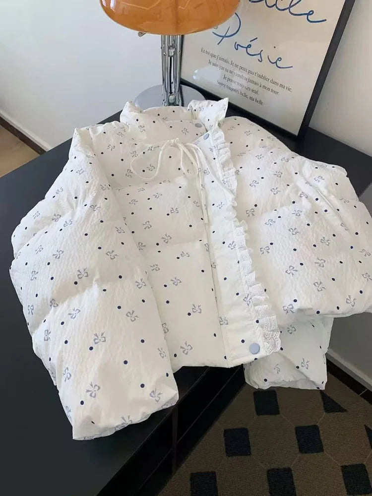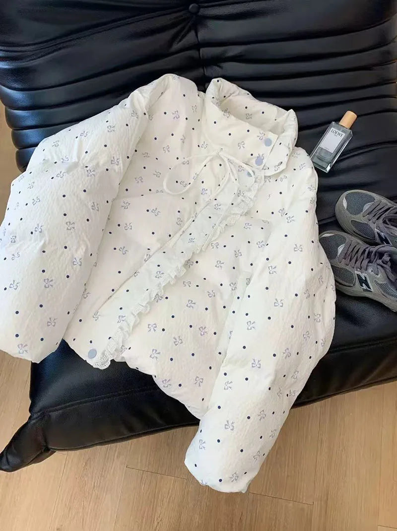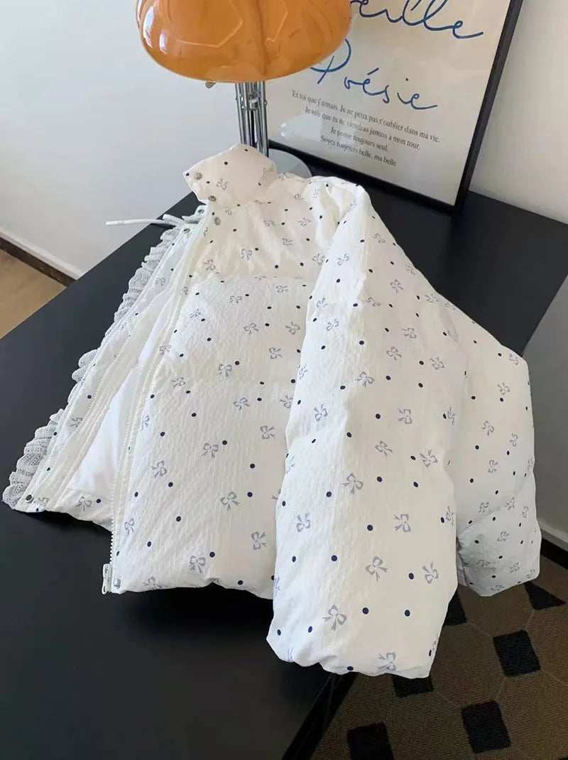 Bxoxo Lace Patchwork Parkas for Female Y2K Korean Loose Preppy Casual Puffer Jacket Sweet Bow Printing Thick Zipper Fluffy Down Coats