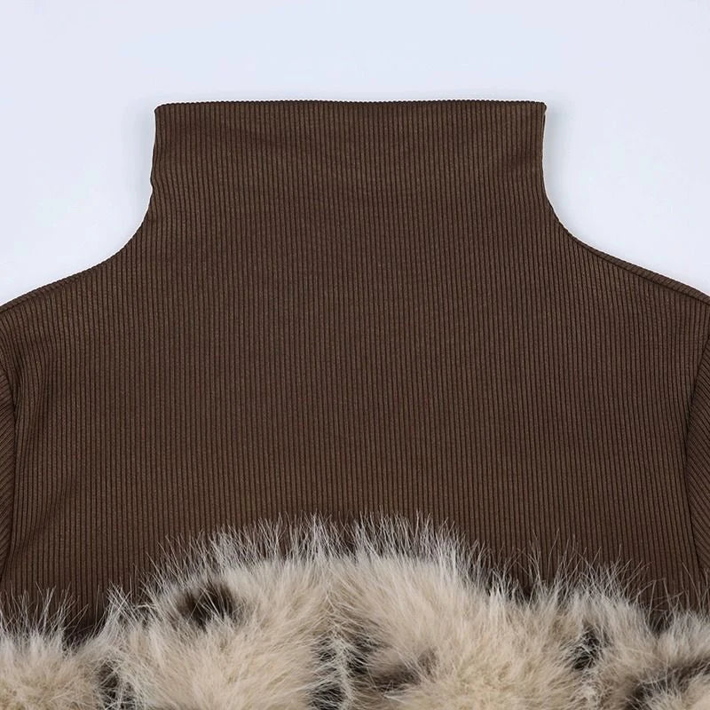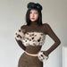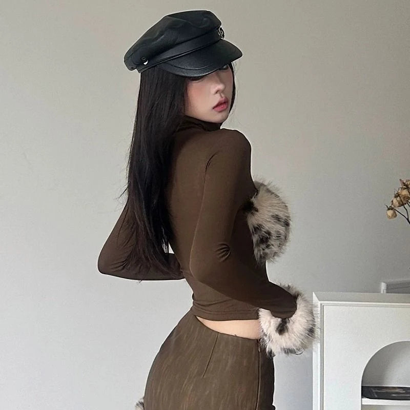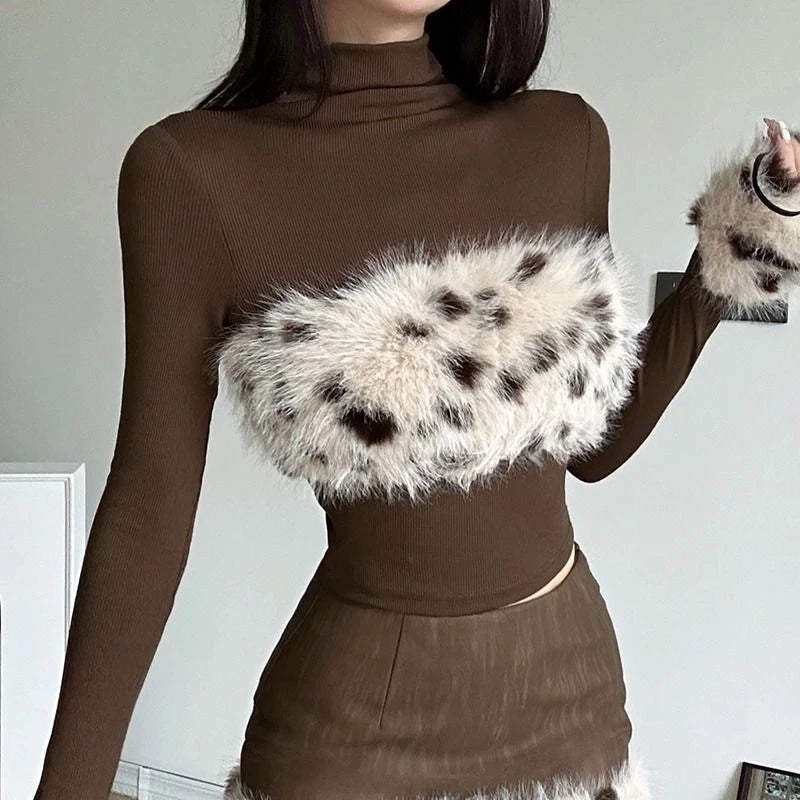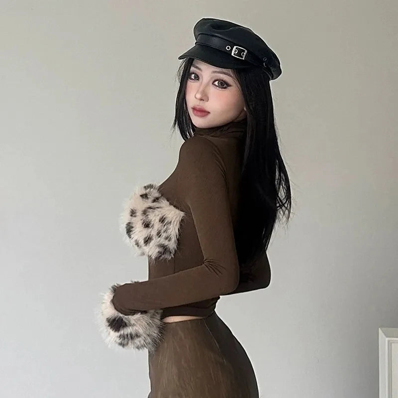 Bxoxo Leopard Patchwork Women T Shirt Autumn Half Turtleneck Long Sleeve Slim Crop Top Y2K American Streetwear All Match Tees Female