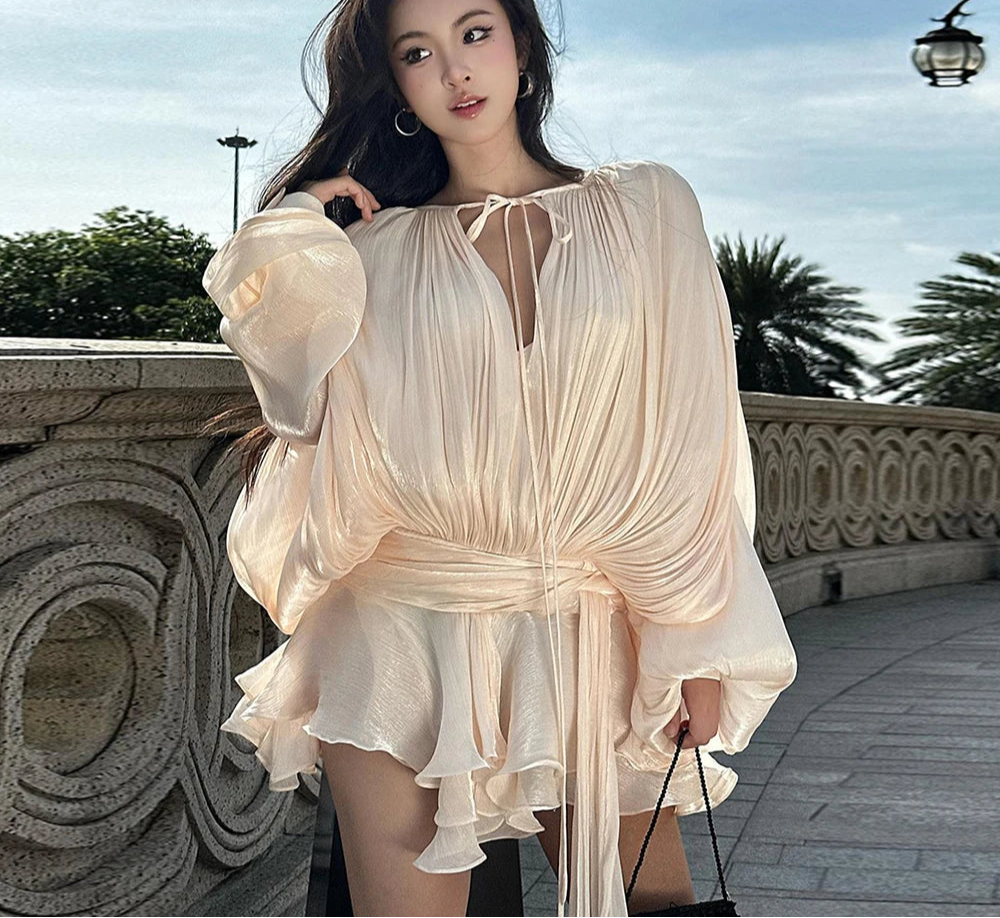 BXOXO Minimalist Solid Loose Short Dresses For Women Round Neck Long Sleeve High Waist Spliced Lace Up Chic Dress Female Fashion