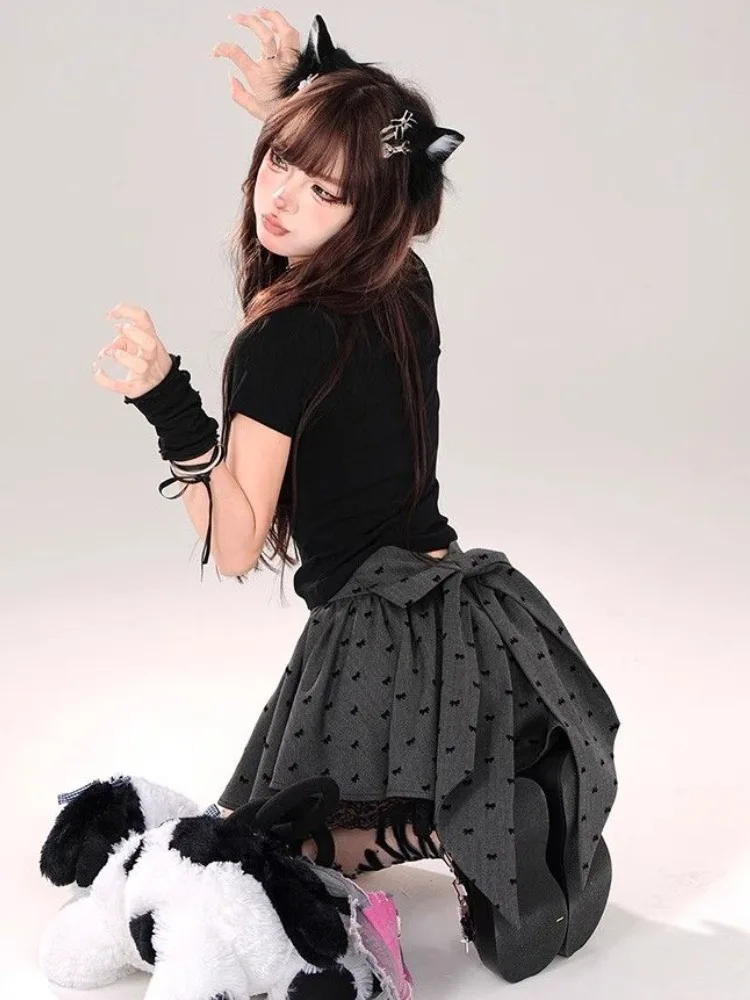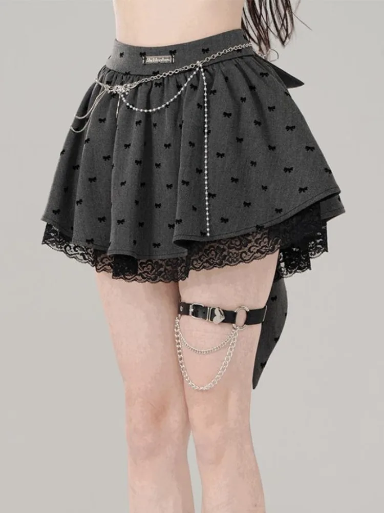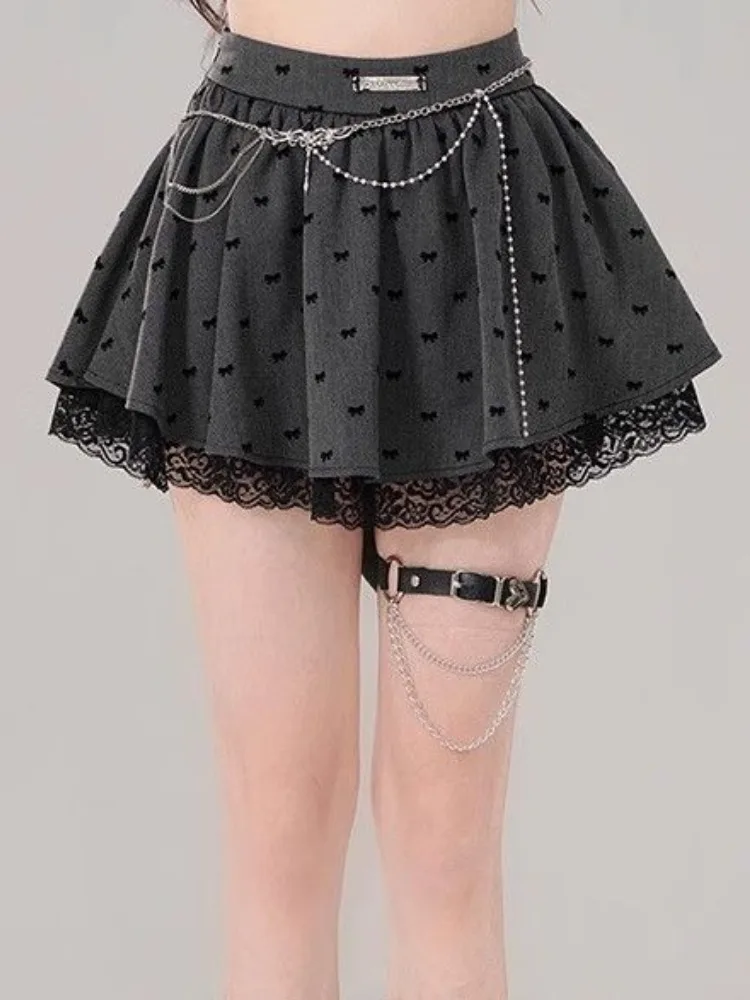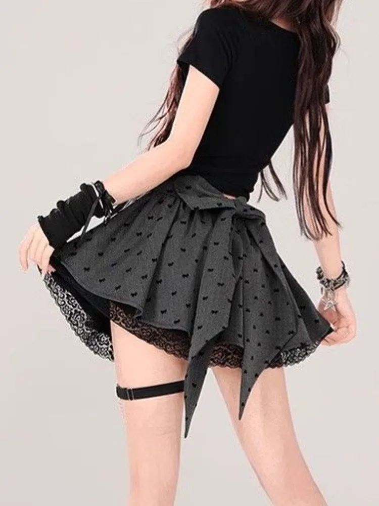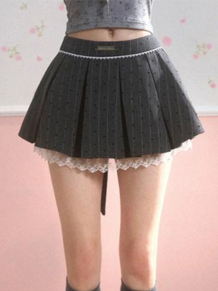 Bxoxo New Gray Pleated Y2k Mini Skirt Women Summer Lace Patchwork Bow Fashion Skirt Lolita Style Striped Dot Print Cutecore Skirt