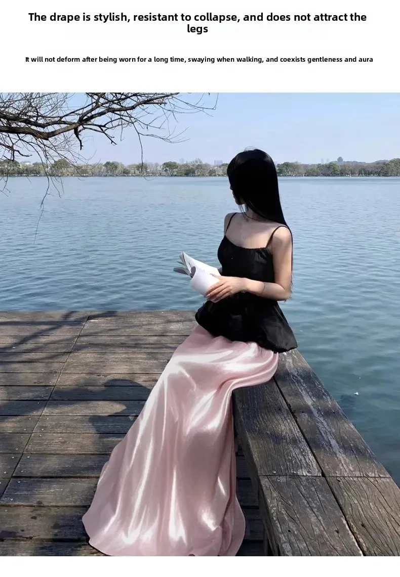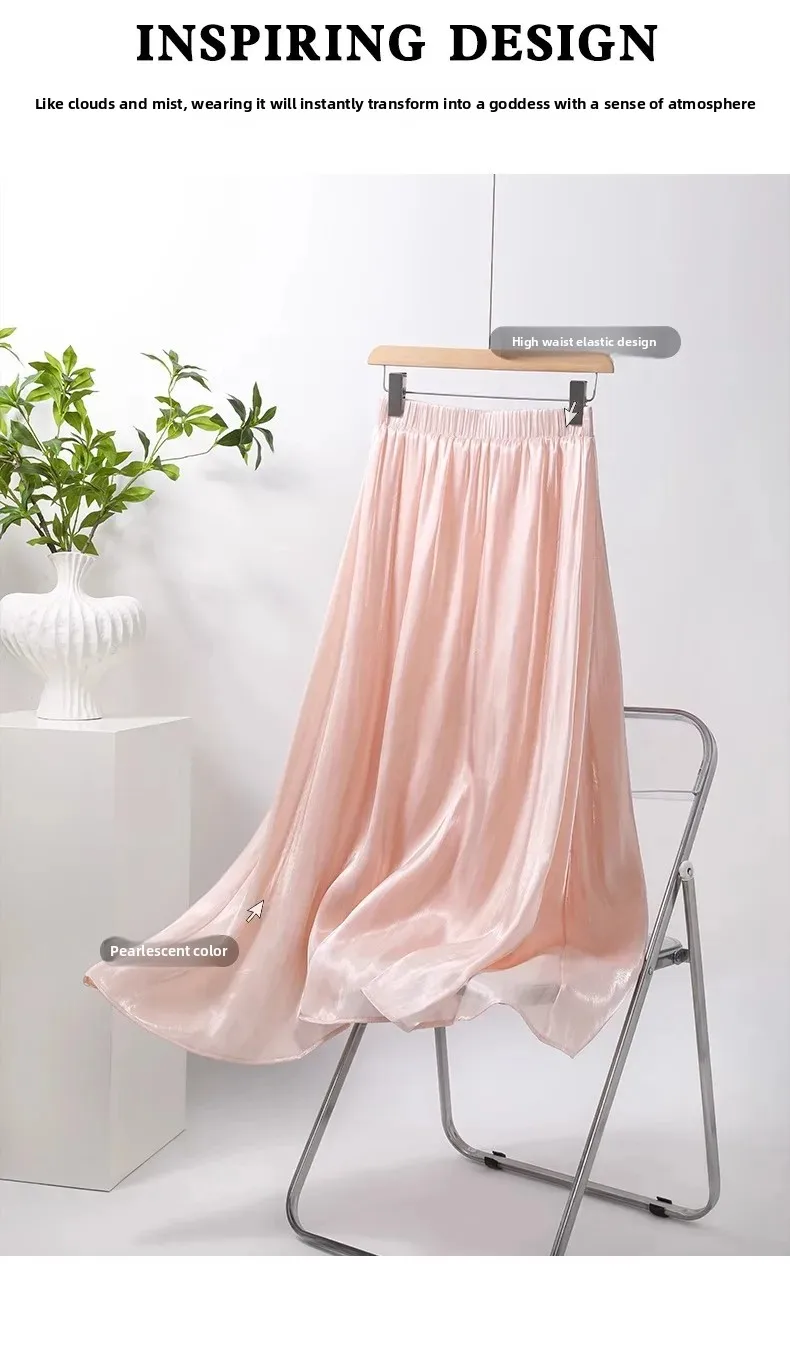 Bxoxo Pink Glimmering Long Half Skirt Women's Summer Flowing Silk Satin Drapey A- Line Midi Skirt Polyester Fiber Plain Color