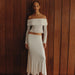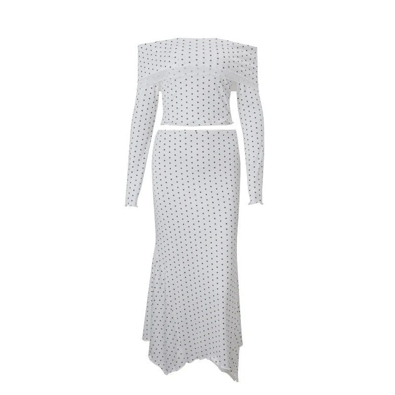 Bxoxo Polka Dot Lace Long Sleeve Off Shoulder Crop Tops + Elegant Bodycon Long Dress Fall Fashion Vacation Beach 2 Piece Set