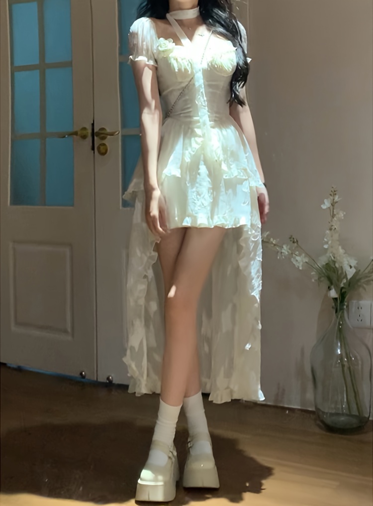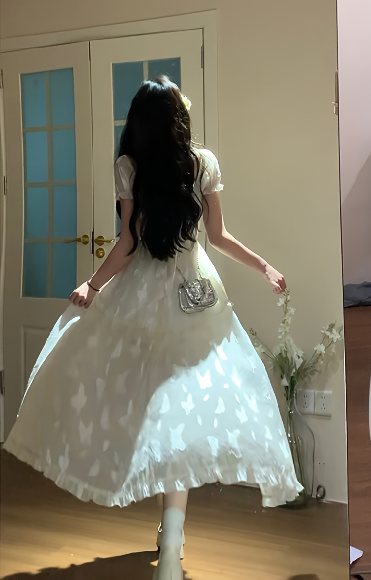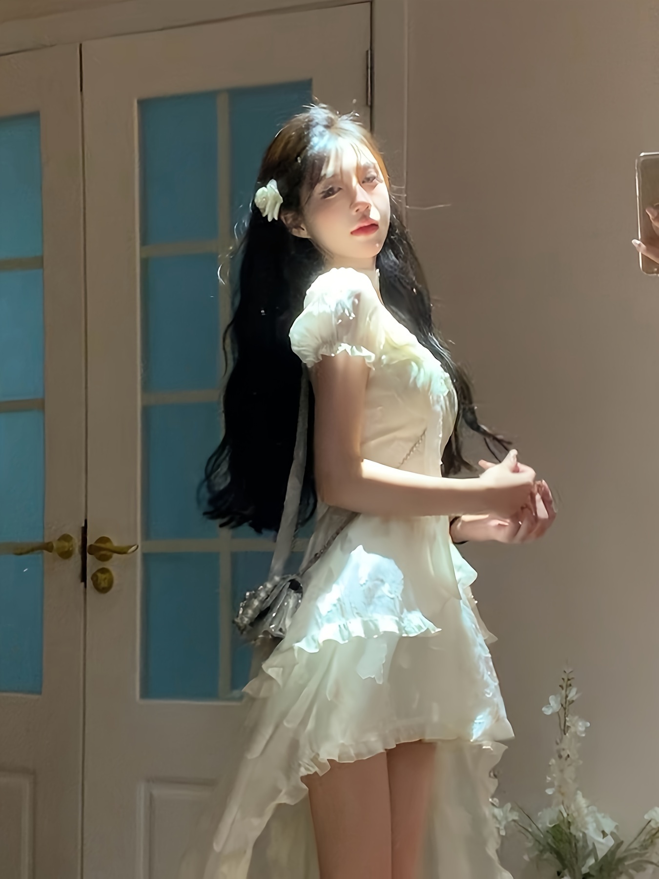 BXOXO [Polyester French Princess Dress] Sexy French Princess Style Polyester Dress - Elegant Asymmetrical Long Dress with Geometric Pattern, Lantern Short Sleeves, and Cardigan Collar for Women - Summer Irregular Hem