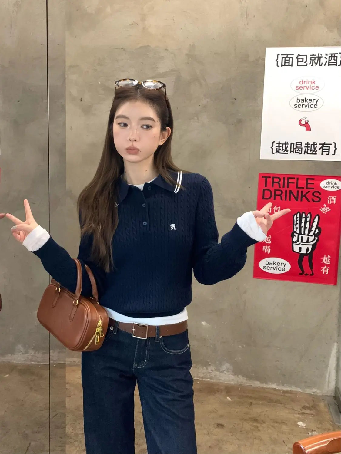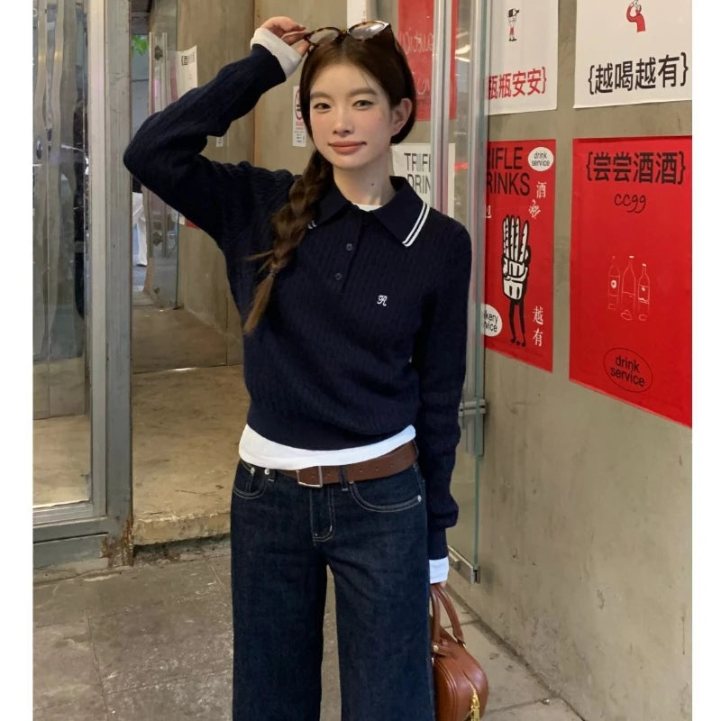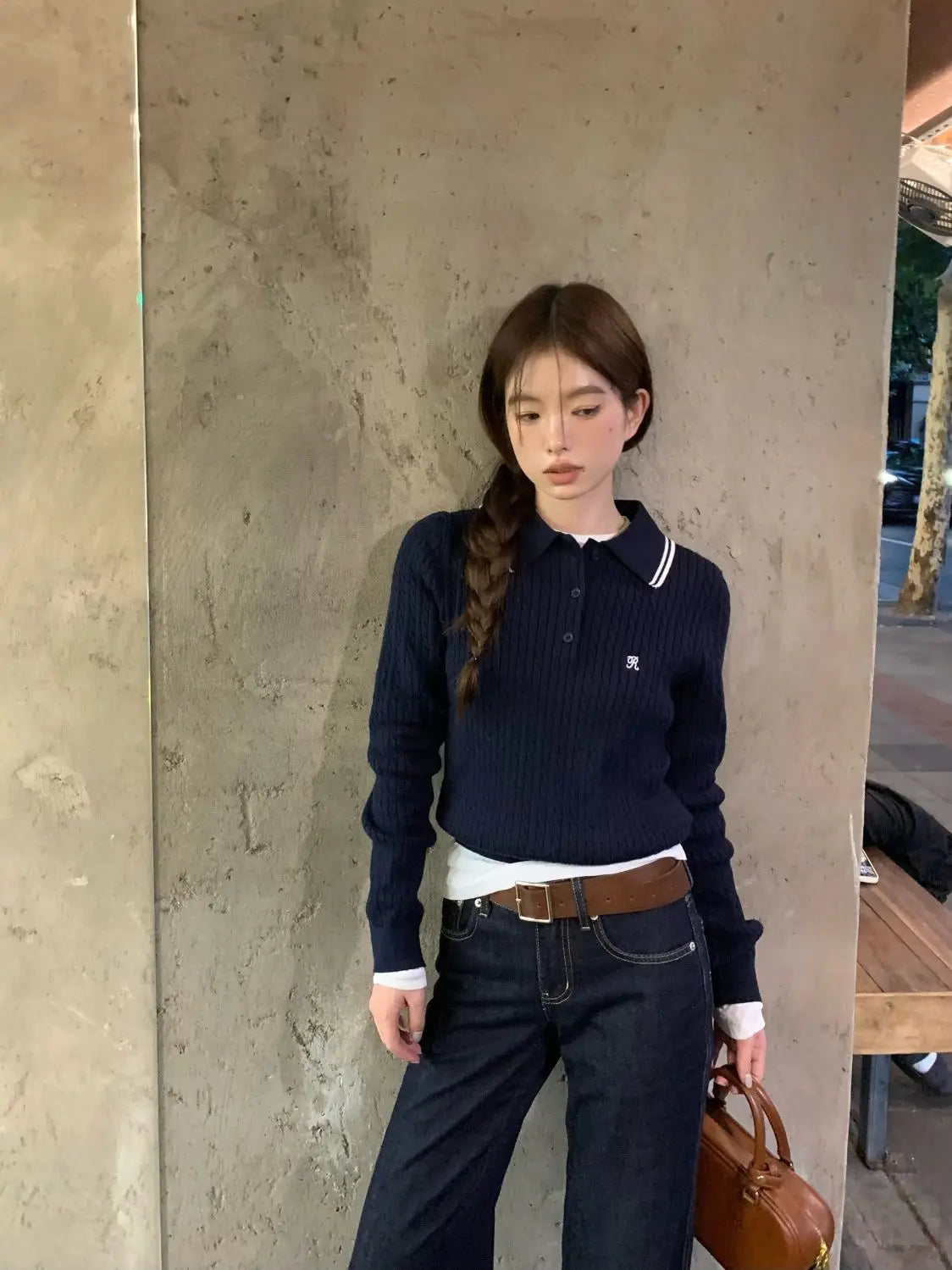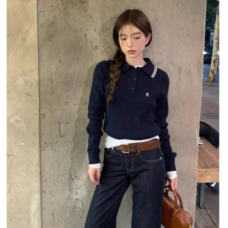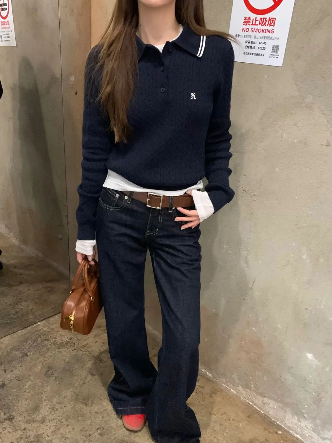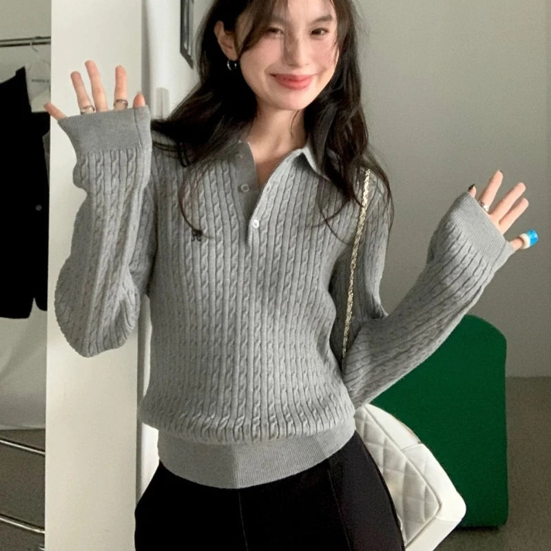 Bxoxo Preppy Style Embroidery Sweaters Women Old Money Style Korean Knitted Pullover Vintage Long Sleeve Gray Polo Jumpers