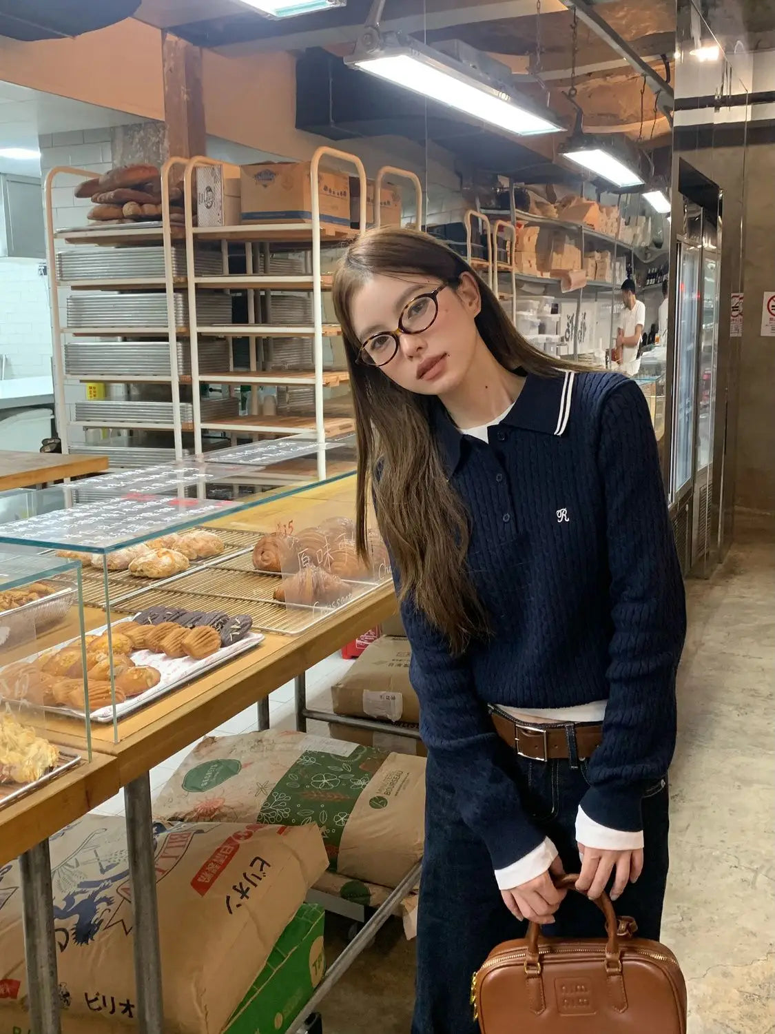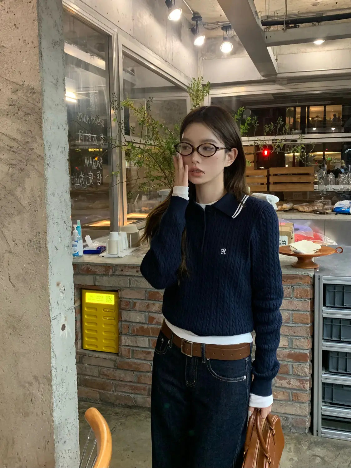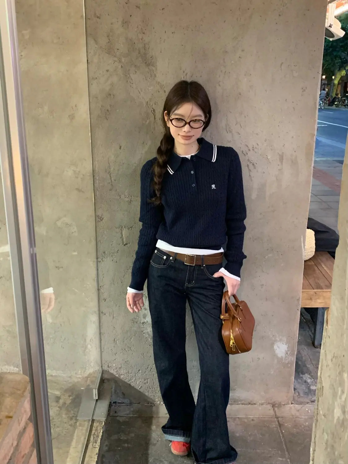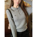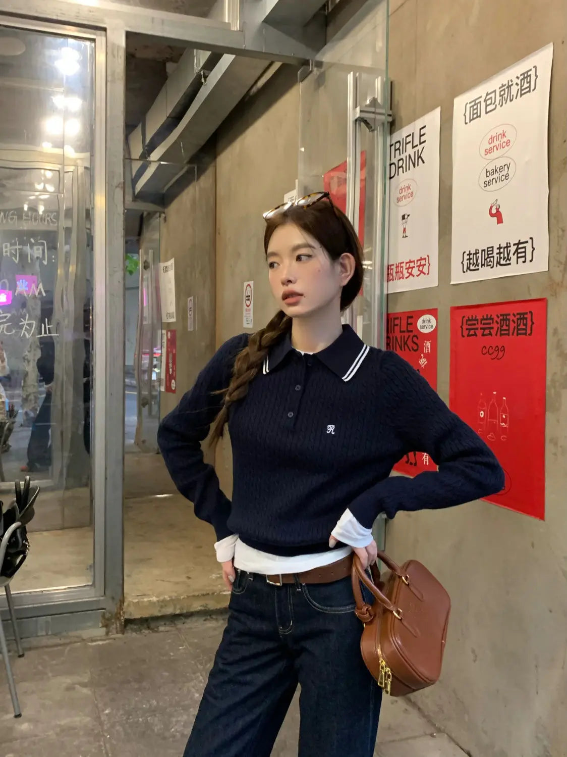 Bxoxo Preppy Style Embroidery Sweaters Women Old Money Style Korean Knitted Pullover Vintage Long Sleeve Gray Polo Jumpers