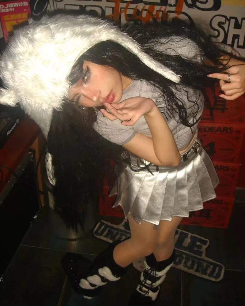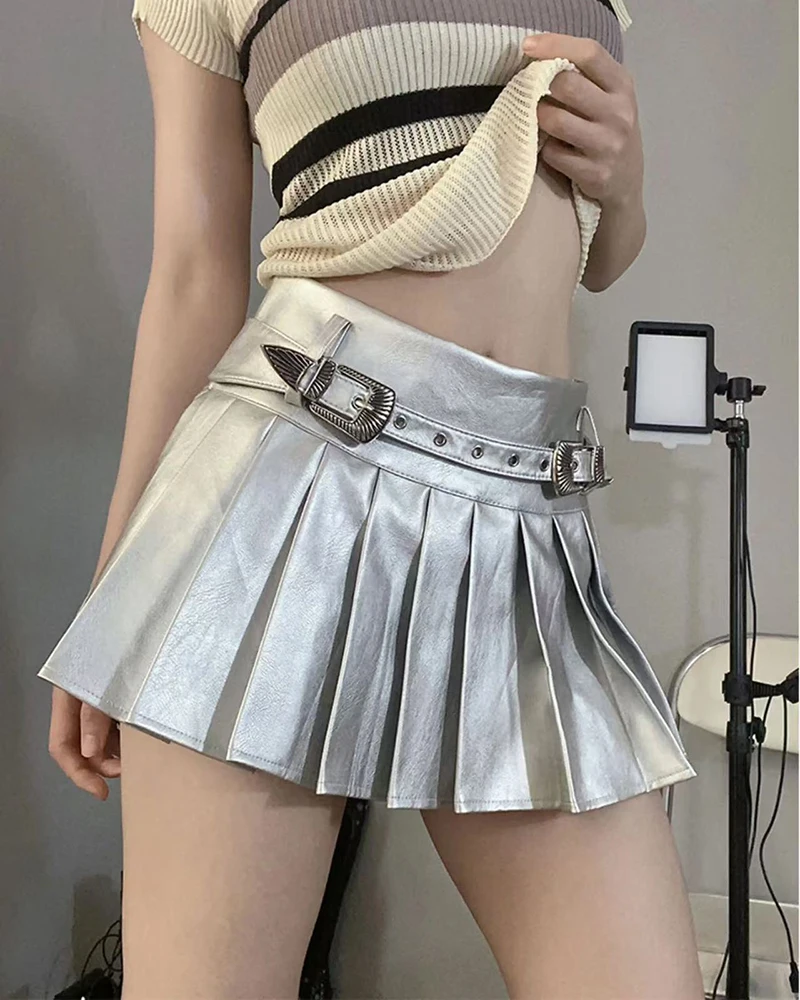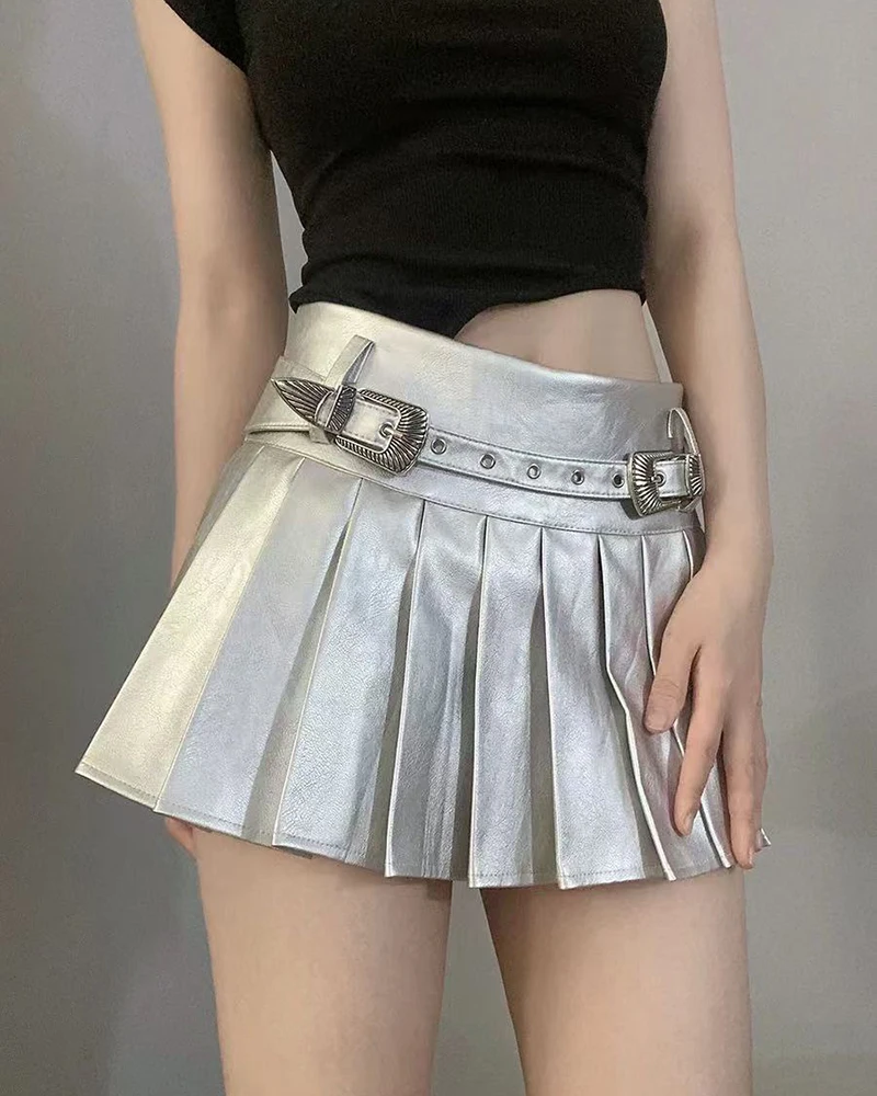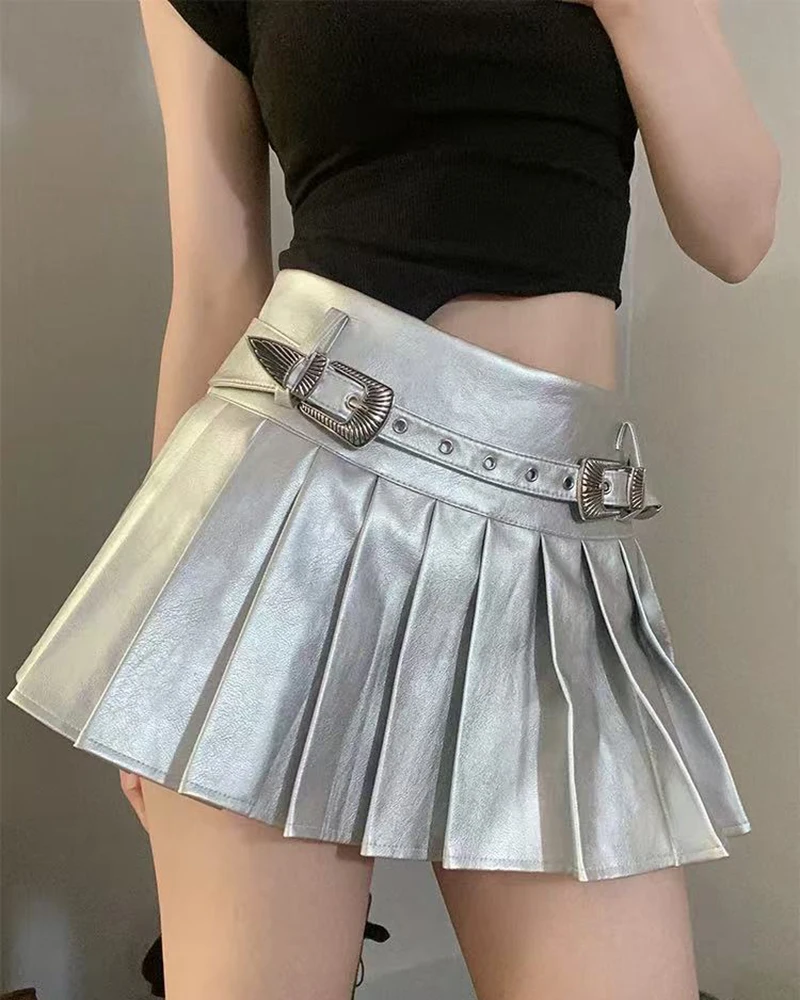 Bxoxo PU leather Pleated skirts Women Y2K High Waist With belt casual A line Punk skirts Fashion Hot Girls Night Party mini skirts