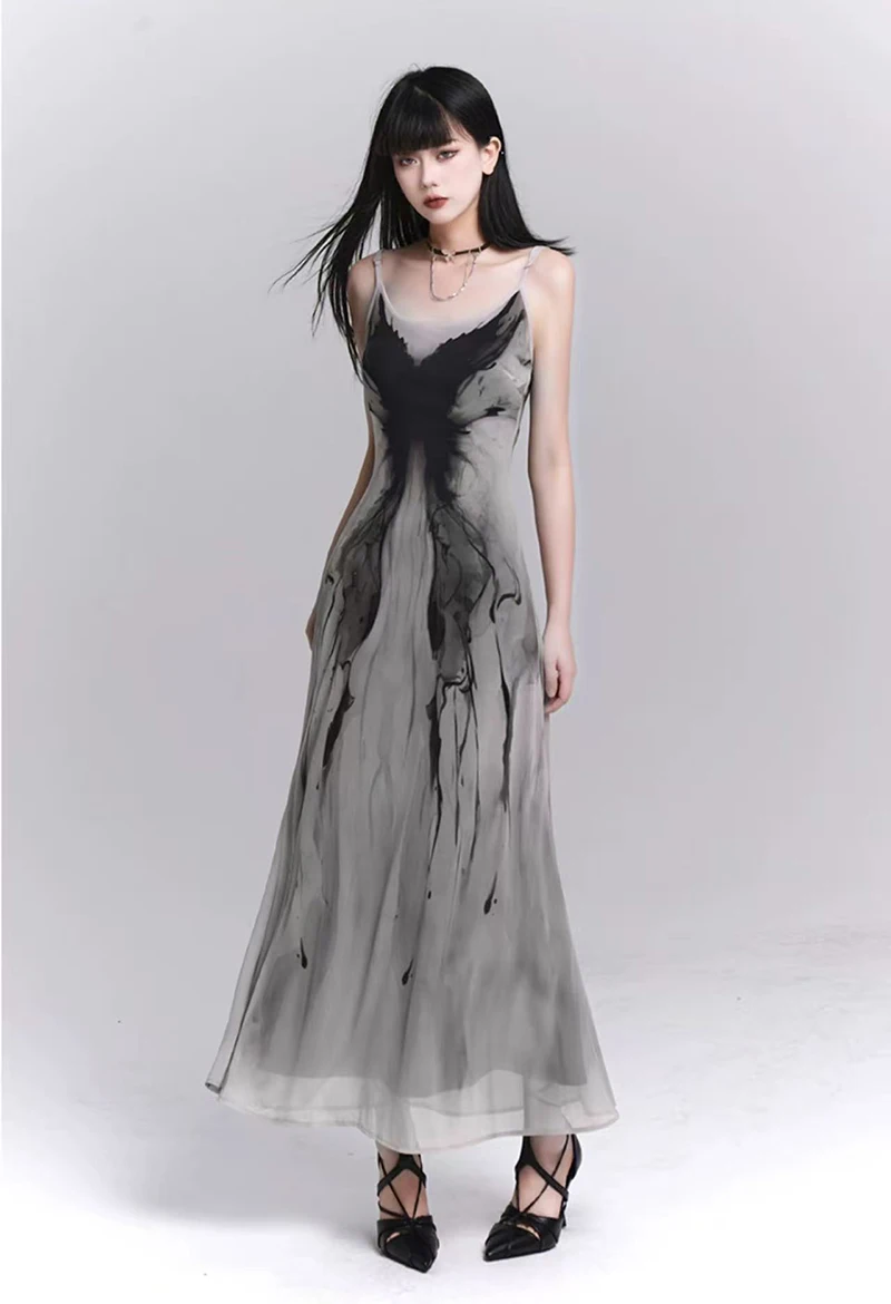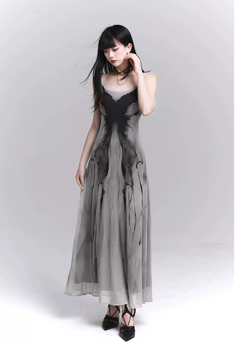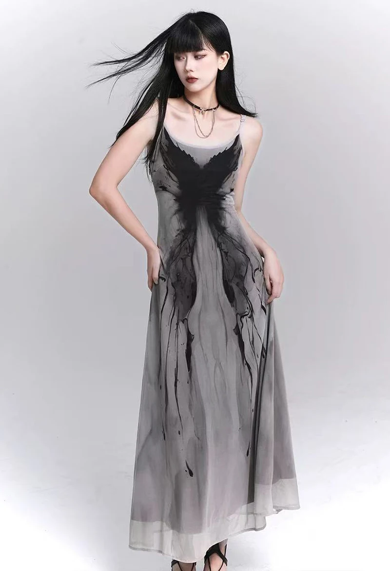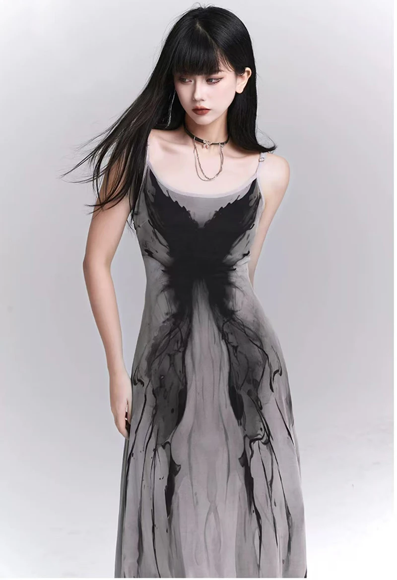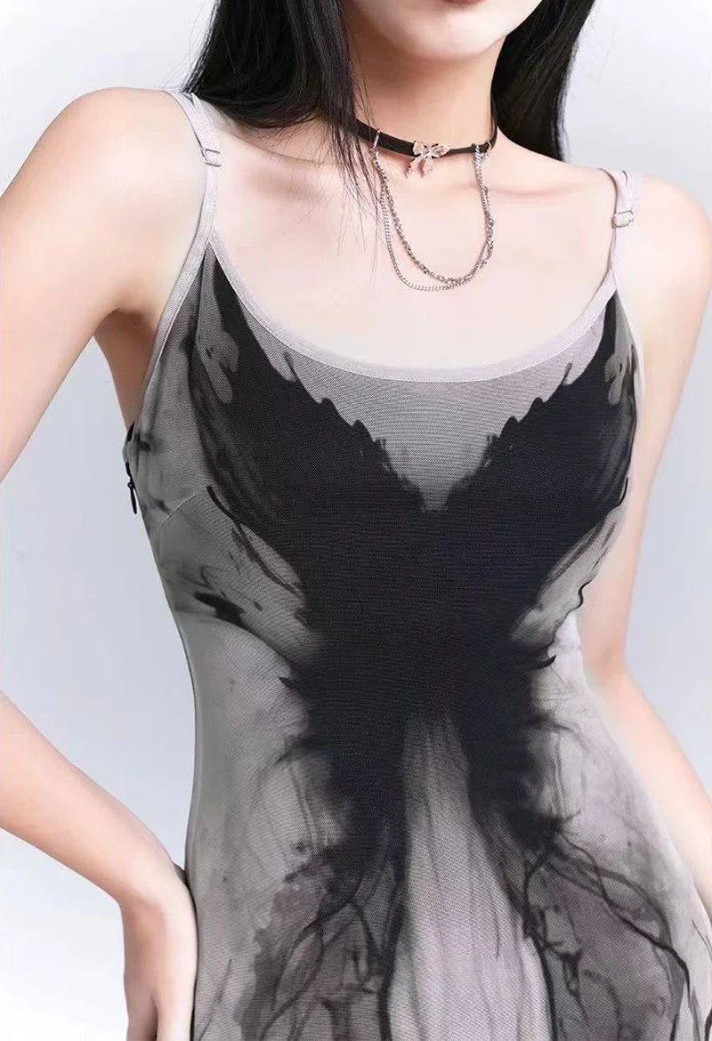 Bxoxo Retro Ink Butterfly Tie Dye Camis Dress Women Summer Slim Sleeveless Midi Dress Y2K Korean Sweet Mesh Spaghetti Straps Vestidos
