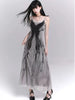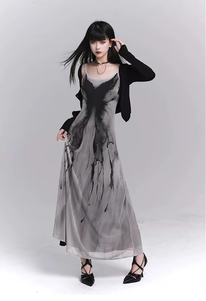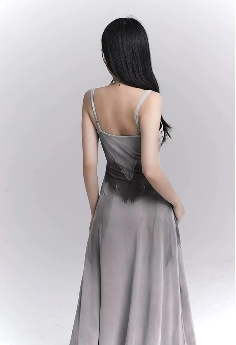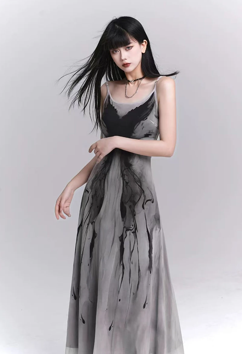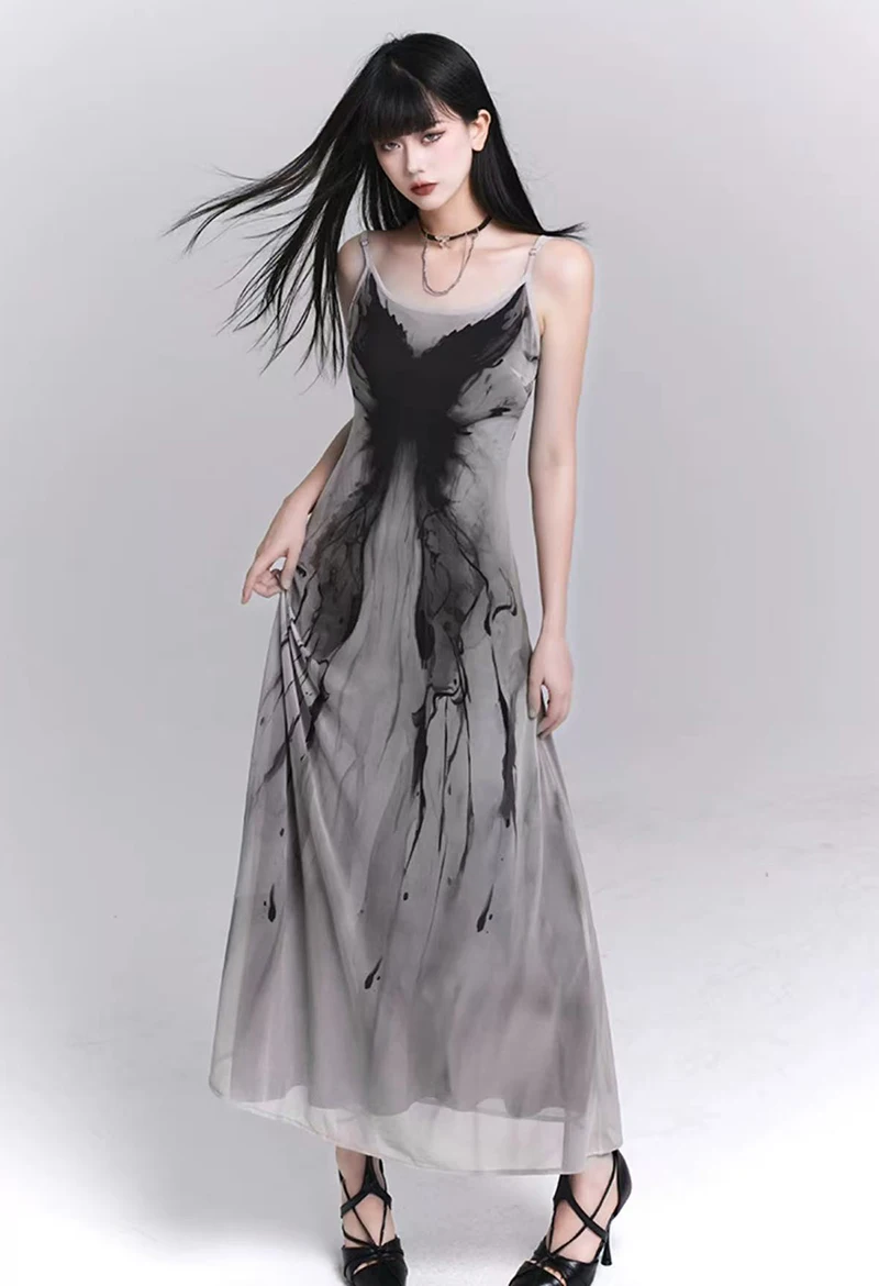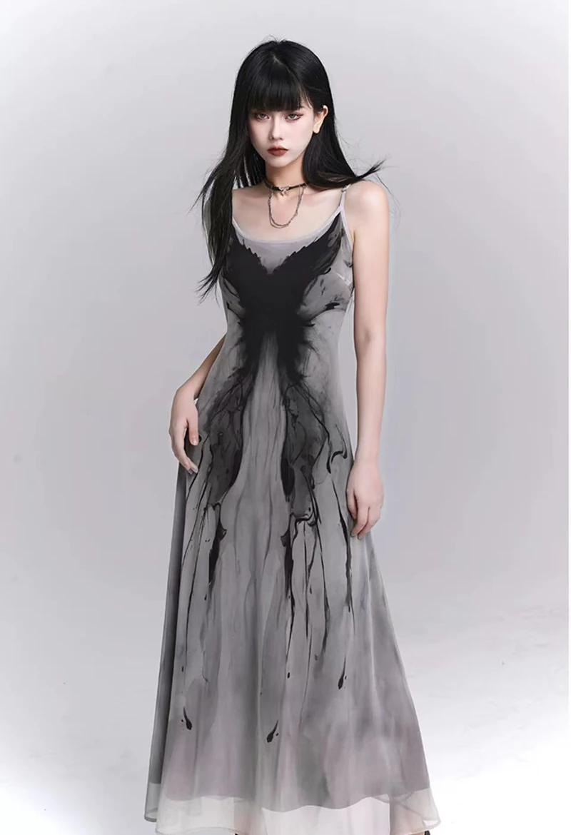 Bxoxo Retro Ink Butterfly Tie Dye Camis Dress Women Summer Slim Sleeveless Midi Dress Y2K Korean Sweet Mesh Spaghetti Straps Vestidos