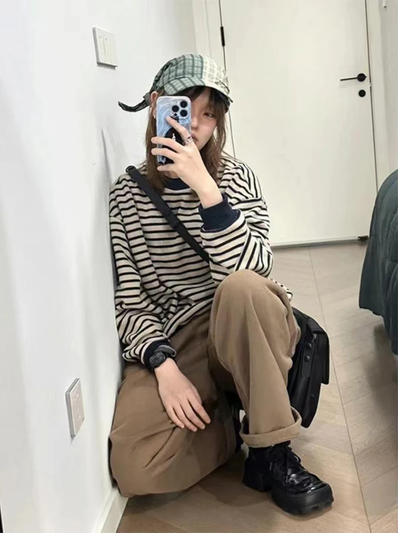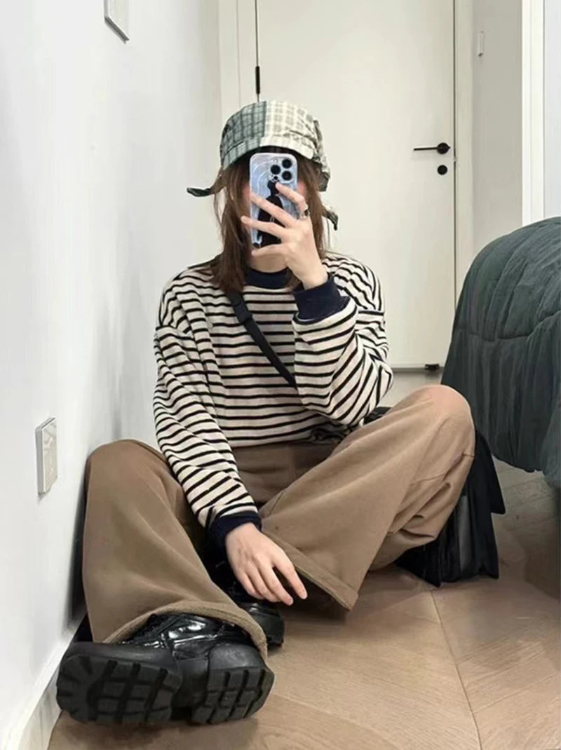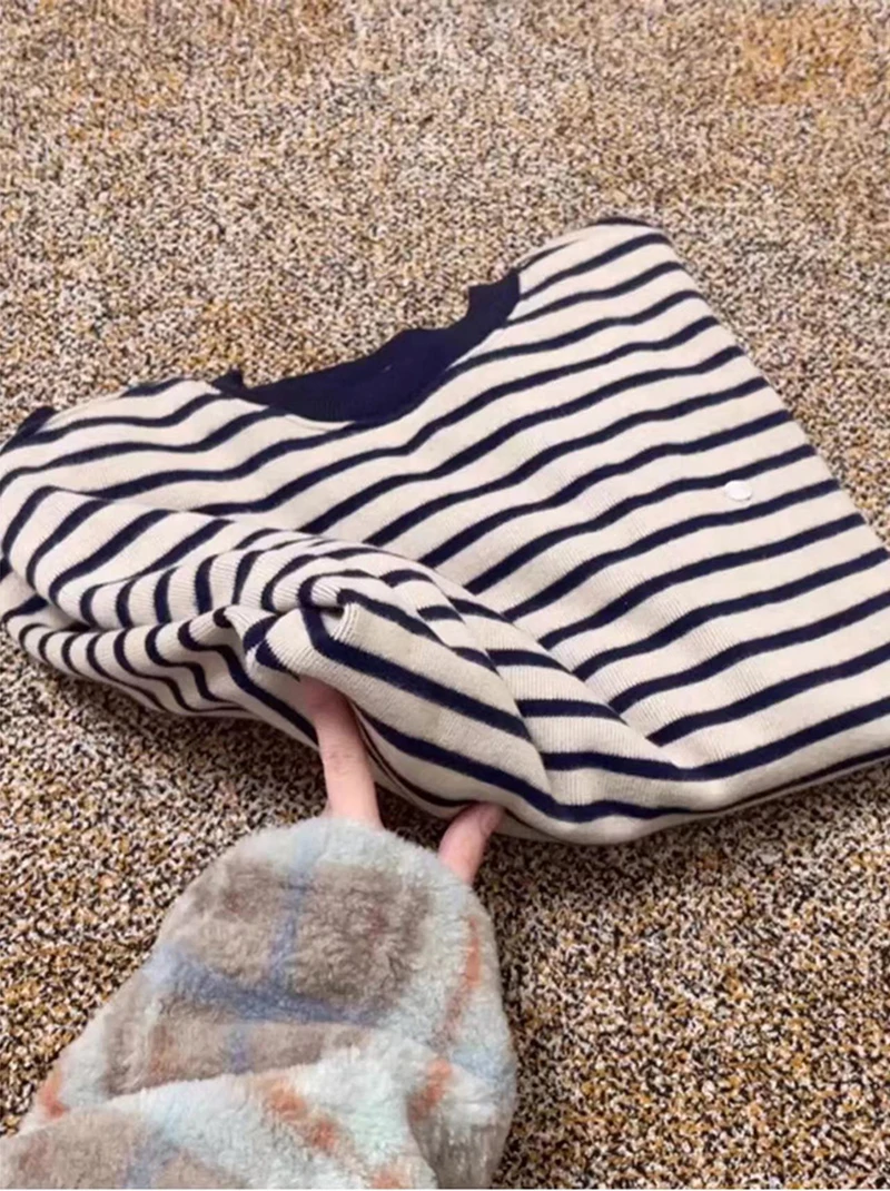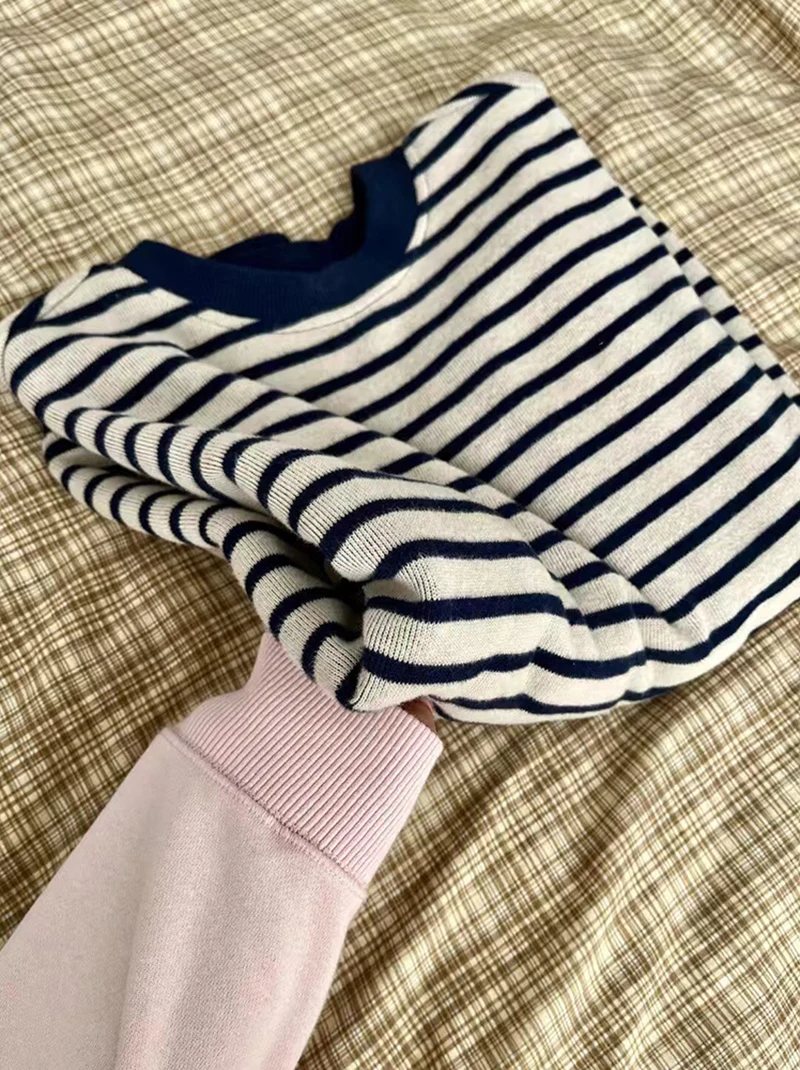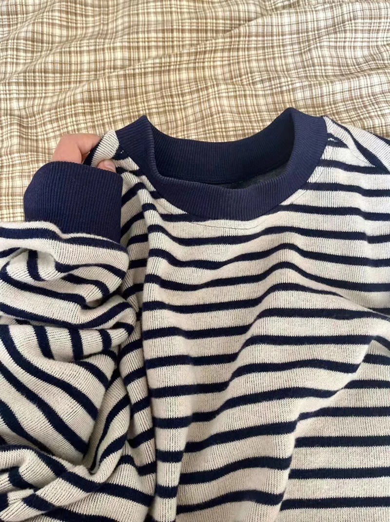 Bxoxo Retro Striped Sweatshirt Women Autumn Warm Long Sleeve O Neck Knitted Pullover Korean Loose All-Match Preppy Hoodie Female New