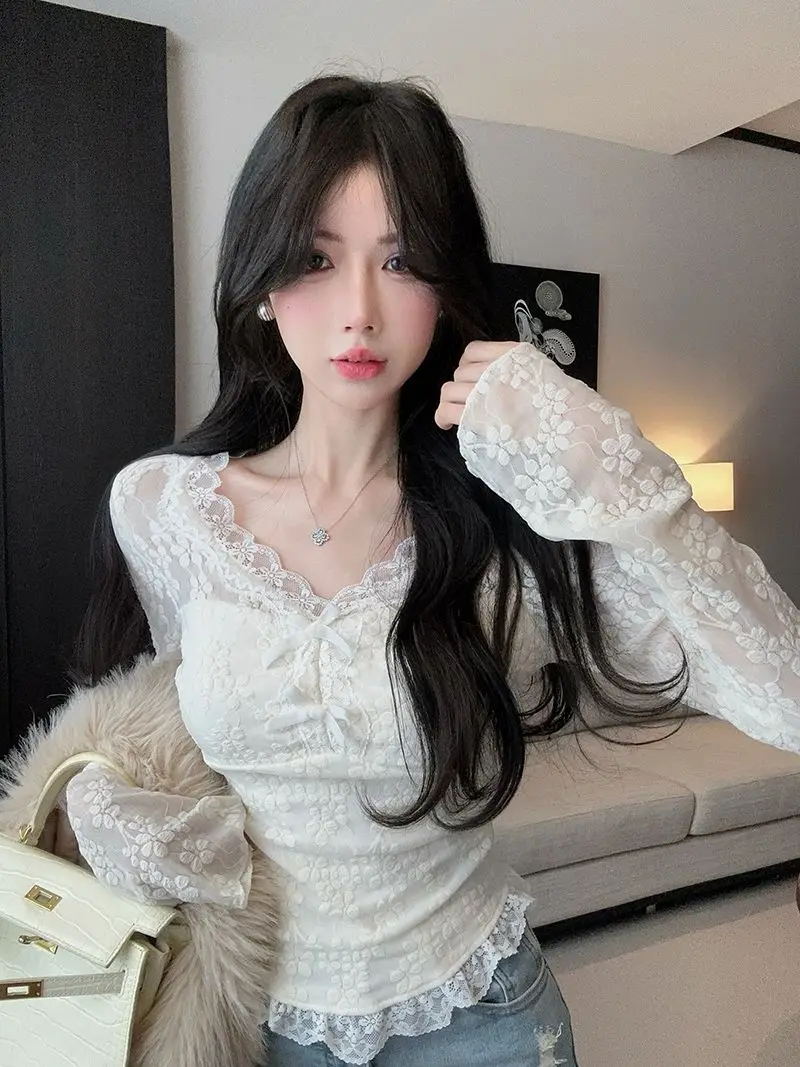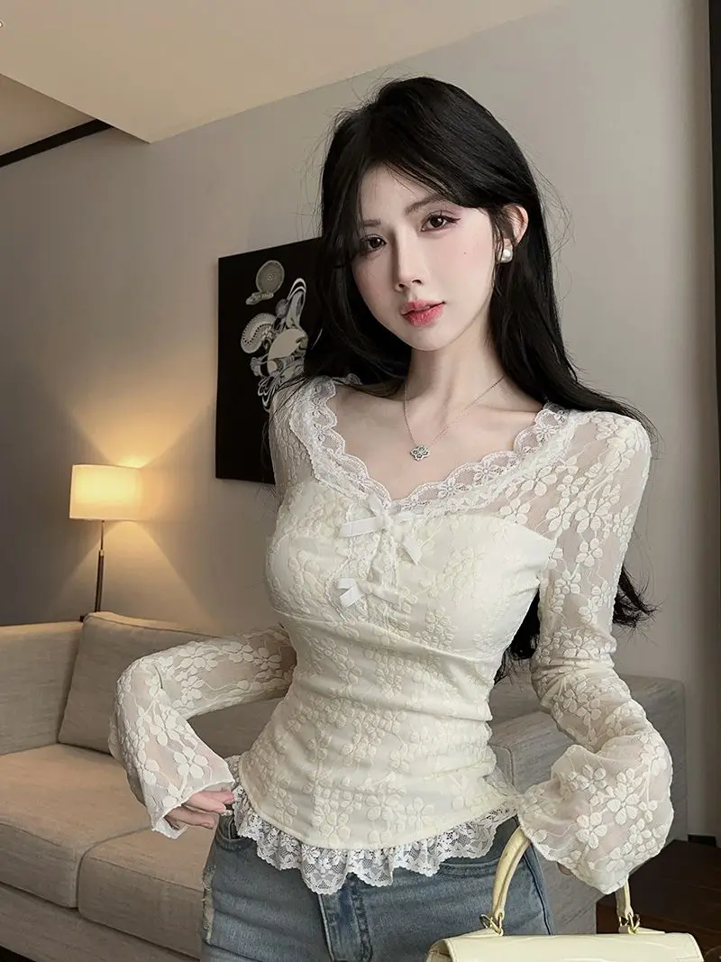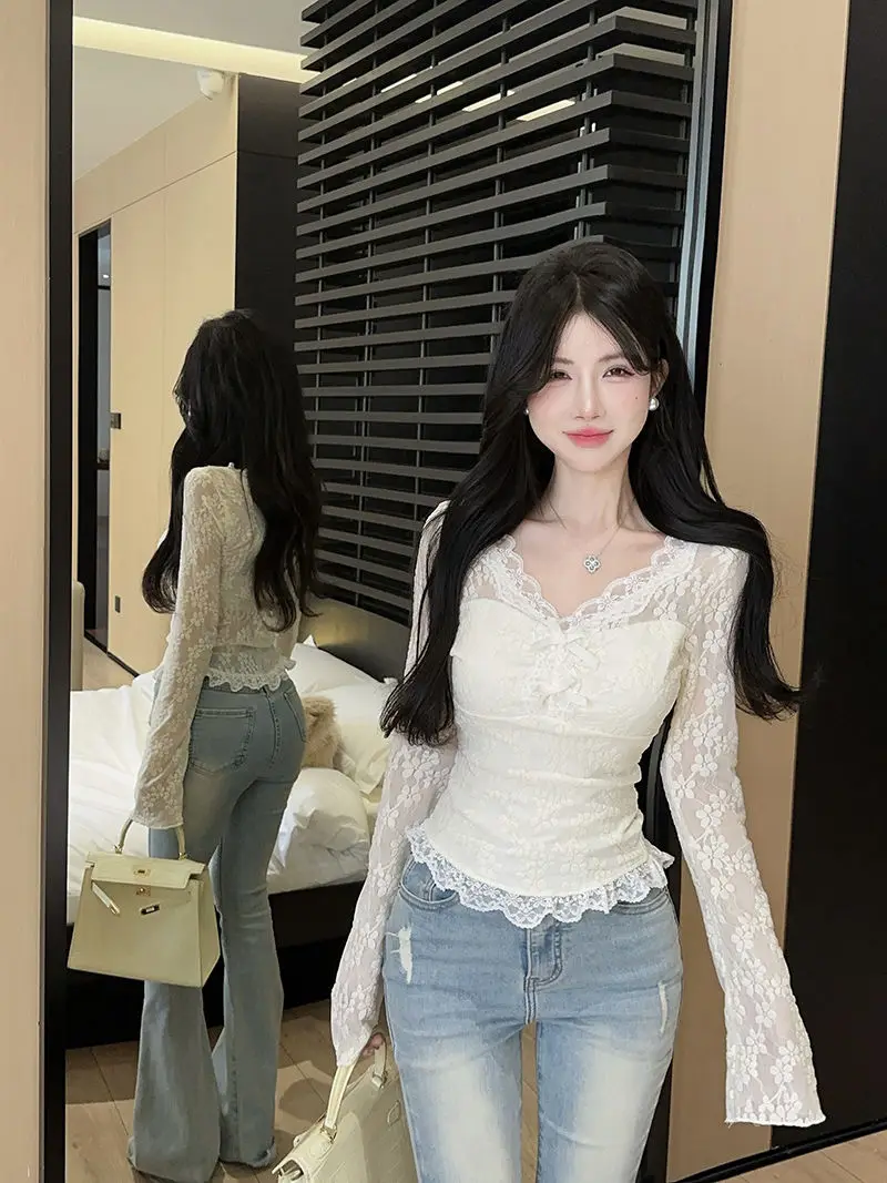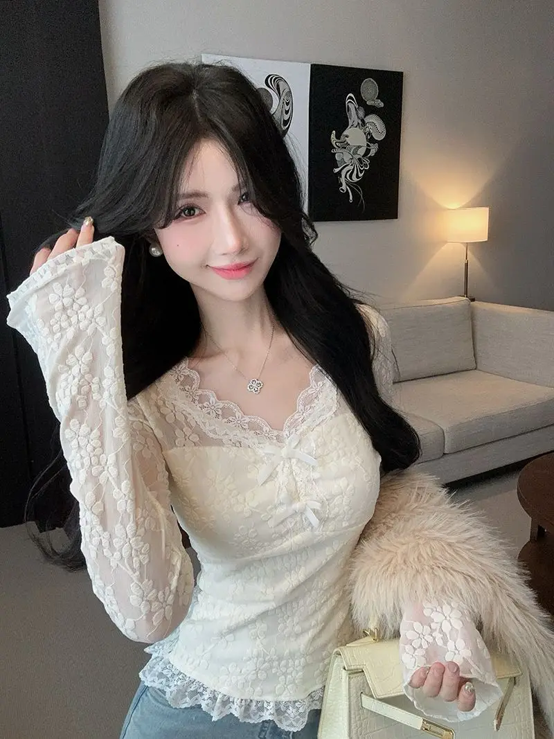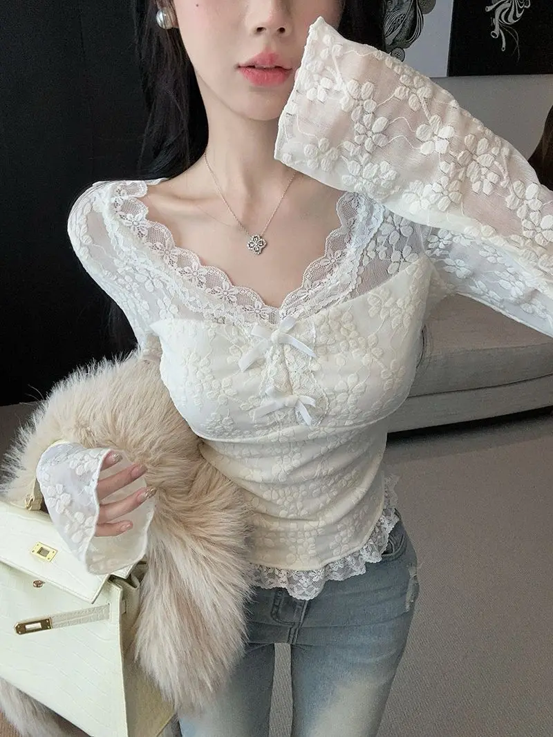 Bxoxo Sexy Lace Patchwork Women T Shirt Women Korean Chic V Neck Slim Cropped Tops Y2K Female Solid Sweet Bow Bottoming Tees