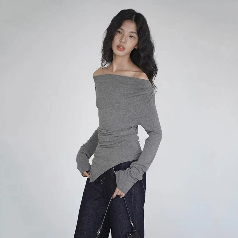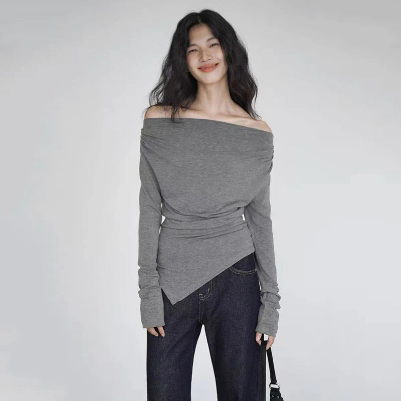 Bxoxo Sexy Slash Neck T Shirt Women Autumn Fashion Irregular Slim Long Sleeve Tops Y2K Korean Chic Folds All Match Female Tees New