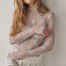 BXOXO Sheer Mesh Long Sleeve Layering Top for Women Mock Neck Floral Lace T shirt See Through Tee Shirt Blouse Summer Cover Up