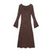 fashion outfits Early Autumn Brown Long-Sleeved Knitted Dress Women's Slim-Fit Draping Tight Waist A- line Midi Dress Retro Elegant Skirt