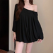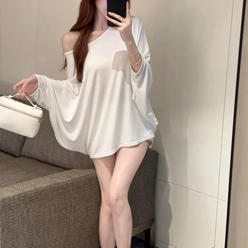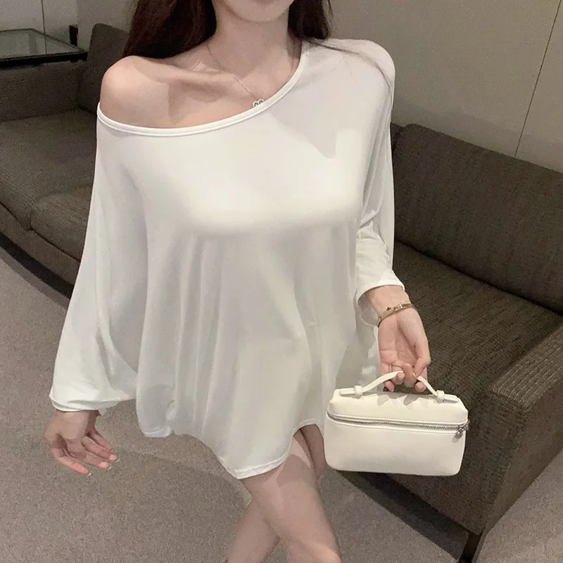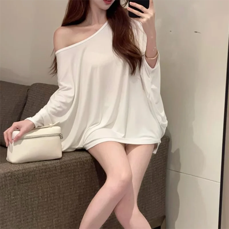 Bxoxo Solid Oversized T-shirt for Women's Casual Loose Top Fashion Bat Sleeves Simple Sexy Off Shoulder Korean Baggy T shirts Autumn
