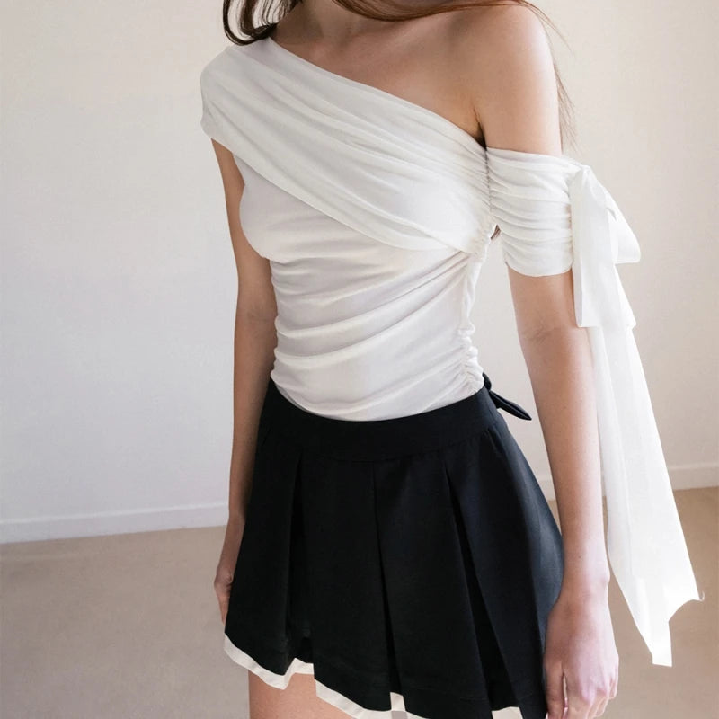 Bxoxo Solid Sexy Off Shoulder Casual Slash Neck Bow Pleated Slim Fit Crop Tops Y2K Spring Summer New Daily Cute Fashion Vest