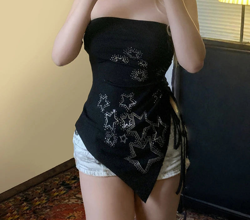 BXOXO Star-shaped Rhinestone Slit Crop Top Asymmetric Drawstring Lace-up Strapless Tube Tops for Women y2k Aesthetic Summer Tee