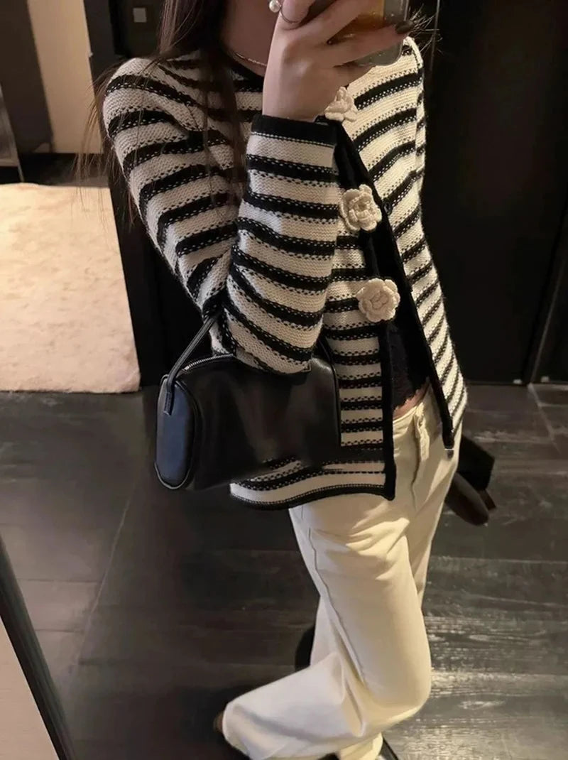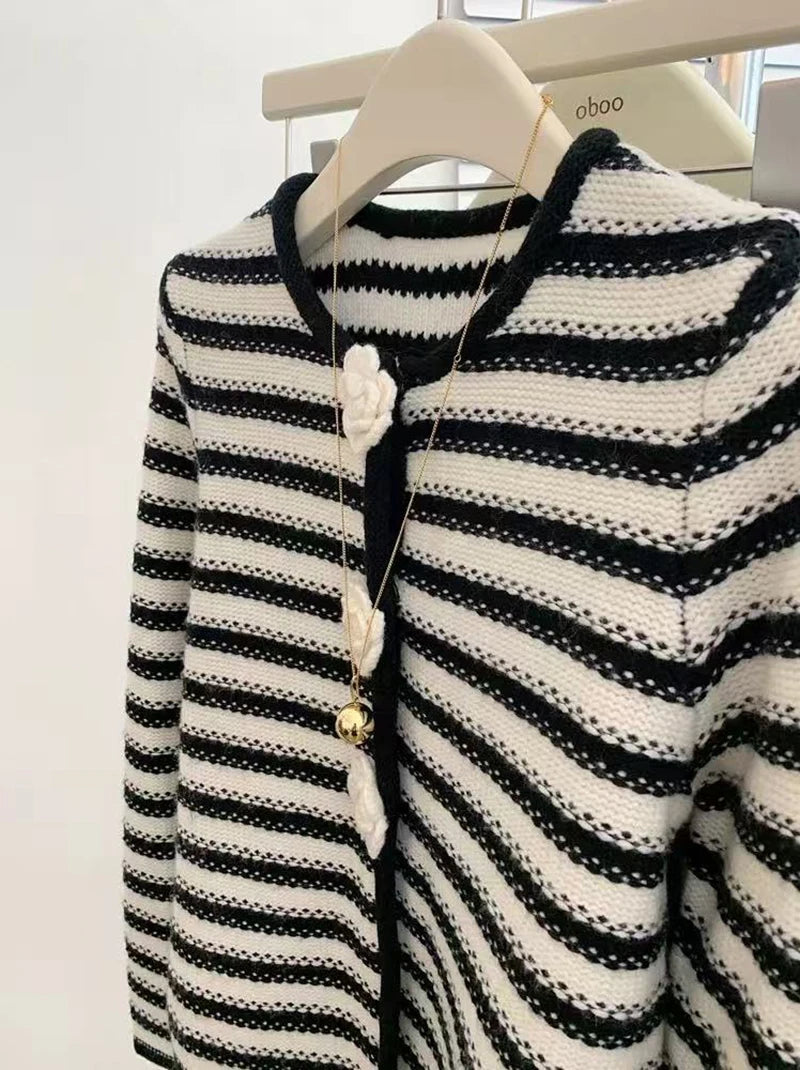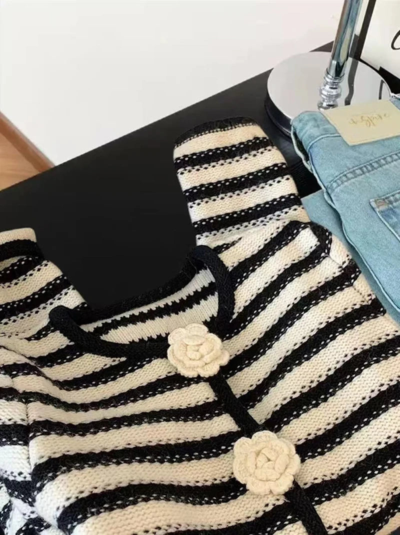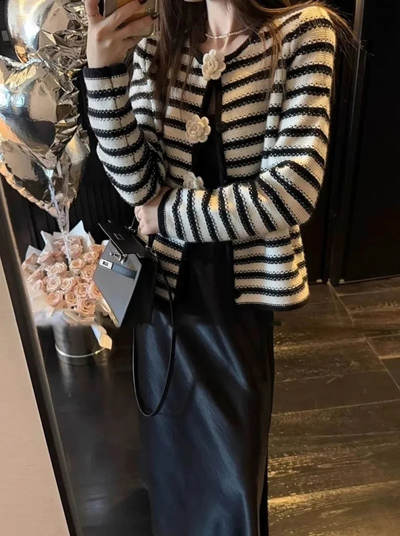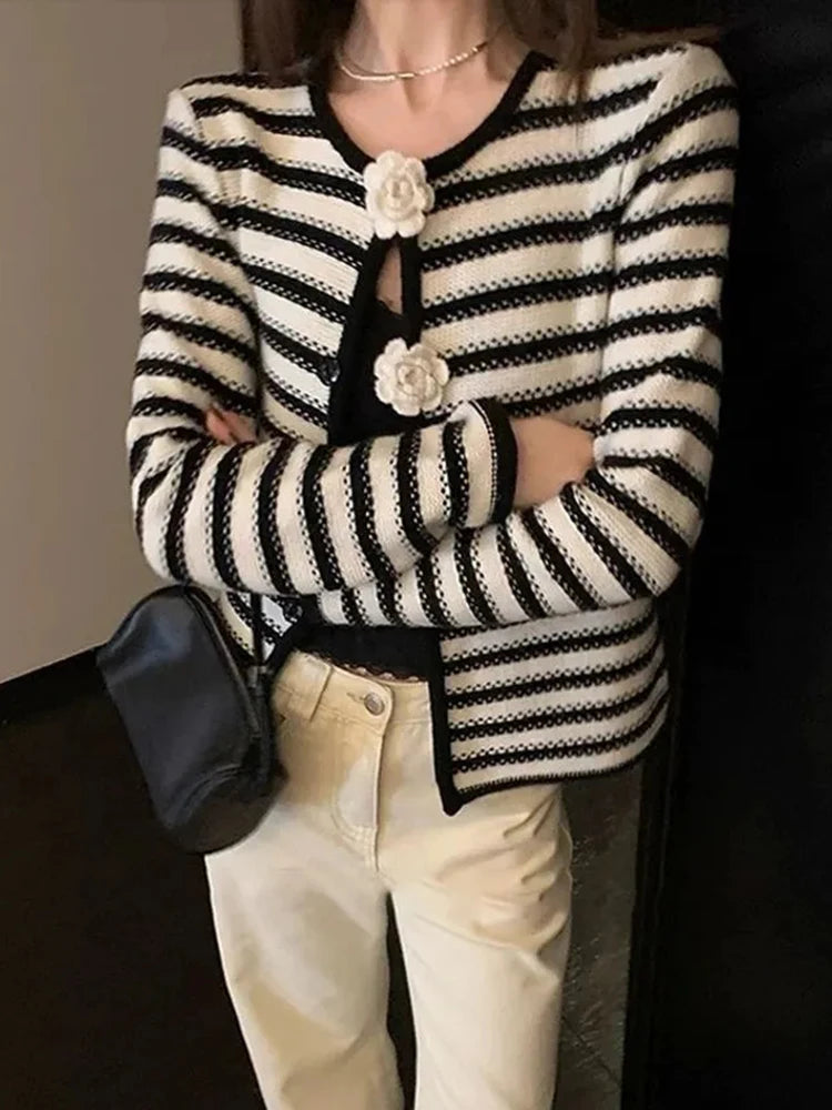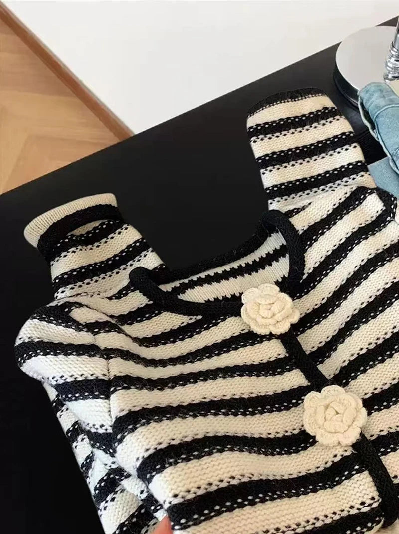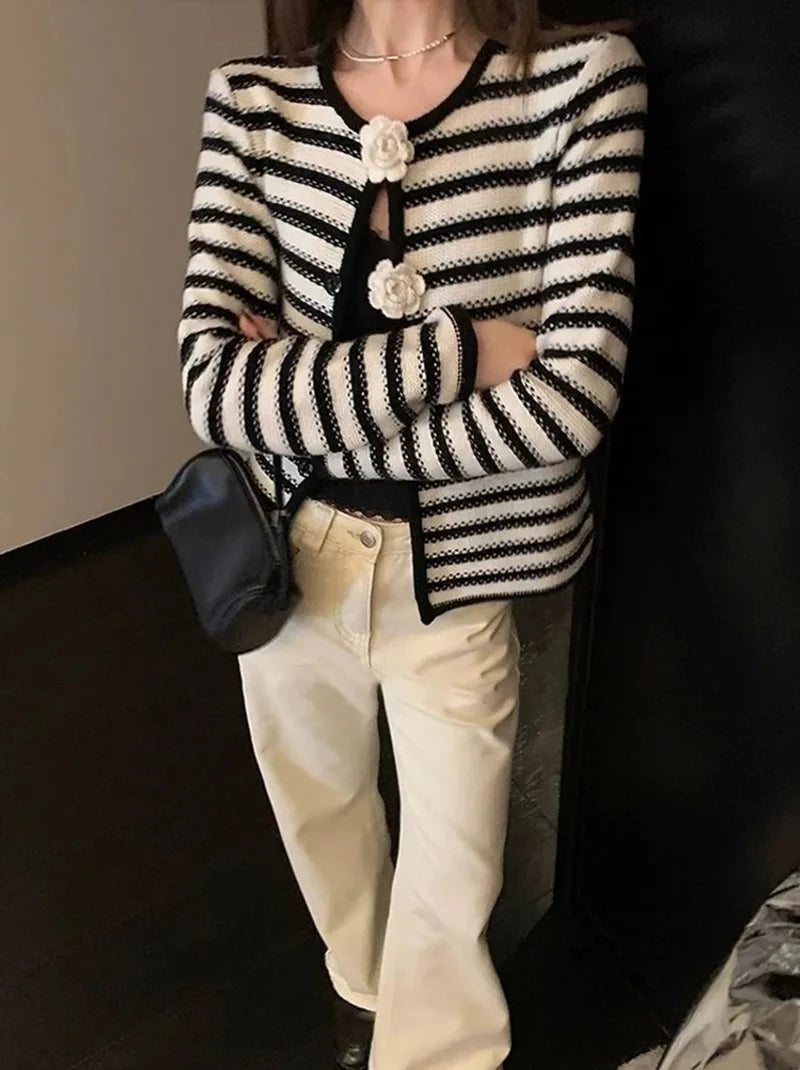 Bxoxo Stripe Knit Cardigan for Women Autumn Fashion 3D Flower Long Sleeve Female Knitwear Korean Elegant Slim All Match Button Coats