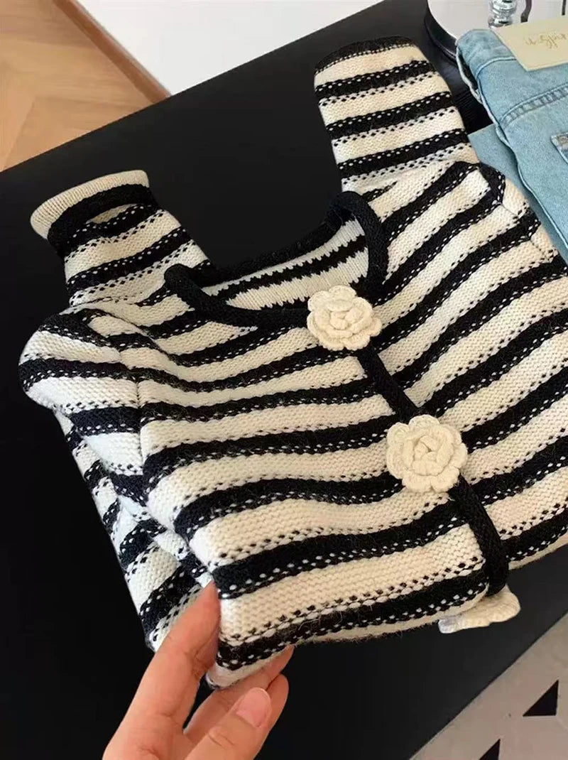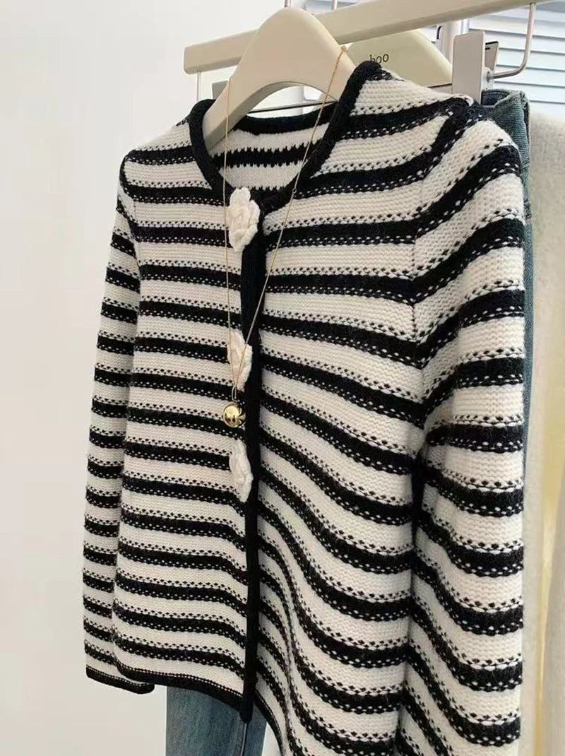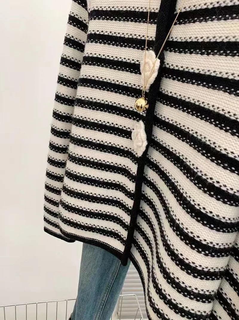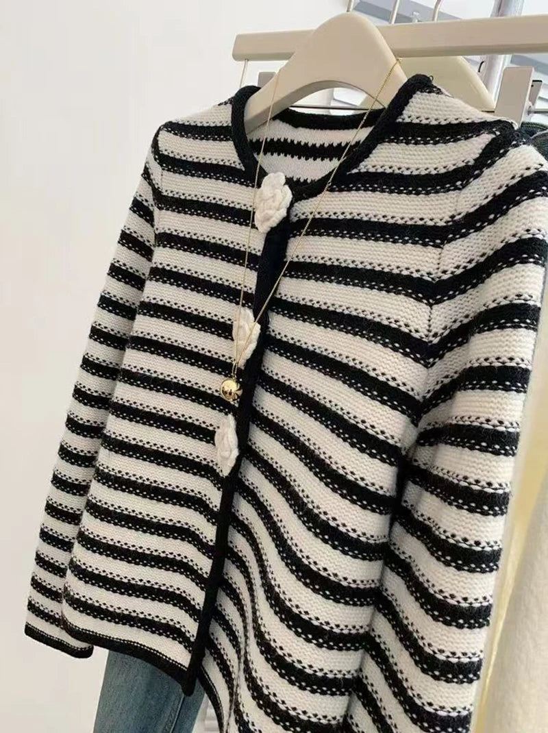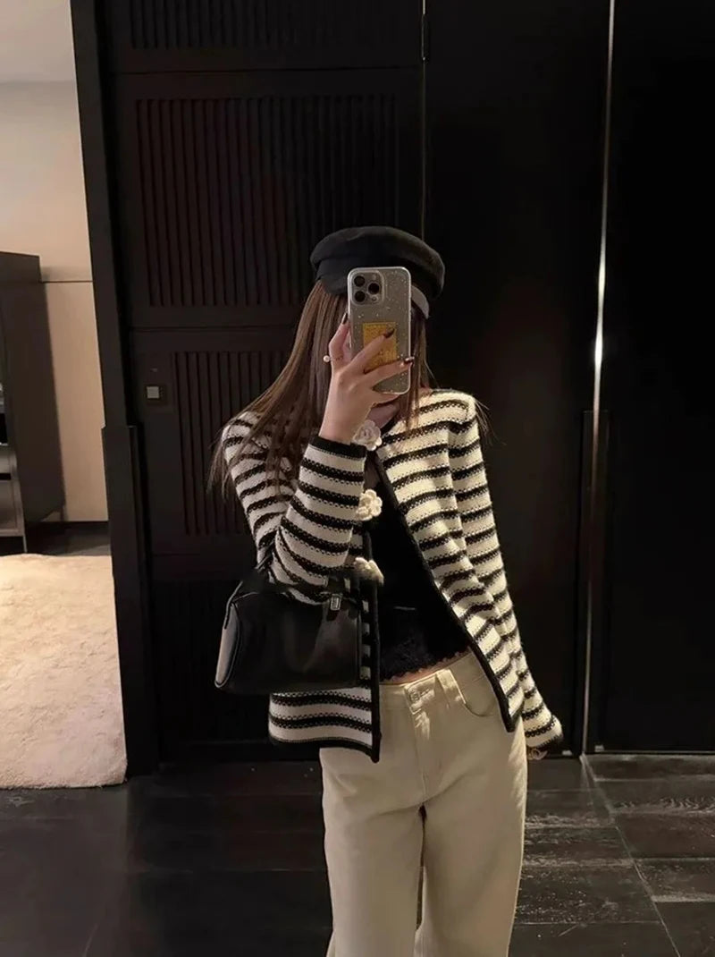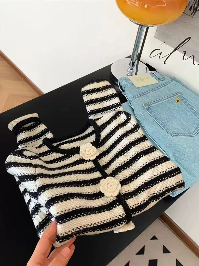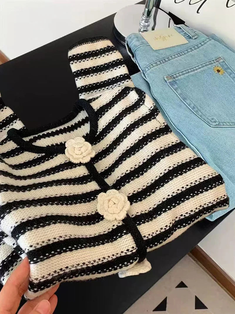 Bxoxo Stripe Knit Cardigan for Women Autumn Fashion 3D Flower Long Sleeve Female Knitwear Korean Elegant Slim All Match Button Coats