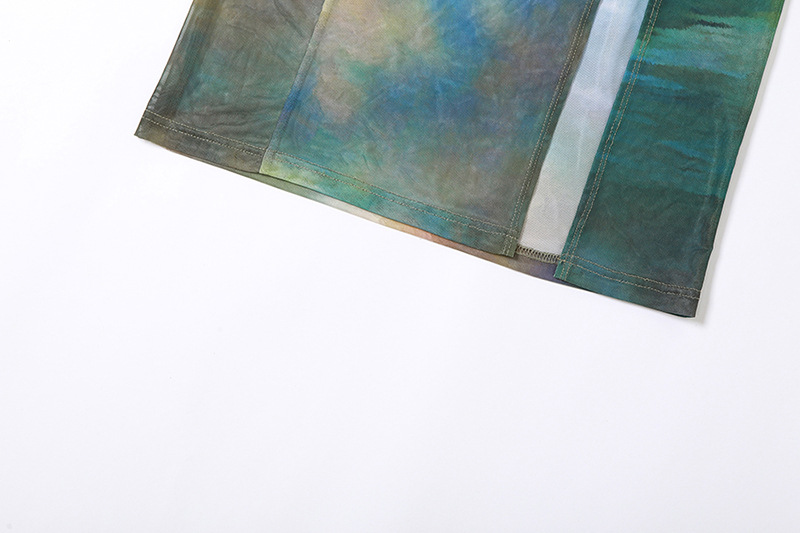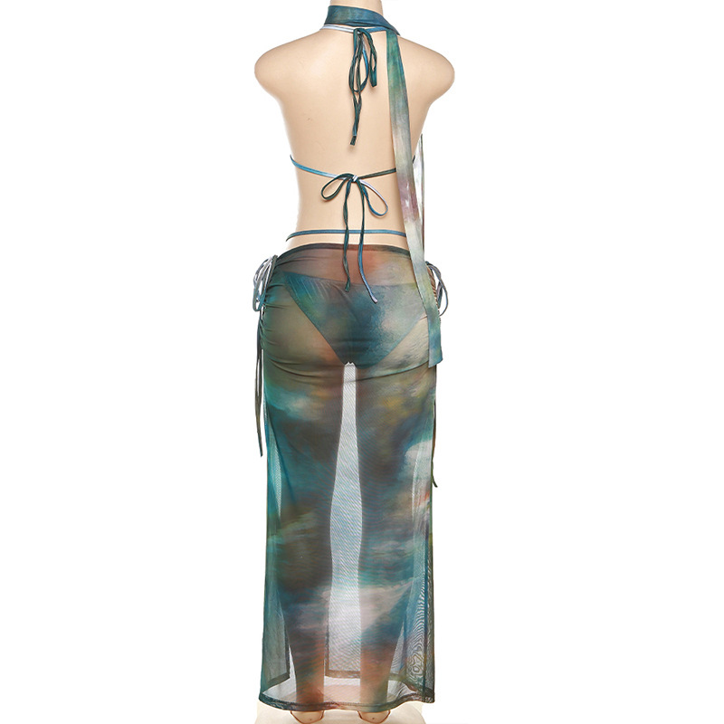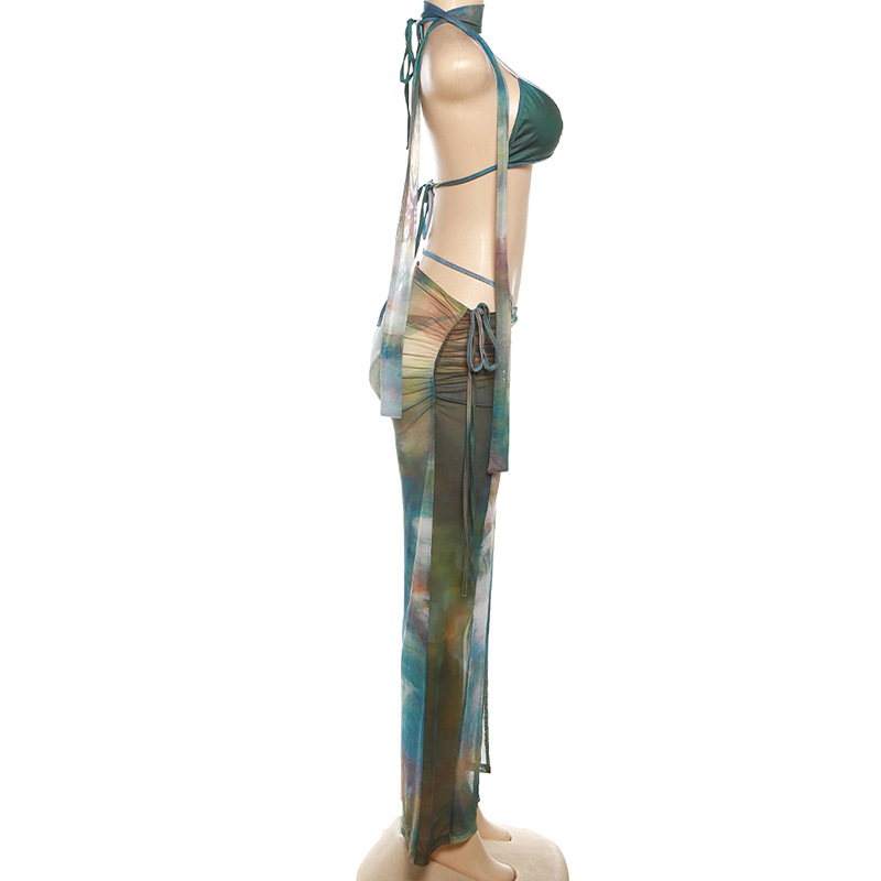 BXOXO Summer Fashiontie Tie-dye Printed Long Dresses Bikini Set Beach Wear Bra Briefs Scard with Long Slit Skirt Bathing Suit Swimsuit