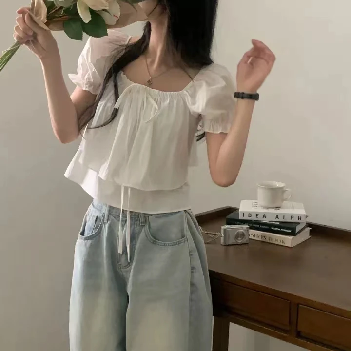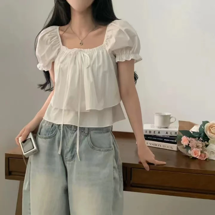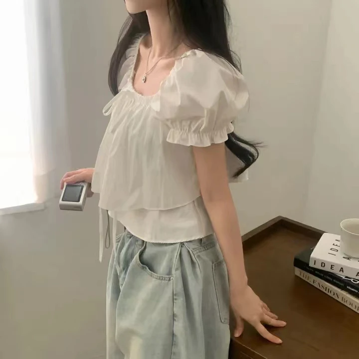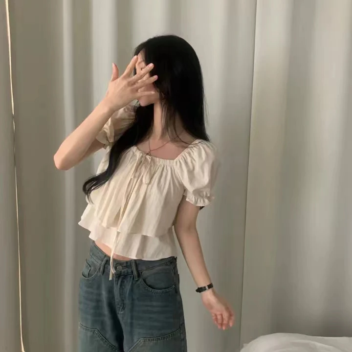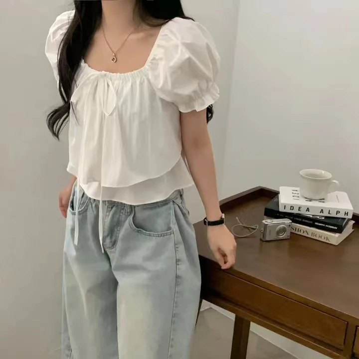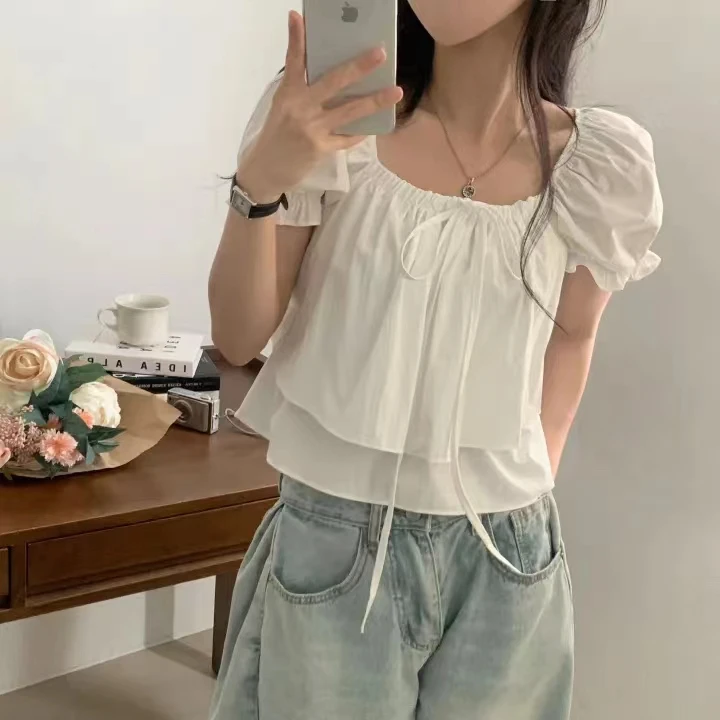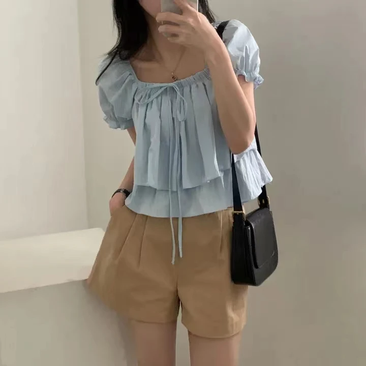 Bxoxo Summer New Sle Double Layered Chiffon irt with Bow Tie Bubble Sve Square Collar ort Sve Women's Faion Top